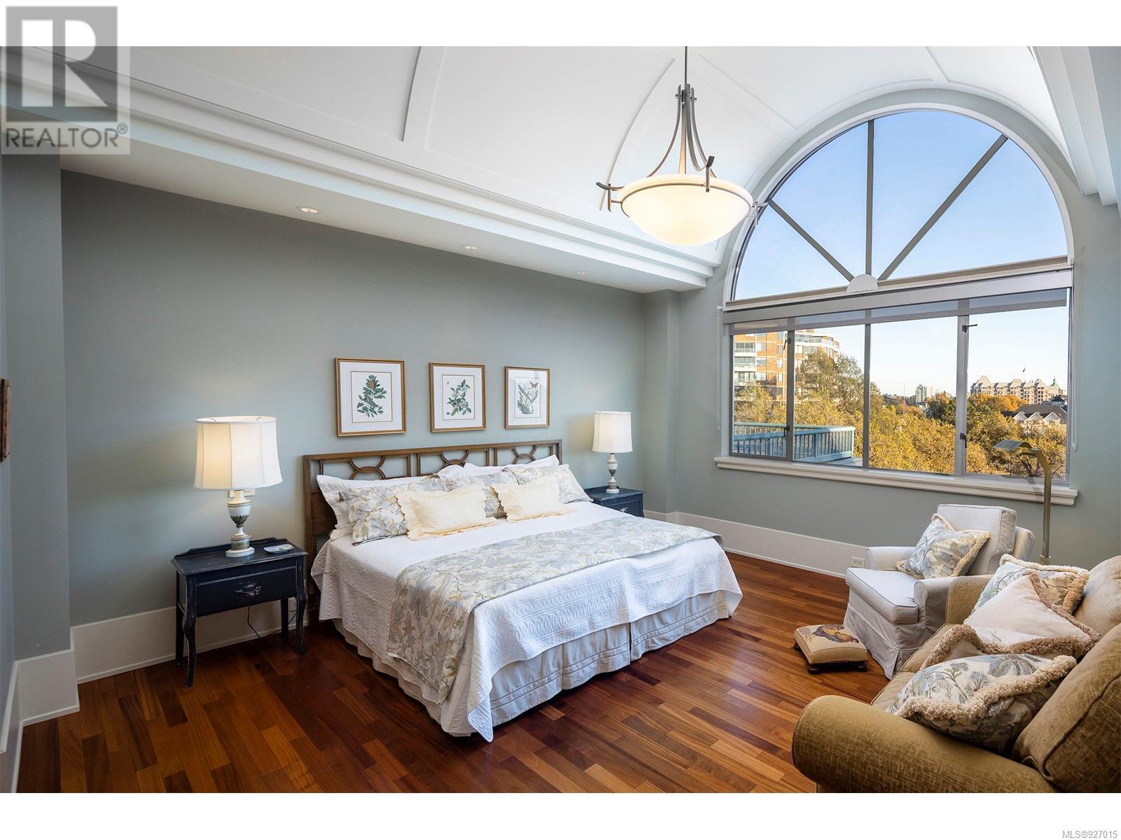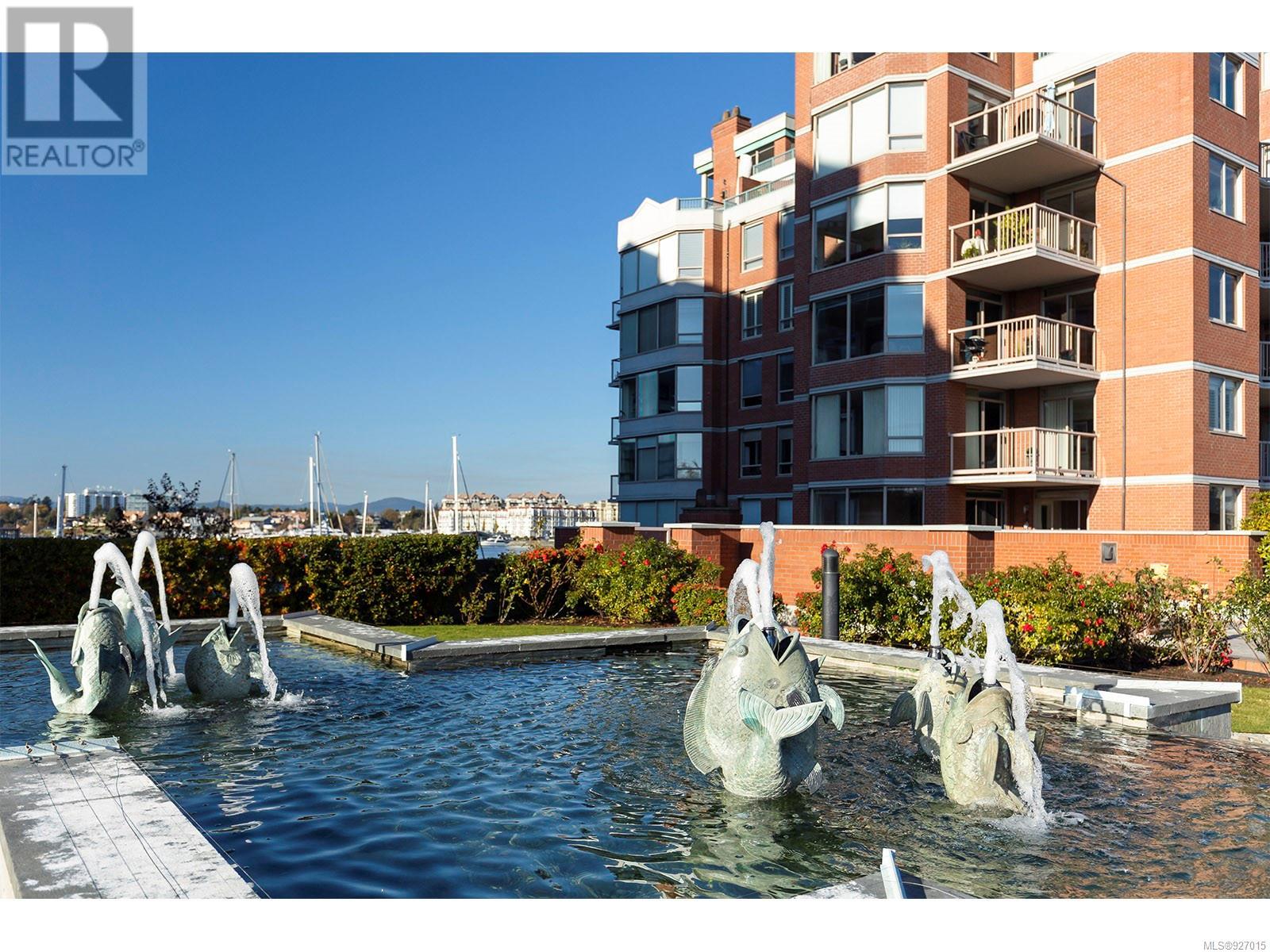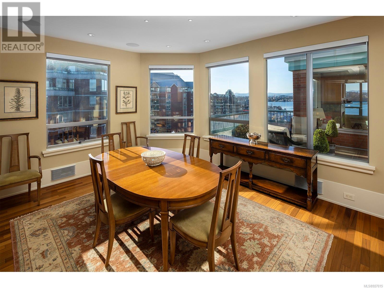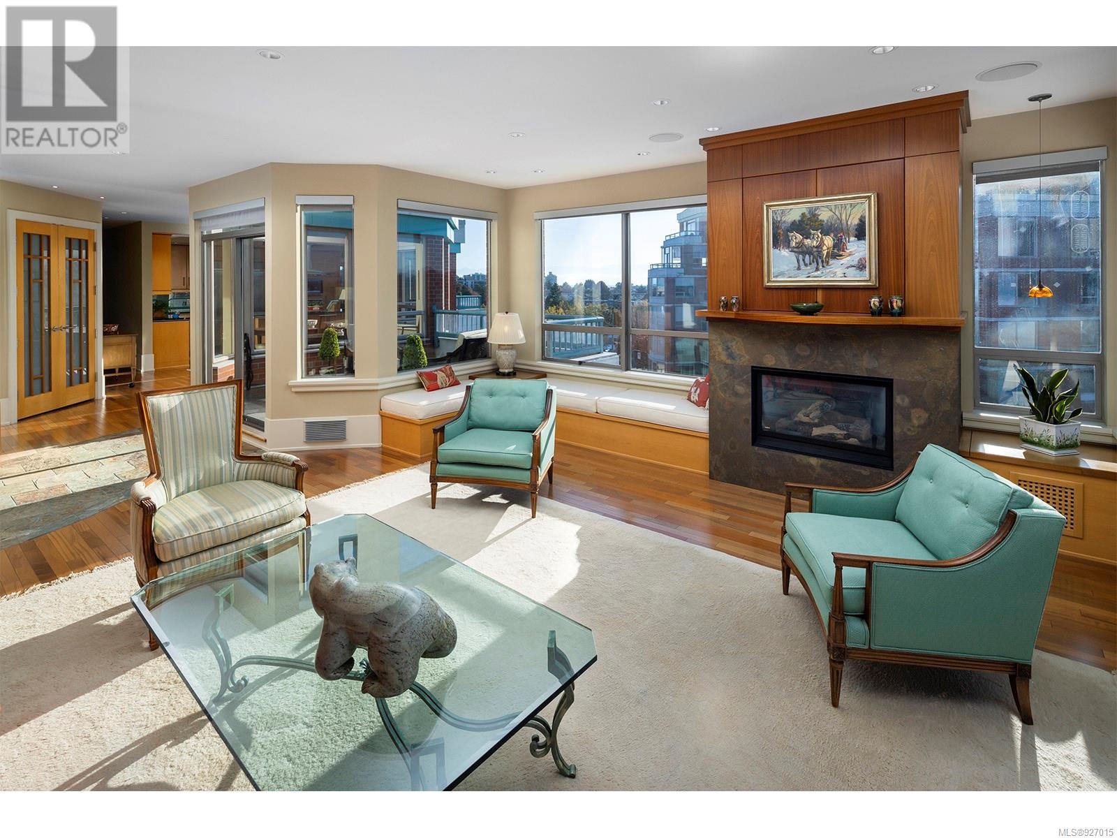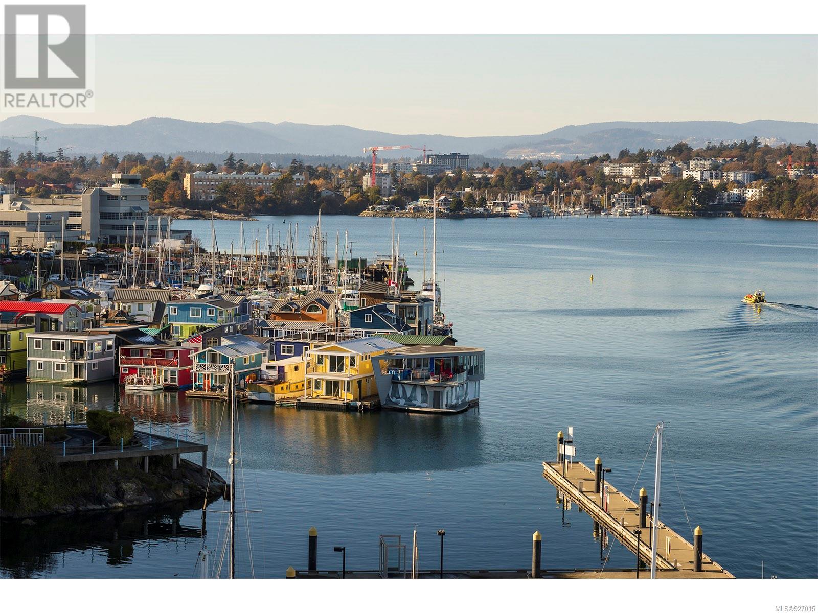 Timeless elegance on Victoria’s famed Inner Harbour. This rare waterfront penthouse condominium with incredible ocean views offers 2 bedrooms plus a den, 3 bathrooms and over 3000 square feet of indoor and outdoor living space. The open concept kitchen with custom artisanal glass slab countertops is a chef’s dream with Wolfe stovetop, oven and warming drawer, Bosch dishwasher and KitchenAid fridge. An abundance of millwork and custom cabinetry, solid wood Craftsman inspired doors, sapele mahogany flooring and heated natural stone floors in the bathrooms add to the overall aesthetic of this exquisite home. Relax in your spacious primary suite with its stunning 14’ barrel ceiling or enjoy al fresco dining on one of your 4 private patios. Steel and concrete building, 2 parking stalls and well-run strata. Ideal location is an easy stroll to shops, parks, groceries, restaurants and downtown Victoria. (id:22211)