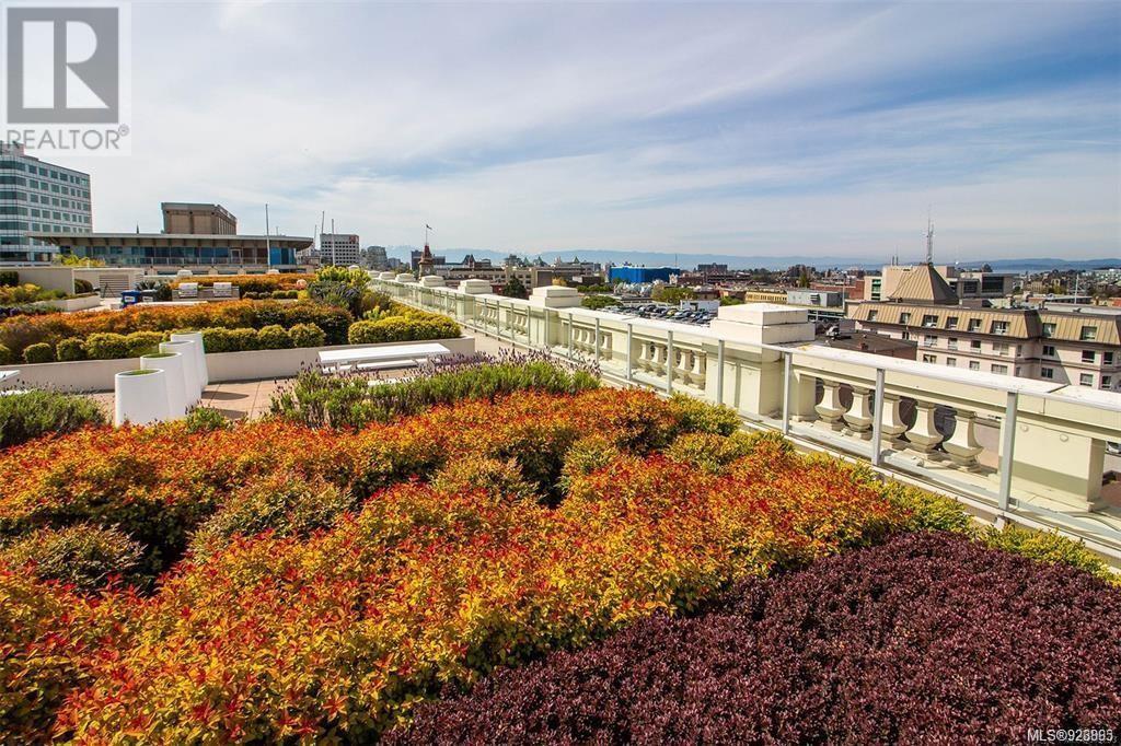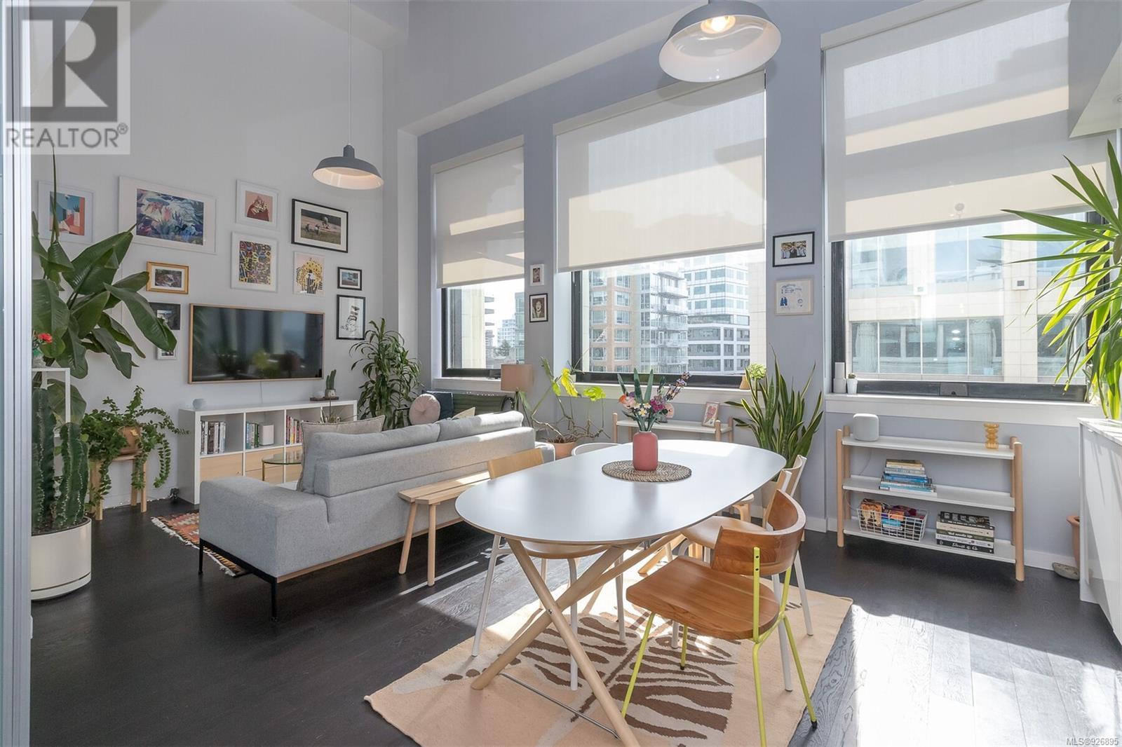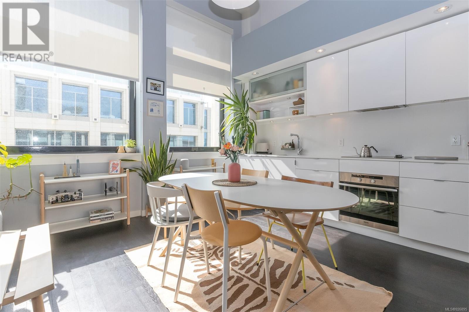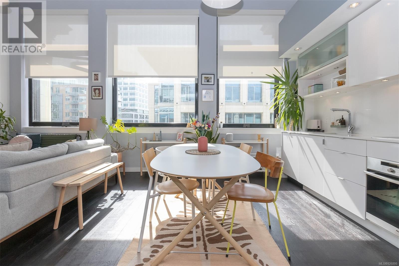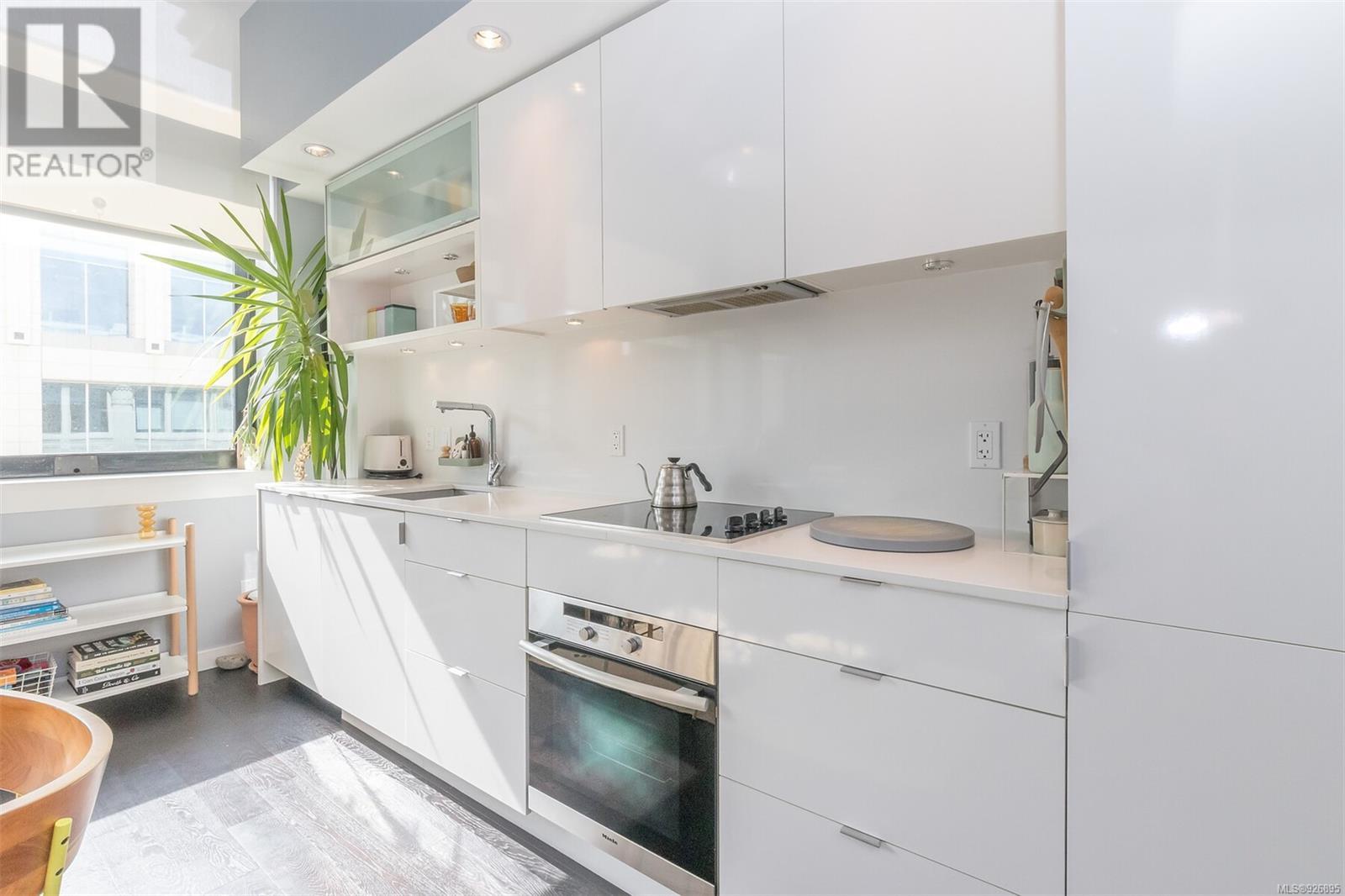 Stunning 2 bedroom/2 bathroom 991 sqft loft home in the iconic Hudson building, a comprehensive transformation of the historic Hudson Bay building in Victoria into modern urban residences. This intelligently designed modern home with 17ft ceiling height boasts geothermal heating & cooling, oversized windows framing the skyline of Victoria, luxurious master loft bedroom suite with radiant in-floor heating. Sleek kitchen cabinetry with top quality Miele appliances, full height pantry storage and insuite washer & dryer. Stunning 14,000 sqft roof top patio with views of city, inner harbour & ocean as well as a common BBQ area for large or intimate gatherings. Secure underground parking stall and storage included as well as pets allowed. Enjoy nearby entertainment, dining and the convenience of downtown living. This elegant and spacious home is not to be missed! (id:22211)