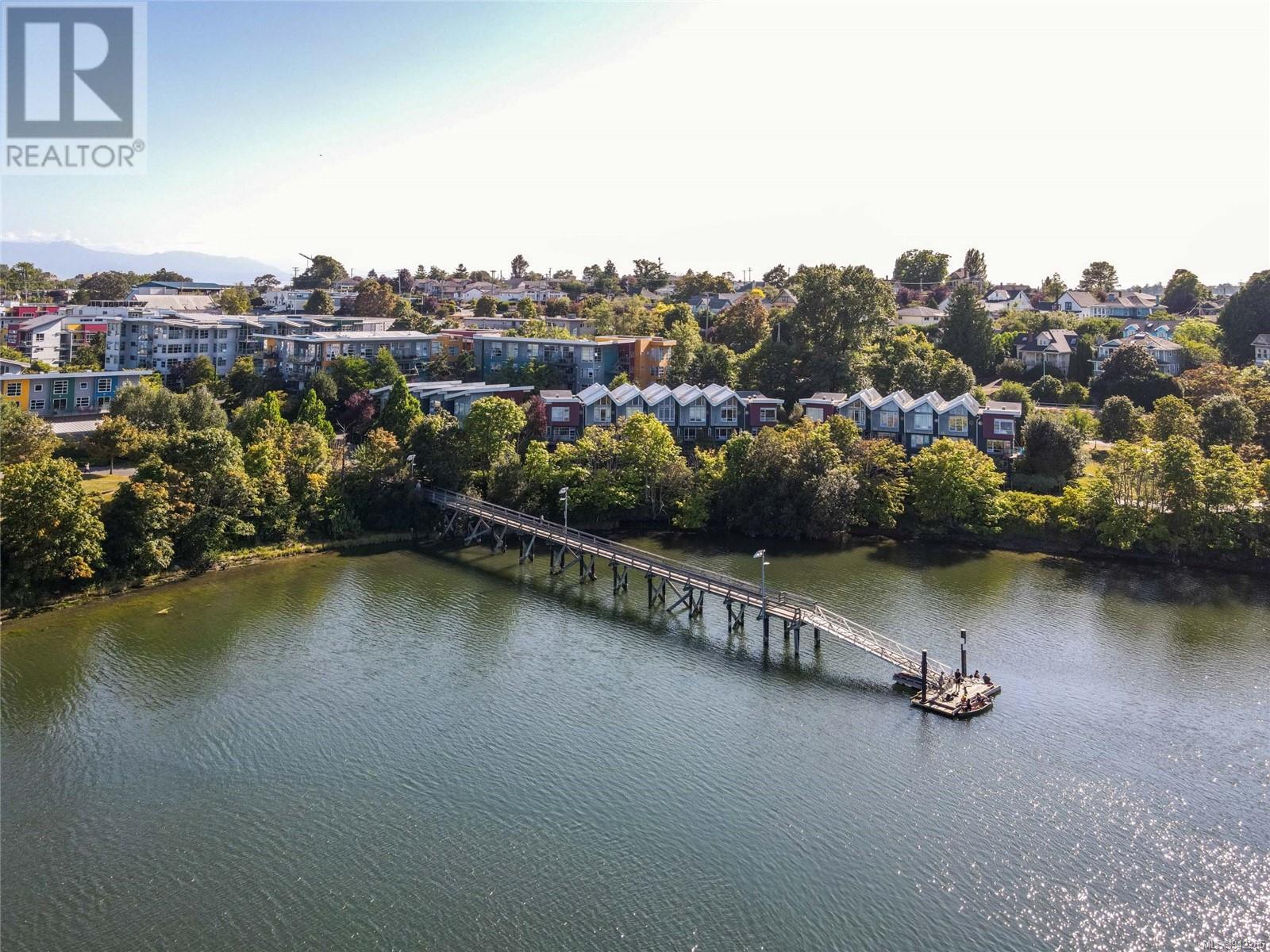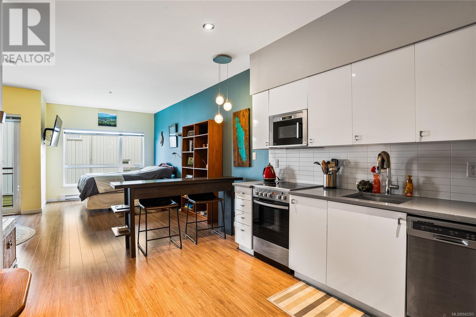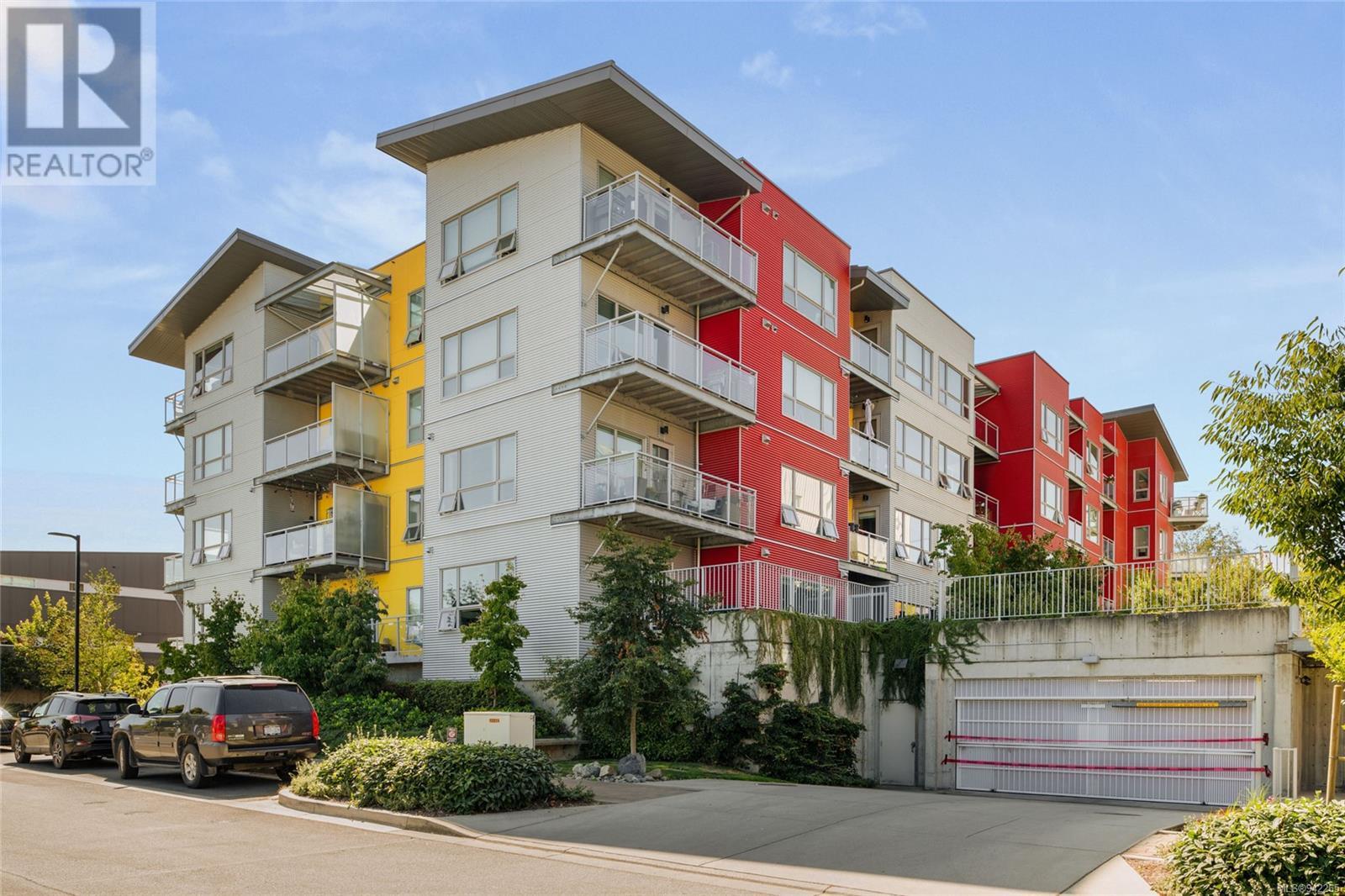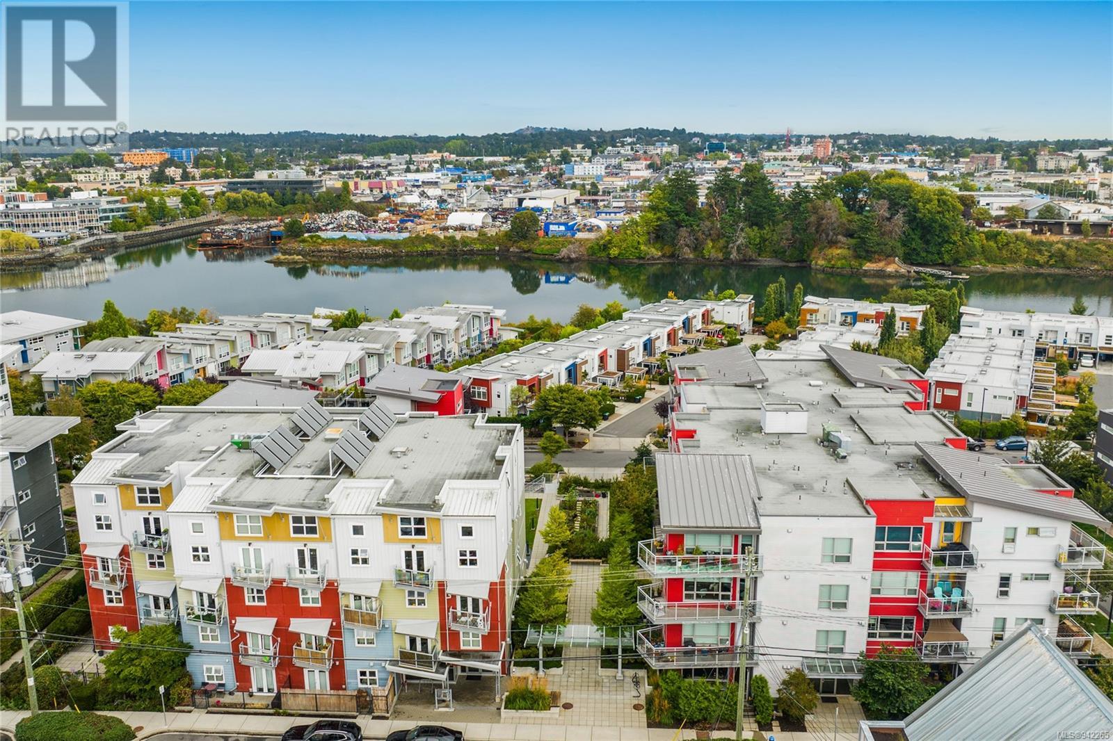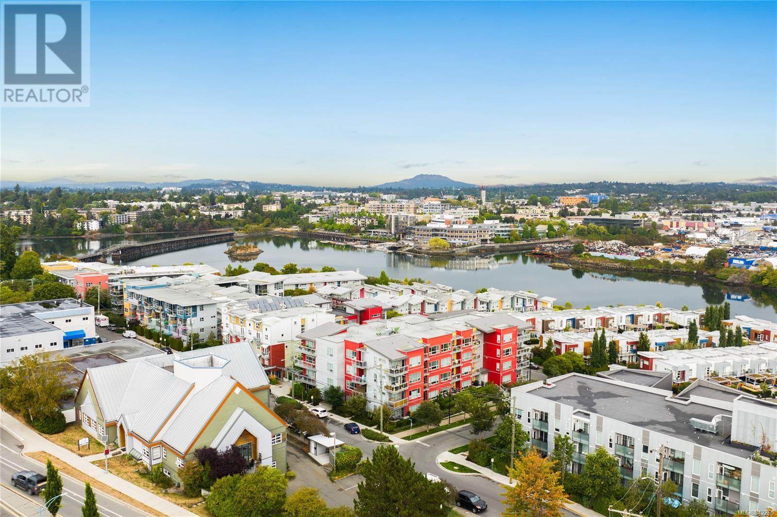 Welcome to the Railyards! Pleased to offer this immaculate top floor studio unit in the modern Bond's Landing 3. This bright, well laid out condo features quartz counters, heated bathroom flooring, high gloss white cabinetry, and like new stainless steel appliances. Overlooking the common courtyard and garden space, you will enjoy the evening sunsets from your private balcony. Located just steps from the water and just minutes from downtown, bakeries, local coffee shops and restaurants, you can enjoy launching your kayak from the dock or biking to work on the Galloping Goose Trail. This pet friendly rentable unit comes with a secure underground parking stall, storage unit, and the remaining new home warranty. Do not miss your chance to live in one of Victoria's most desirable waterfront communities! (id:22211)