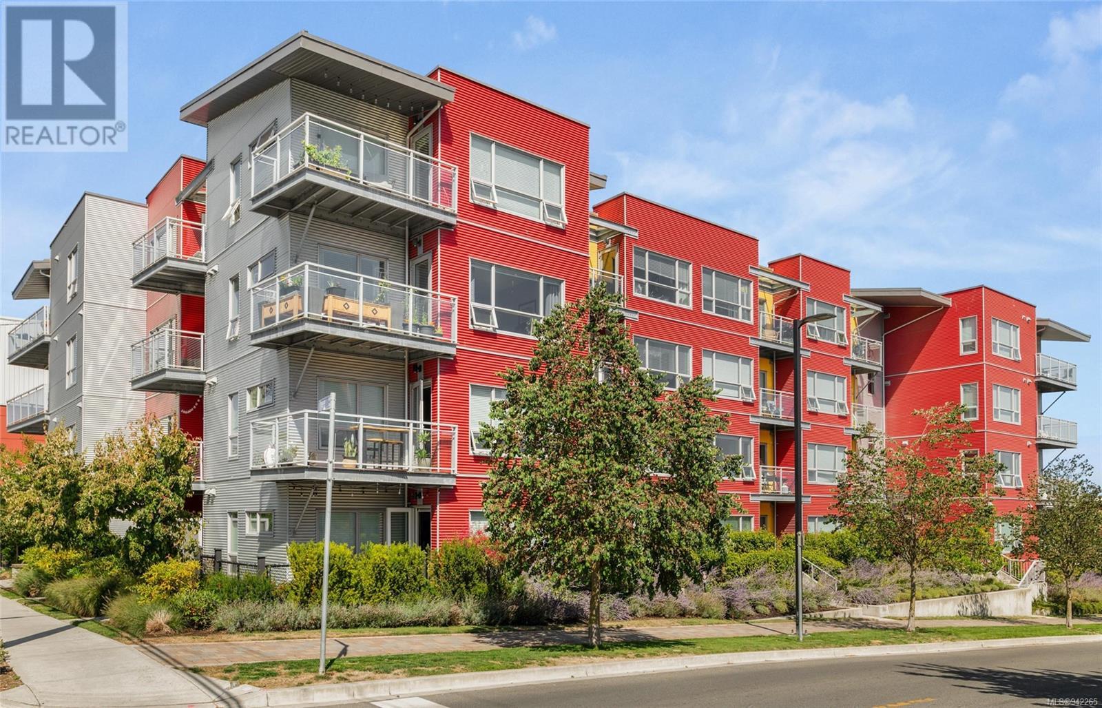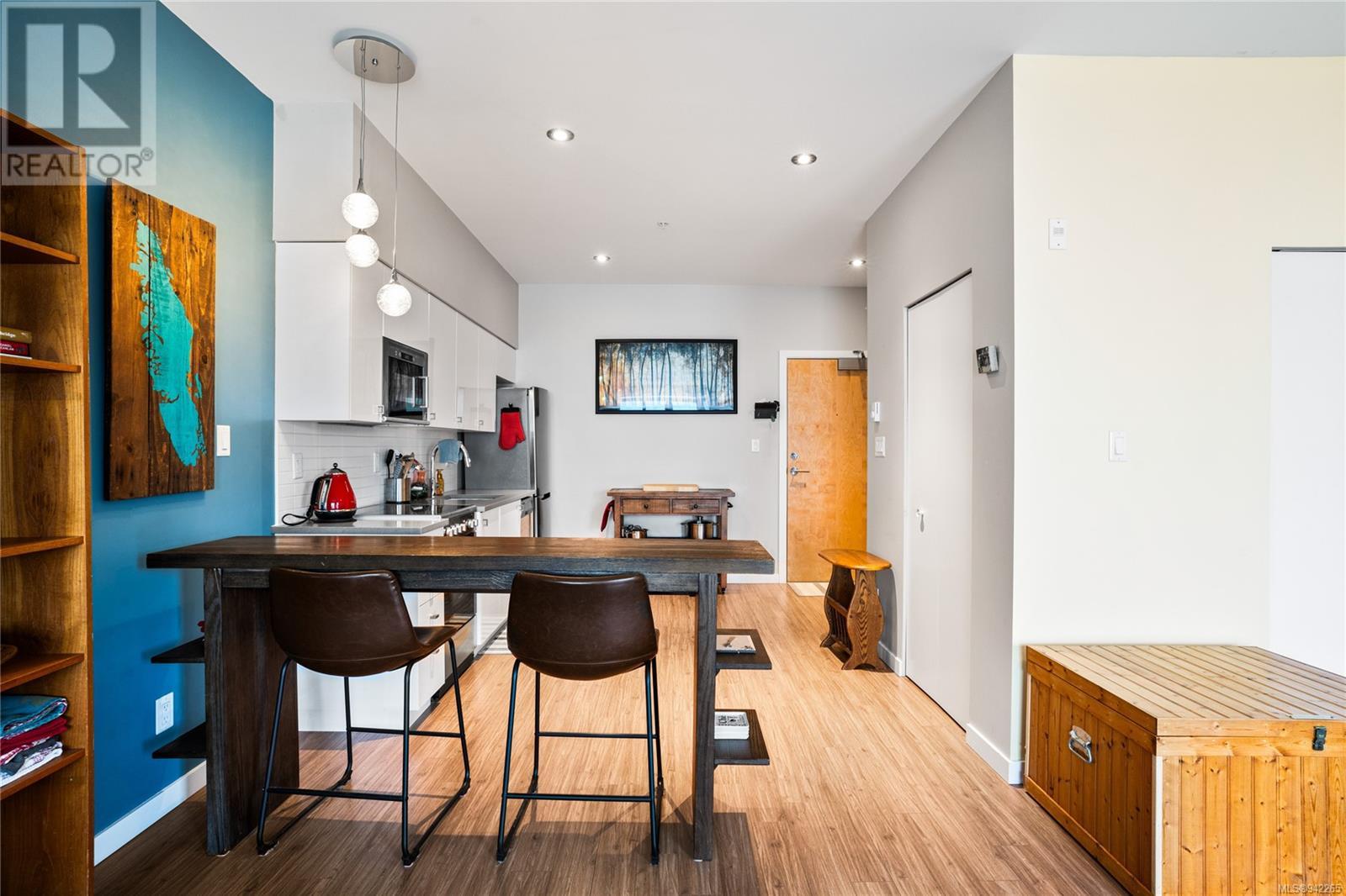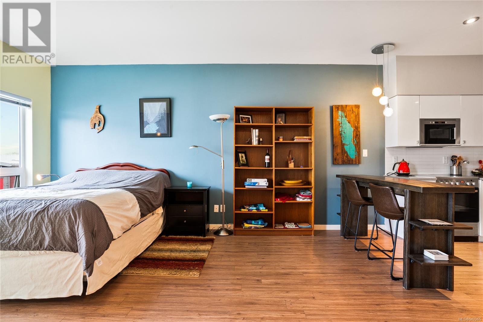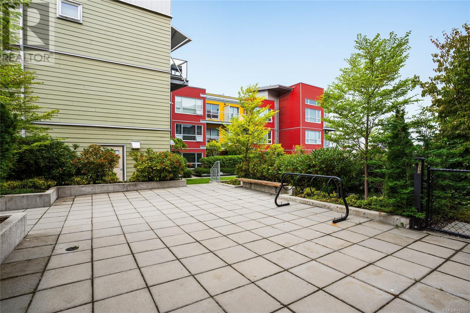 Welcome to the Railyards! Pleased to offer this immaculate top floor studio unit in the modern Bond's Landing 3. This bright, well laid out condo features quartz counters, heated bathroom flooring, high gloss white cabinetry, and like new stainless steel appliances. Overlooking the common courtyard and garden space, you will enjoy the evening sunsets from your private balcony. Located just steps from the water and just minutes from downtown, bakeries, local coffee shops and restaurants, you can enjoy launching your kayak from the dock or biking to work on the Galloping Goose Trail. This pet friendly rentable unit comes with a secure underground parking stall, storage unit, and the remaining new home warranty. Do not miss your chance to live in one of Victoria's most desirable waterfront communities! (id:22211)
