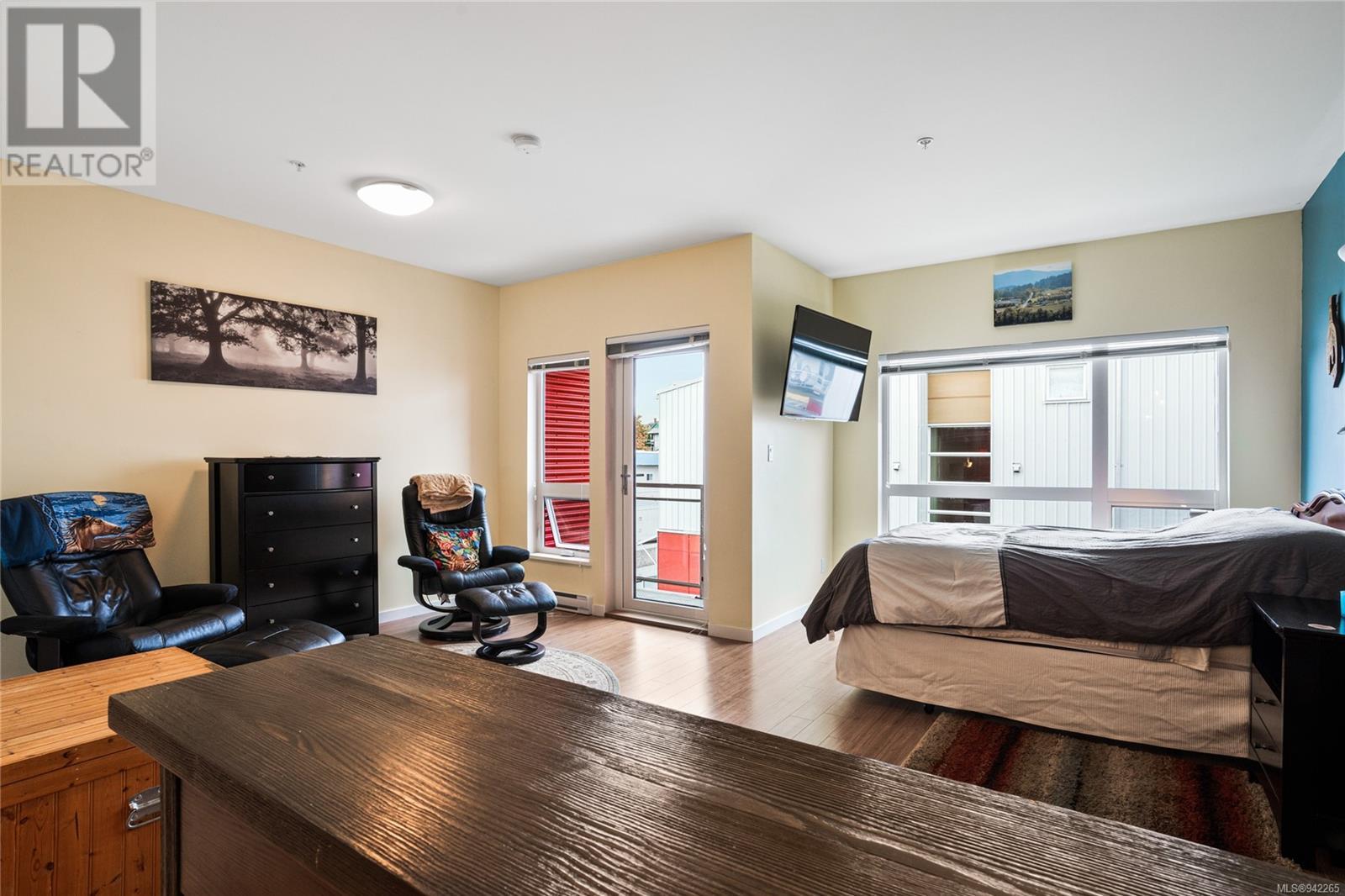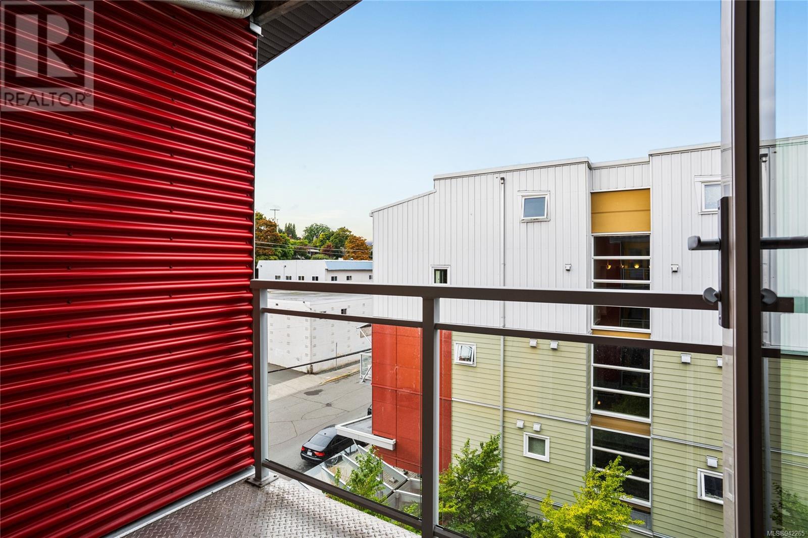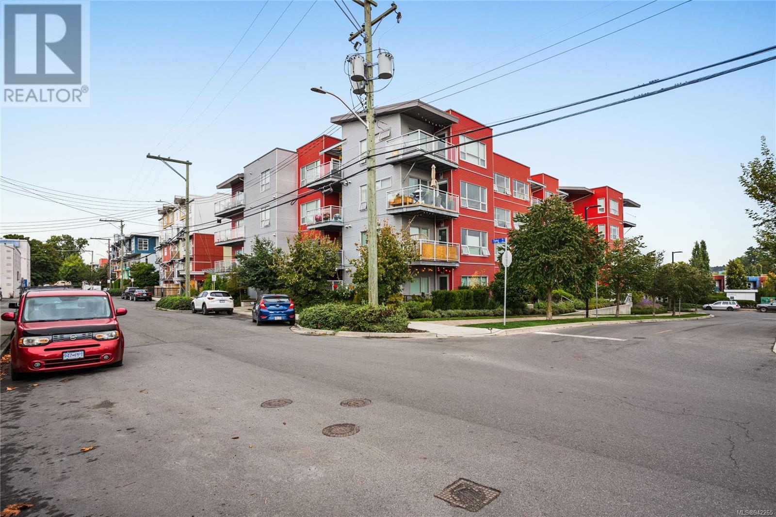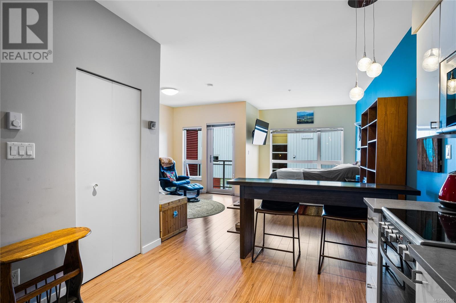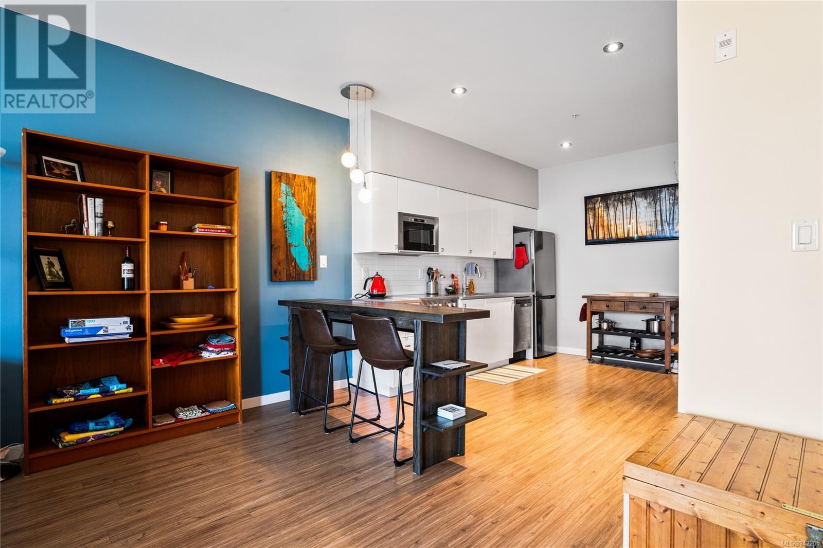 Welcome to the Railyards! Pleased to offer this immaculate top floor studio unit in the modern Bond's Landing 3. This bright, well laid out condo features quartz counters, heated bathroom flooring, high gloss white cabinetry, and like new stainless steel appliances. Overlooking the common courtyard and garden space, you will enjoy the evening sunsets from your private balcony. Located just steps from the water and just minutes from downtown, bakeries, local coffee shops and restaurants, you can enjoy launching your kayak from the dock or biking to work on the Galloping Goose Trail. This pet friendly rentable unit comes with a secure underground parking stall, storage unit, and the remaining new home warranty. Do not miss your chance to live in one of Victoria's most desirable waterfront communities! (id:22211)