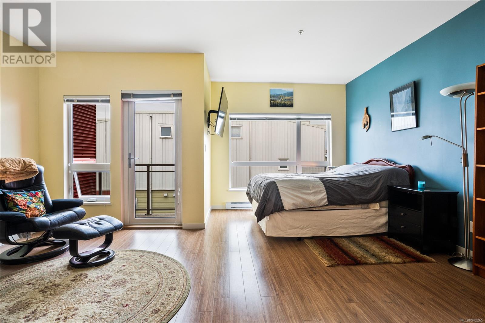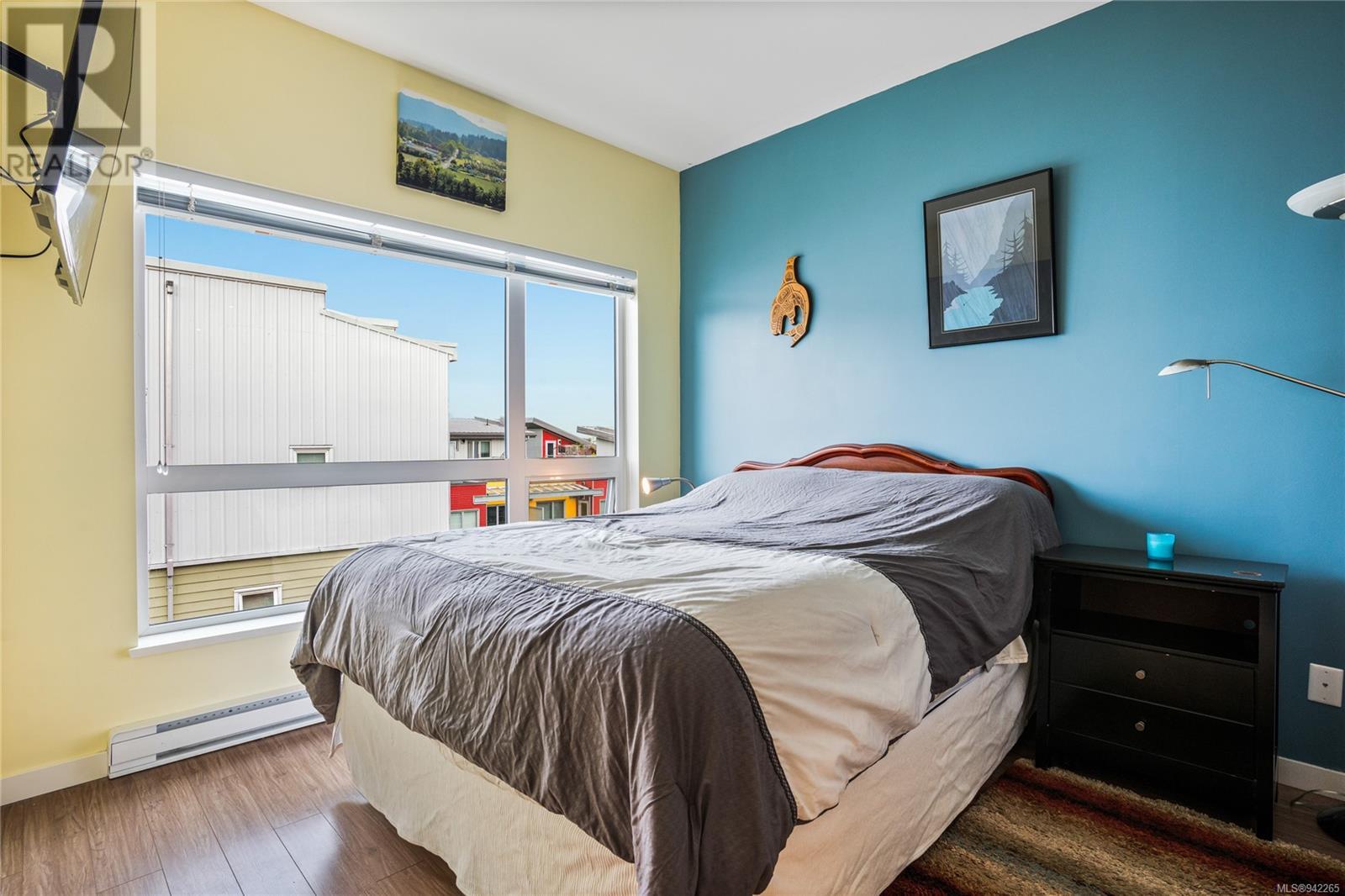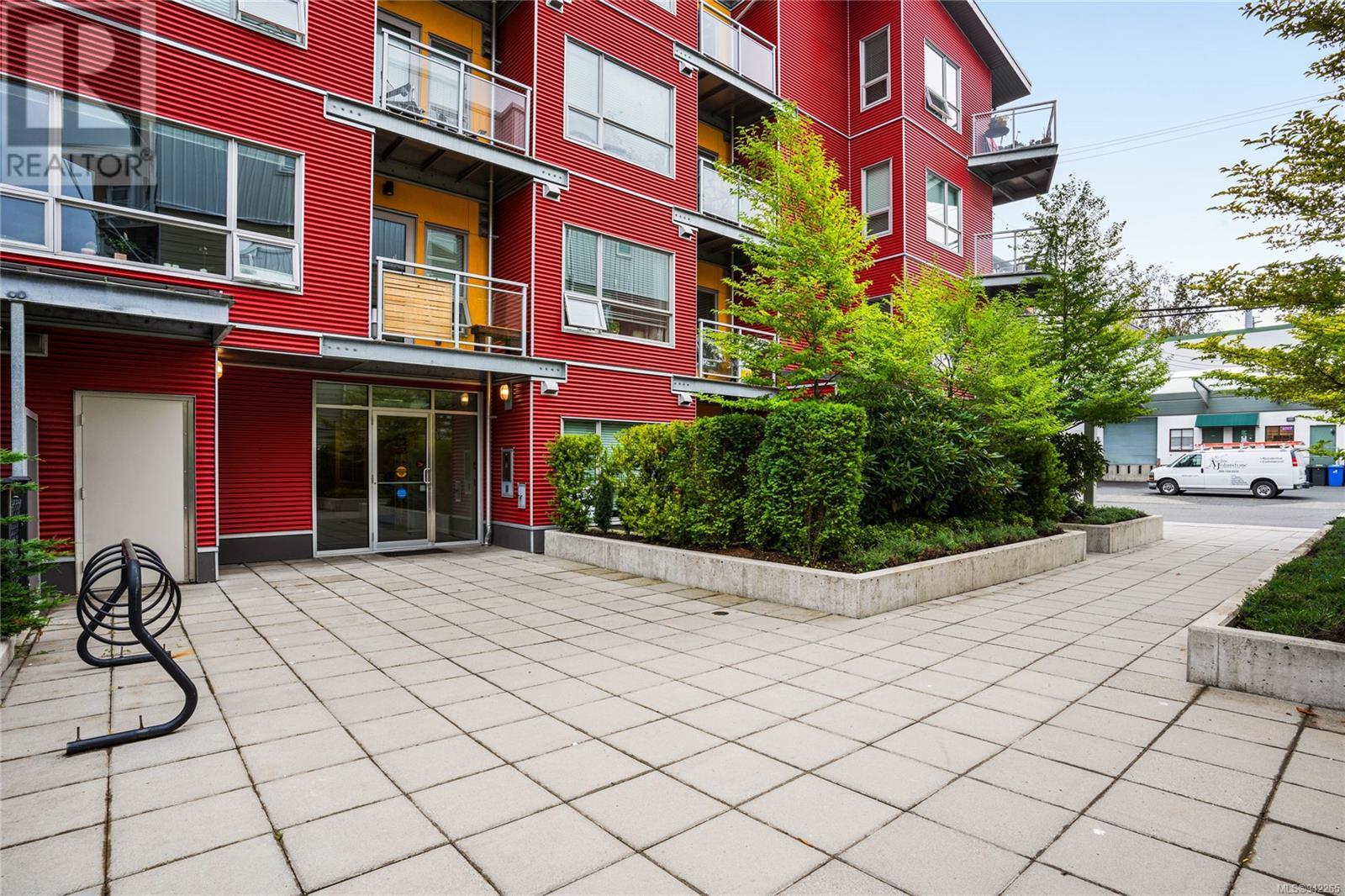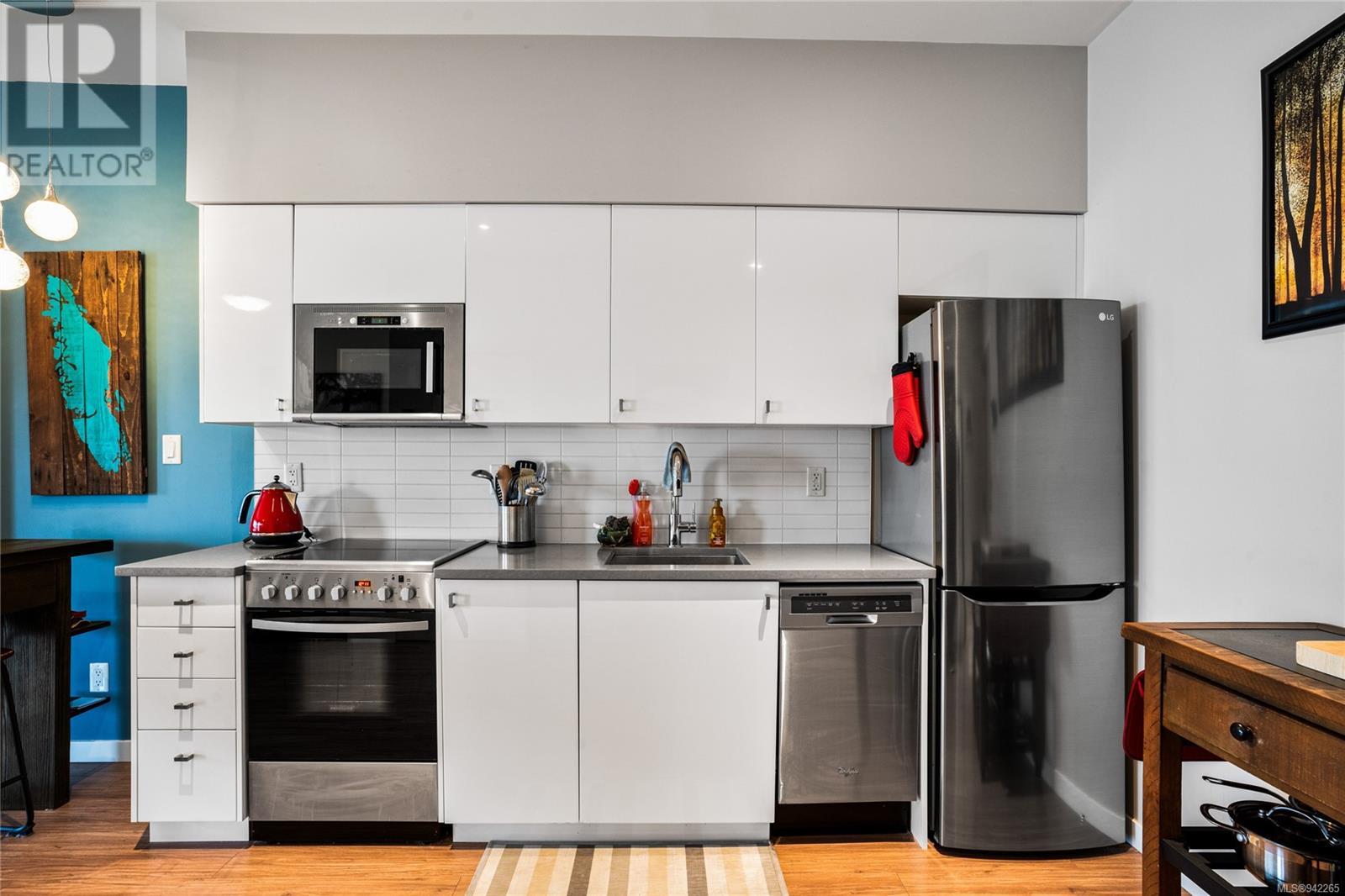 Welcome to the Railyards! Pleased to offer this immaculate top floor studio unit in the modern Bond's Landing 3. This bright, well laid out condo features quartz counters, heated bathroom flooring, high gloss white cabinetry, and like new stainless steel appliances. Overlooking the common courtyard and garden space, you will enjoy the evening sunsets from your private balcony. Located just steps from the water and just minutes from downtown, bakeries, local coffee shops and restaurants, you can enjoy launching your kayak from the dock or biking to work on the Galloping Goose Trail. This pet friendly rentable unit comes with a secure underground parking stall, storage unit, and the remaining new home warranty. Do not miss your chance to live in one of Victoria's most desirable waterfront communities! (id:22211)