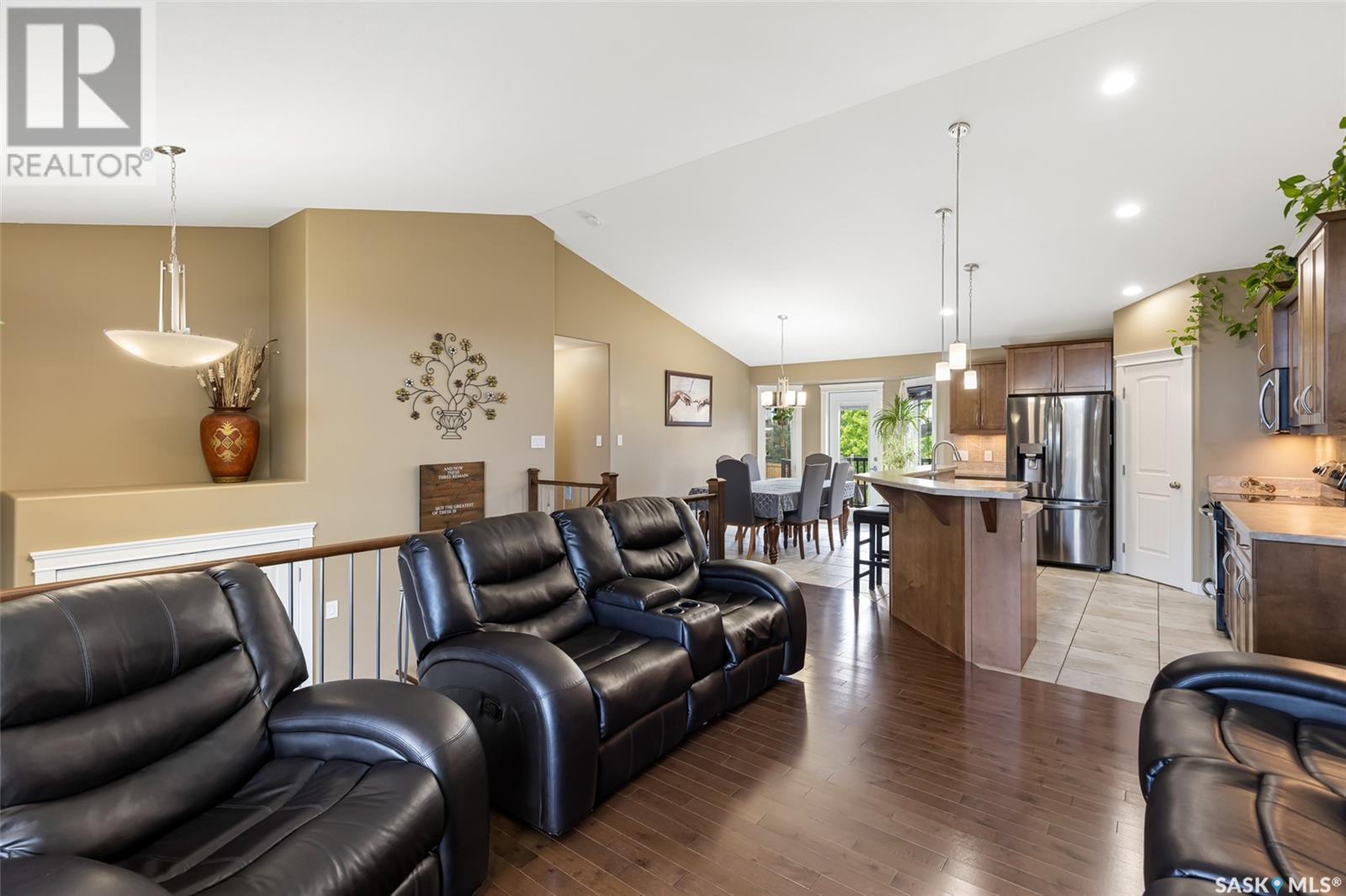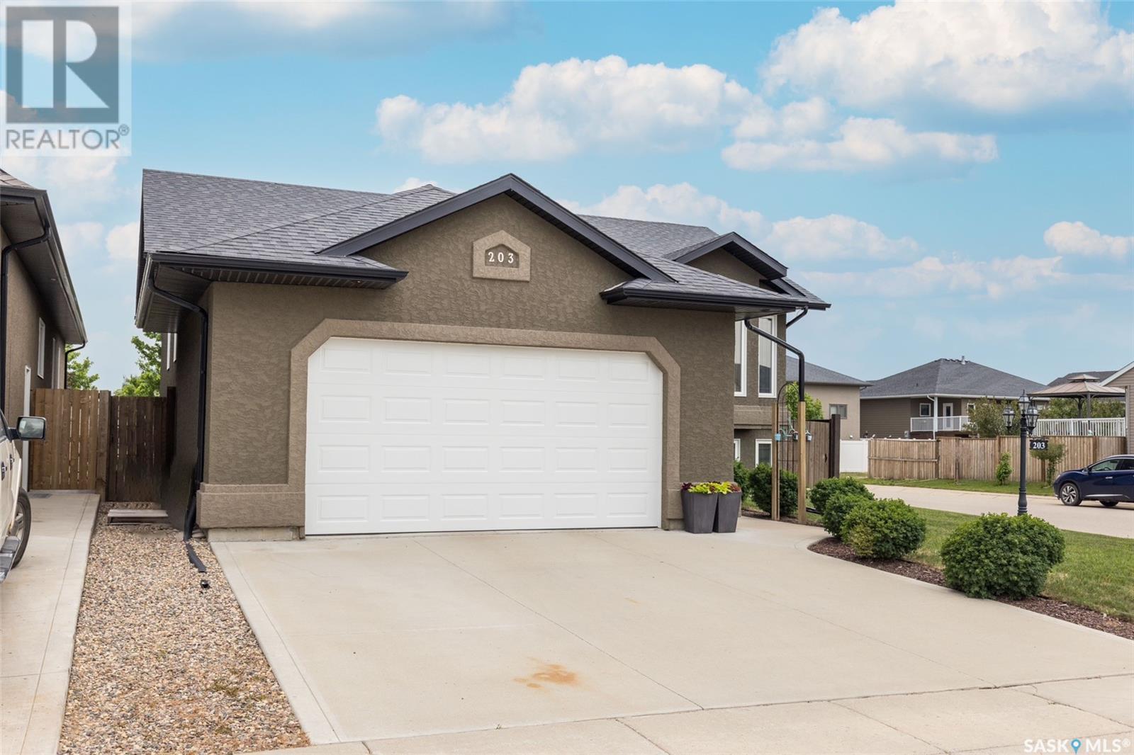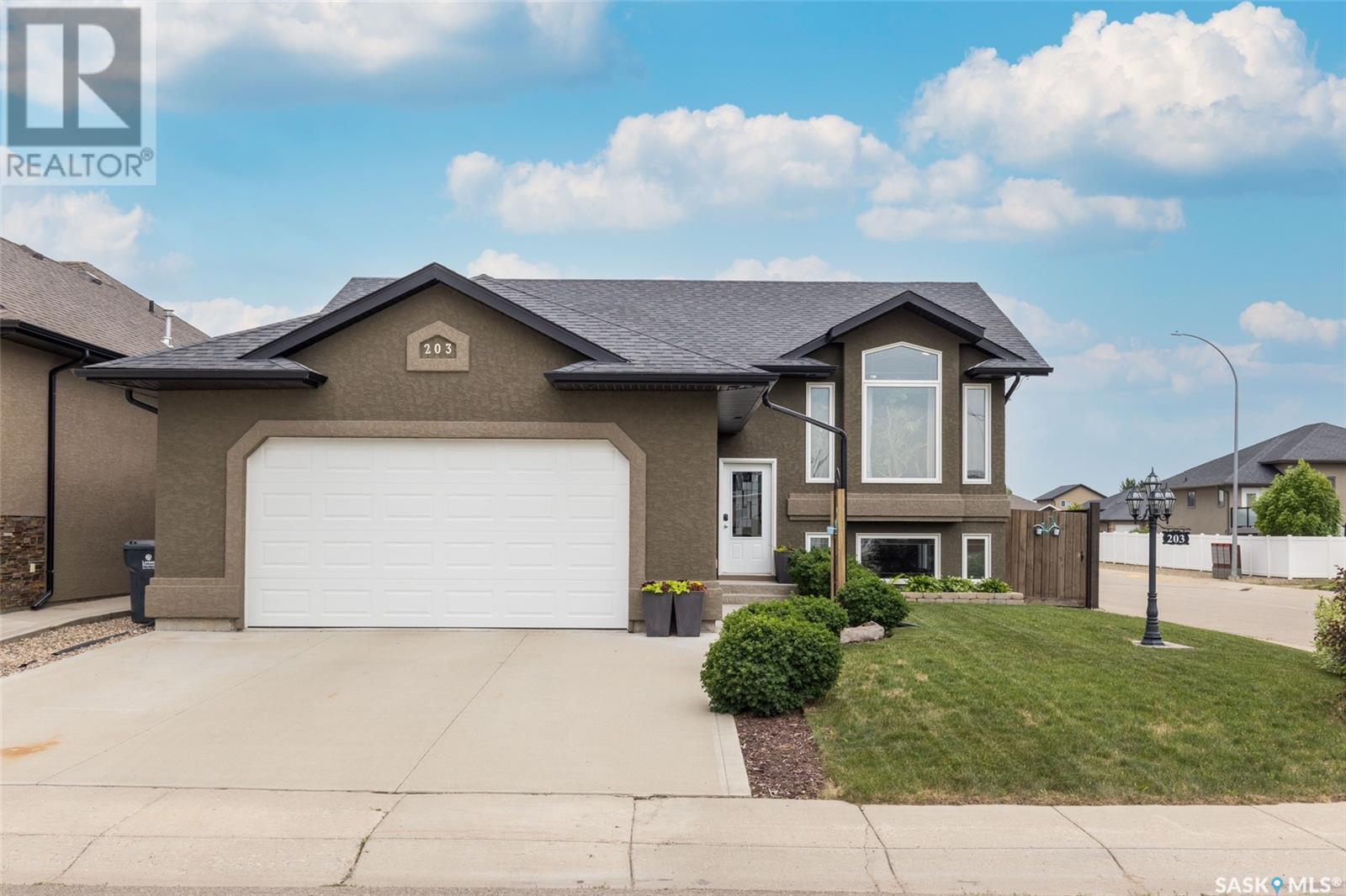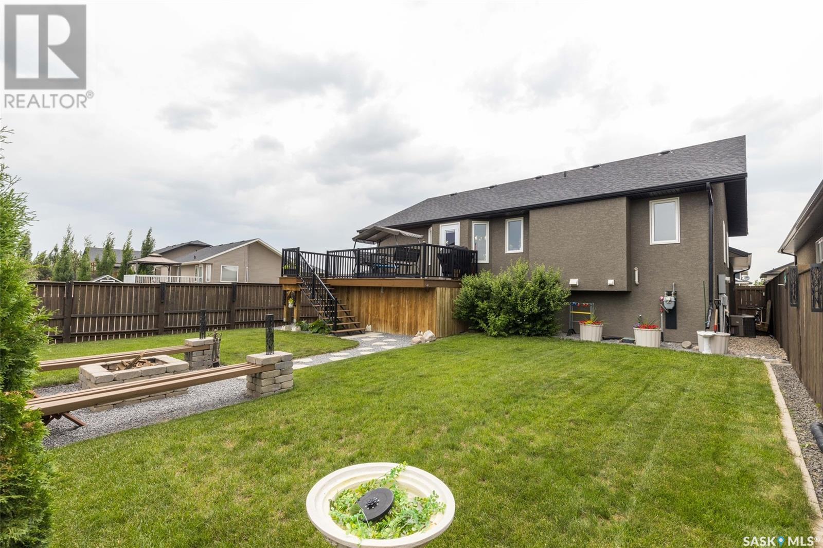 Check out 203 Mize Place in the Legends area of Warman. This 5 bedroom, 3 bathroom bilevel home is perfect for a large family. Fully developed inside and out, no renovations required. Owner occupied with no smoking, no children or pets, has kept this property in pristine condition. The open concept living area is spacious with vaulted ceilings, hardwood and tile flooring, large island, backsplash with under cabinet lighting, corner pantry, stainless steel appliances and direct access to the deck. The master bedroom boasts a walk-in closet and 3 piece ensuite. Two large bedrooms and the main 4 piece bathroom complete the main floor. The double attached garage has direct entry to the front foyer. The exceptional basement is finished with a fabulous family room and games area with bright windows and natural gas fireplace. Two additional bedrooms and a fabulous 3 piece bathroom with jet tub utilize the entire space perfectly. The beautiful back yard is fully fenced with plants and grass, along with a custom fire pit area and underground sprinklers . The deck also serves as extra enclosed storage area underneath. The front yard is beautifully landscaped and also offers plenty of parking being on a corner lot. Central air and central vac also included. Call or message your agent to view! (id:22211)