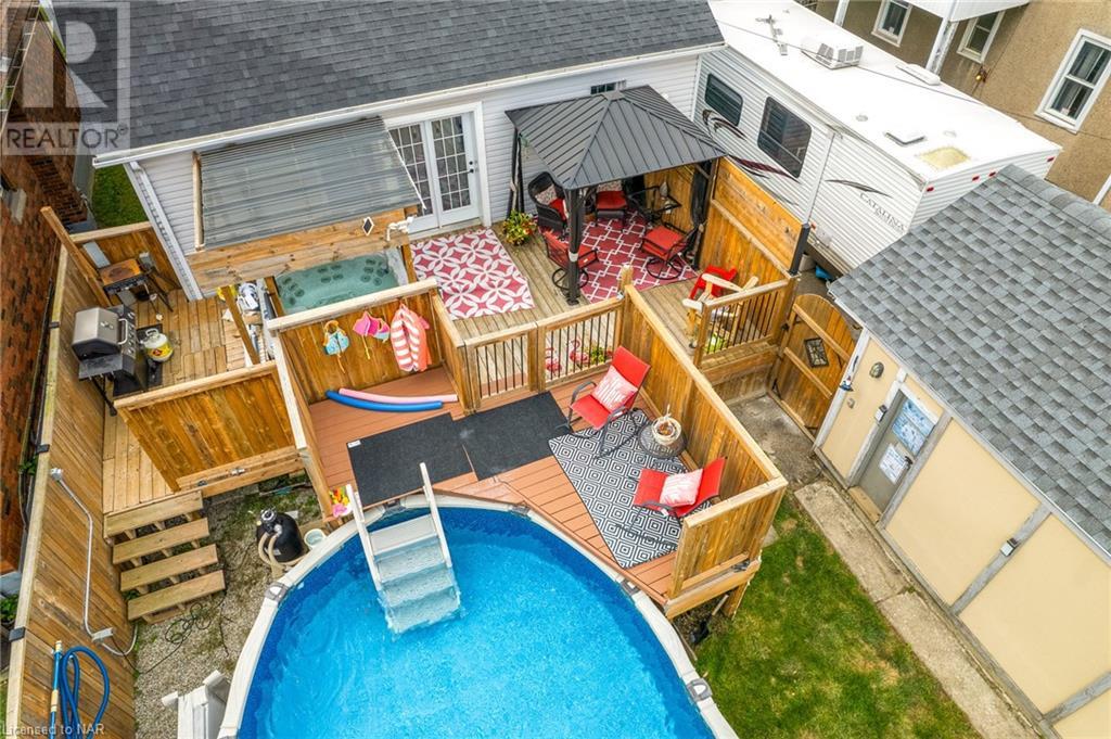 Immaculately kept & extensively renovated 1.5 Storey family home with detached 1.5 car garage. Fully fenced rear yard oasis that features Awesome oversized deck w/ twin pergola's, hot tub & 13x24 AG oval pool with swim platform deck. Exterior of the home has been totally overhauled w/ replacement roof (2021), vinyl windows (2022), upgraded insulation, stylish new vinyl siding & striking new exterior doors (2020). Inside you'll find a spacious & welcoming Living room, 2 Main Floor Bedroom's, updated 4pc bath & oversized eat-in kitchen w/ updated cabinets & counters, full wall pantry, tiled backsplash, SS appliances & new french doors to new rear deck. Upstairs consists a large private bedroom w/ w/i closet and plenty of room for potential future bath. The mostly finished basement features side door separate entrance, cozy den, additional bedroom, laundry room, 2pc bath and large utility/storage area. Additional updates inc: basement water proofing (2020), C/A (2023), Hot tub & pool (2021) & new owned HWT (2023). Quick & convenient hwy access. Excellent value - move in condition home ! (id:22211)