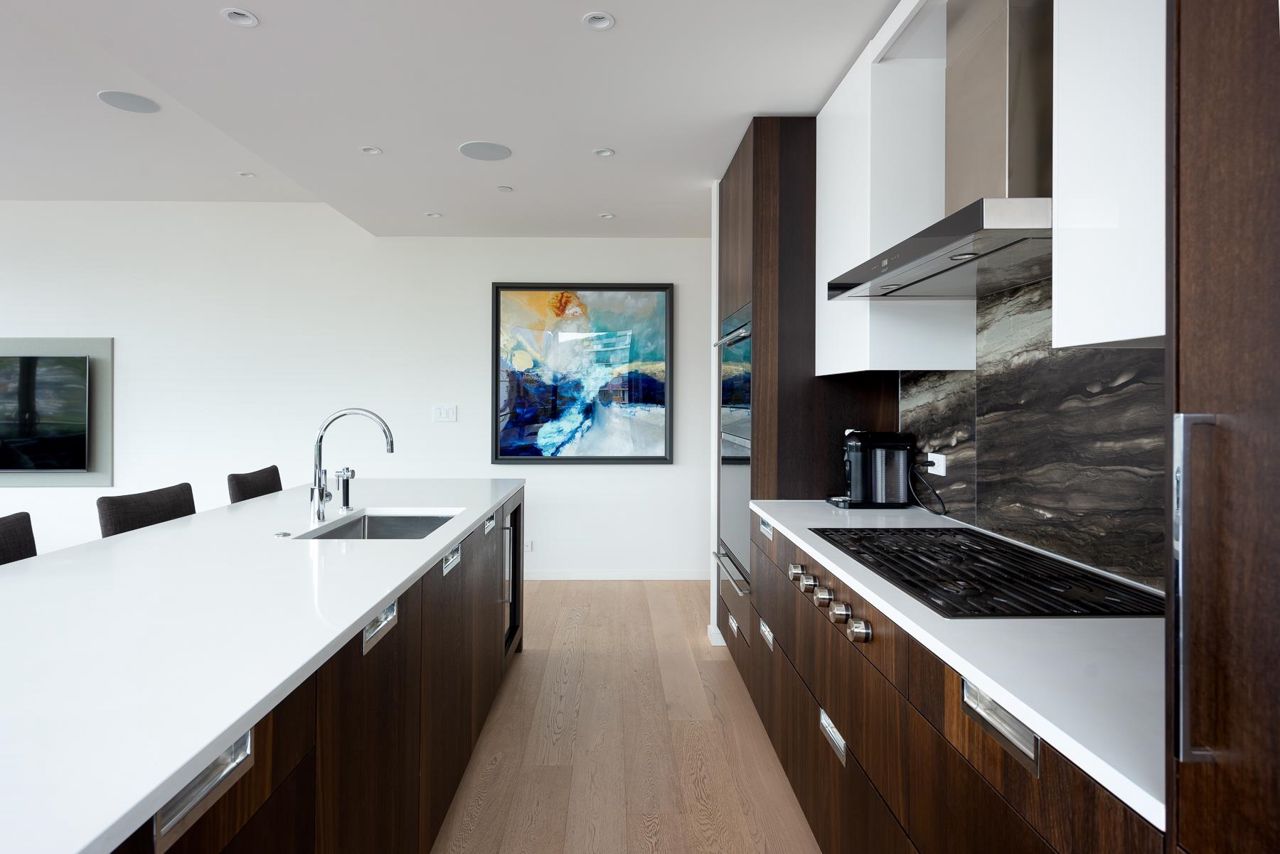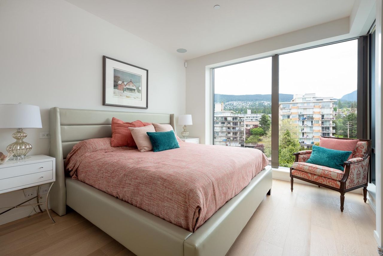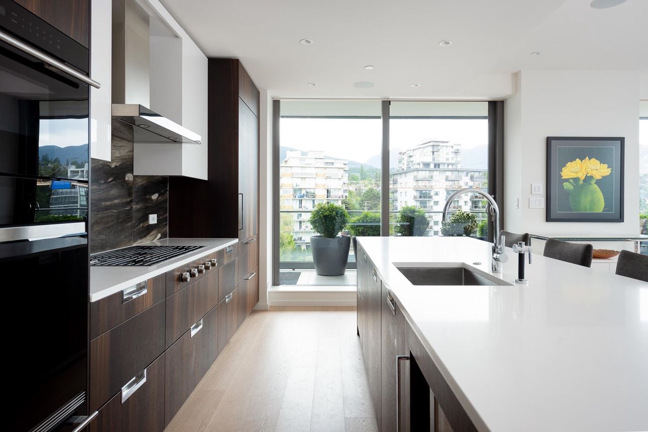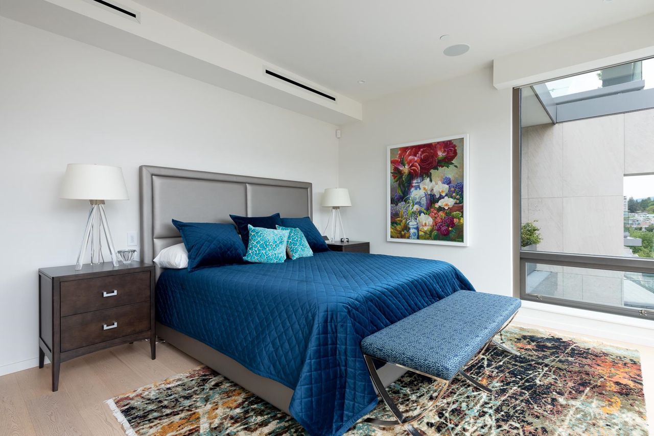 2 bed/ 2 bath NE CORNER SUB-PENTHOUSE GROSVENOR AMBLESIDE Phase I with views of the North Shore mountains & Sentinel Hill. Stunning unique plan with 9’ ceilings, floor to ceiling windows and a wrap around balcony with peek-a-boo water views. Custom Snaidero kitchen, Wolfe & Sub Zero appliances, and gorgeous finishing details. 2 bedrooms have ample separation from the living area for privacy. Spacious master suite can easily accommodate a king size bed, has a generous walk-in closet and lovely spa-like ensuite. Second bedroom could double as a office and is adjacent to a lovely 3 piece bathroom. Beautifully appointed with automated blinds, air conditioning, Milson sound & tv, double private garage with ev charger and 24 hour concierge plus much more! Plus Fido is welcome!