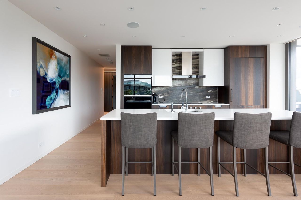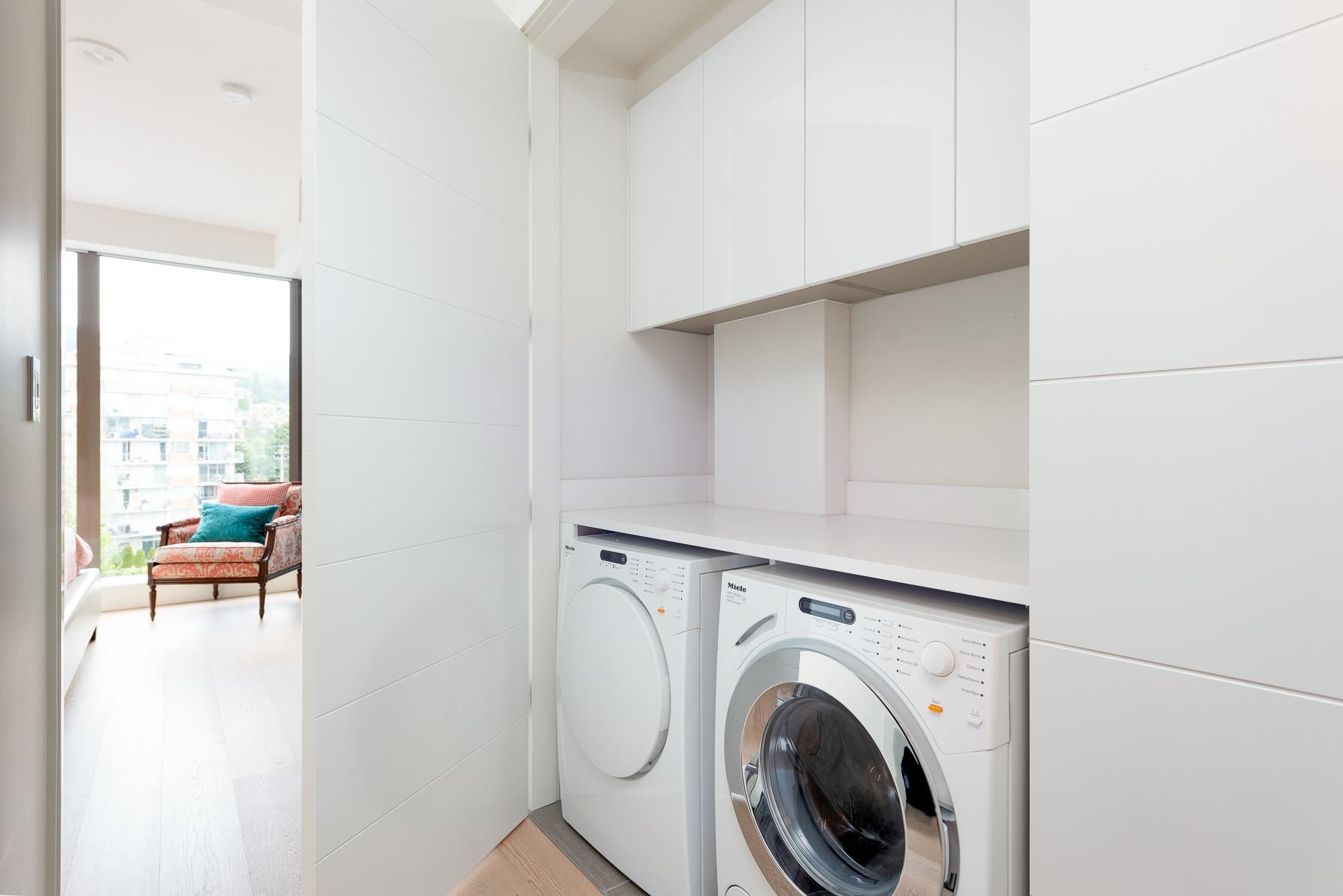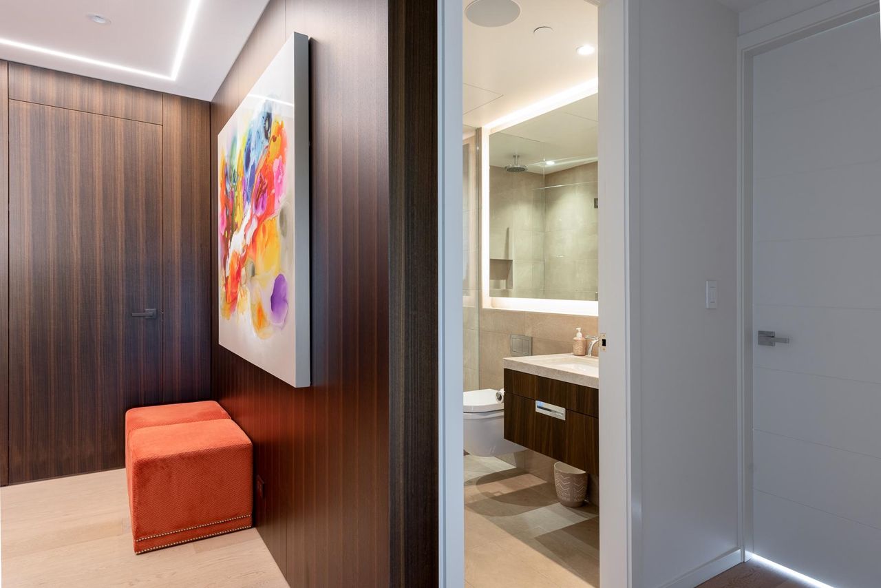2 bed/ 2 bath NE CORNER SUB-PENTHOUSE GROSVENOR AMBLESIDE Phase I with views of the North Shore mountains & Sentinel Hill. Stunning unique plan with 9’ ceilings, floor to ceiling windows and a wrap around balcony with peek-a-boo water views. Custom Snaidero kitchen, Wolfe & Sub Zero appliances, and gorgeous finishing details. 2 bedrooms have ample separation from the living area for privacy. Spacious master suite can easily accommodate a king size bed, has a generous walk-in closet and lovely spa-like ensuite. Second bedroom could double as a office and is adjacent to a lovely 3 piece bathroom. Beautifully appointed with automated blinds, air conditioning, Milson sound & tv, double private garage with ev charger and 24 hour concierge plus much more! Plus Fido is welcome!