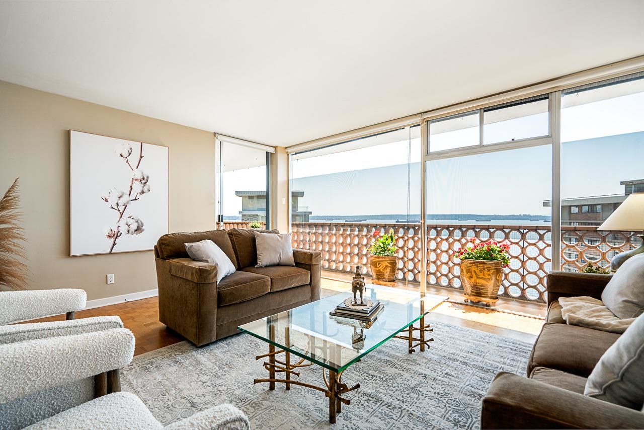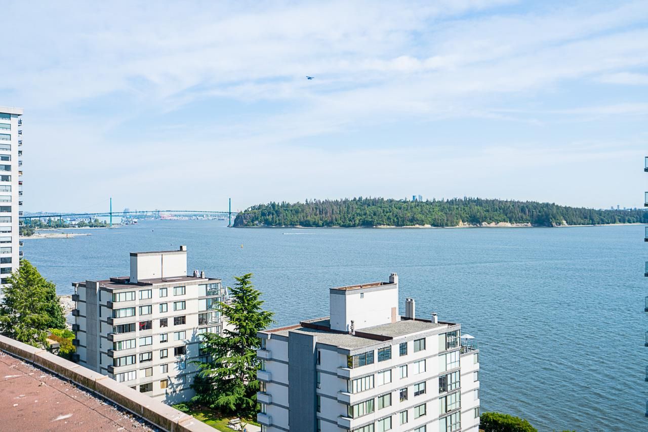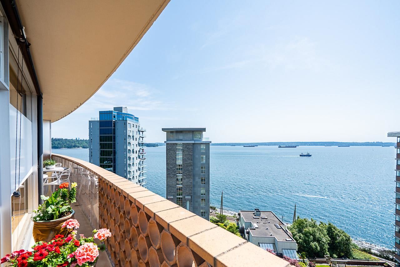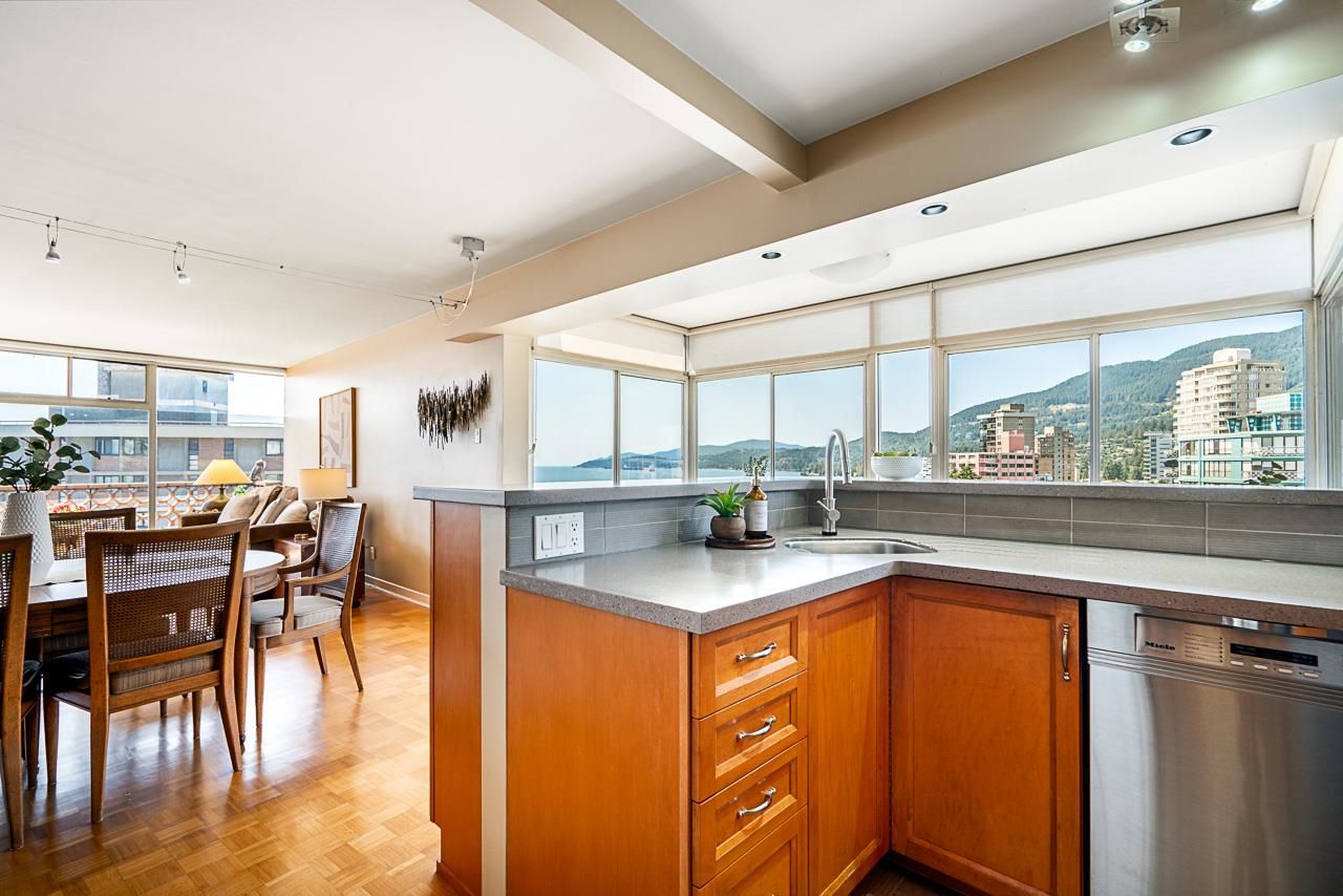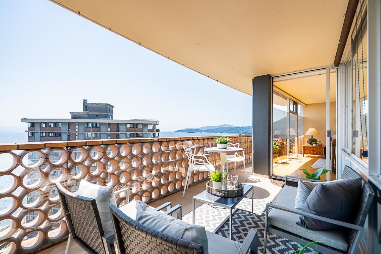 Welcome to the iconic Crescent building and the south west corner Penthouse. Spacious 2 bedrooms, 2 bathrooms, over 1500 SF well maintained suite, with spectacular views and sunsets! Enjoy outside entertaining on your south facing balcony. Features include an updated, open kitchen with stainless steel appliances, Corian counters, large house sized rooms, plenty of storage and in-suite laundry. Both bedrooms offer beautiful views and ensuite bathrooms. The Crescent is located on prestigious Argyle Avenue in a prime Dundarave location, steps to the Seawall, recreation centres, shopping and all amenities. Enjoy the cruise ships go by. This is the perfect lifestyle!