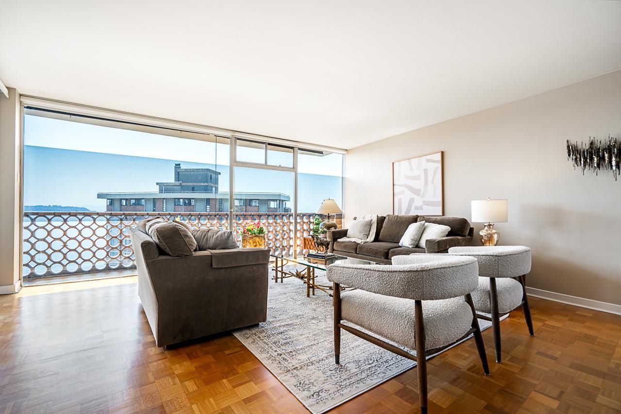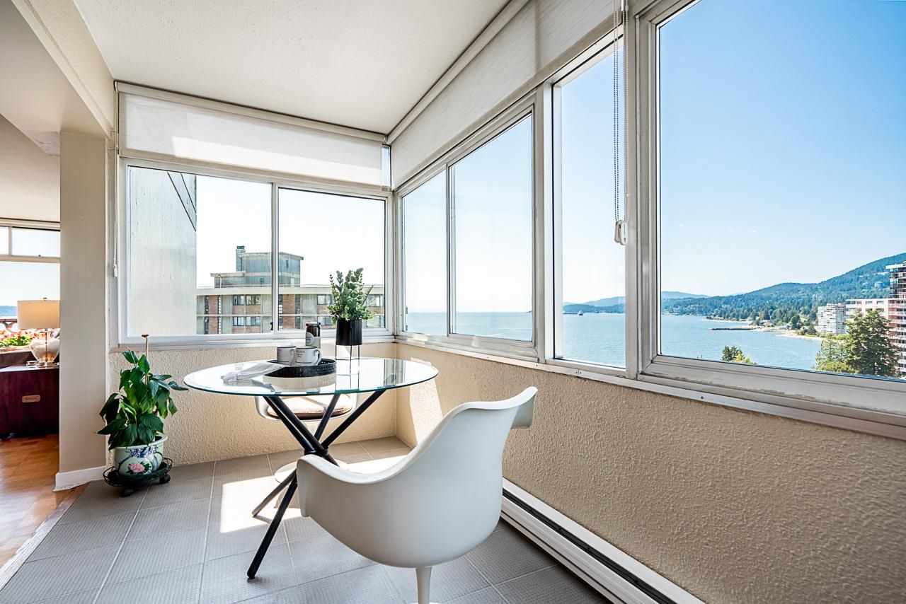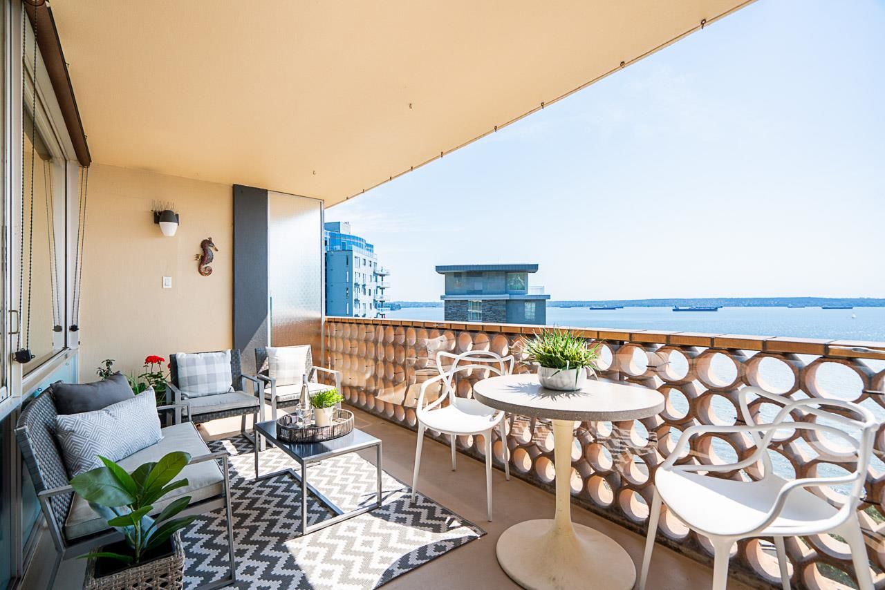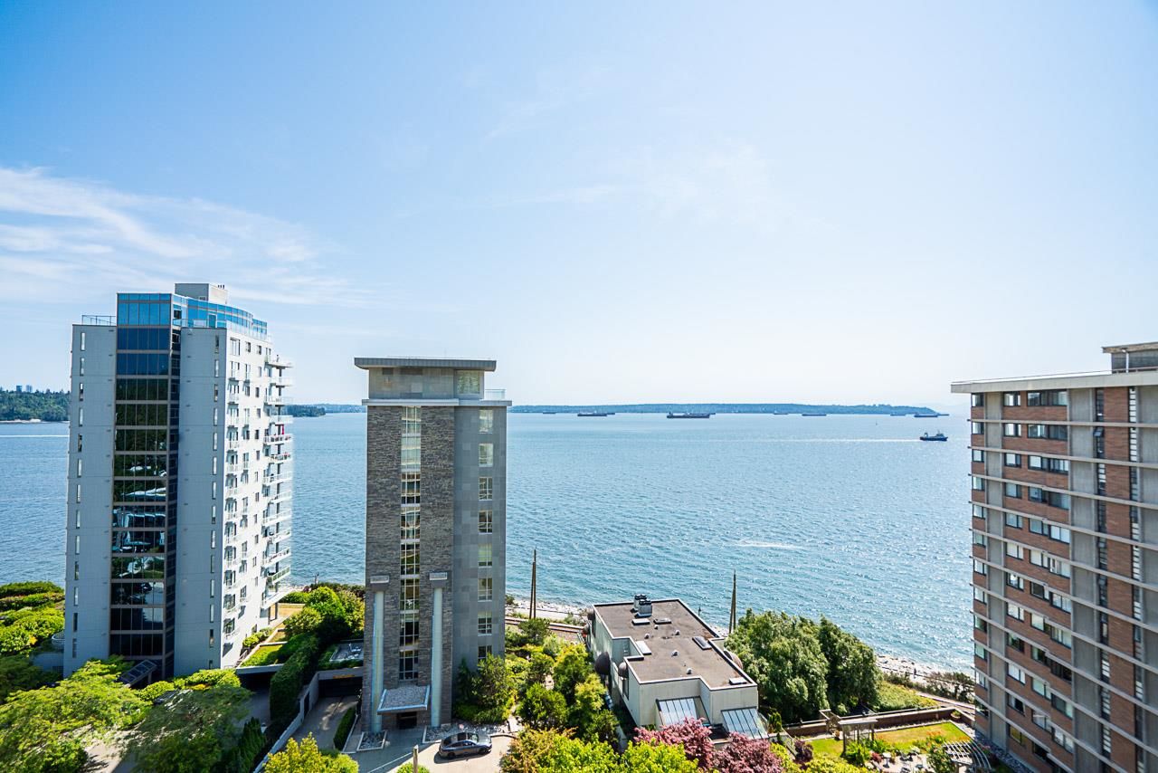 Welcome to the iconic Crescent building and the south west corner Penthouse. Spacious 2 bedrooms, 2 bathrooms, over 1500 SF well maintained suite, with spectacular views and sunsets! Enjoy outside entertaining on your south facing balcony. Features include an updated, open kitchen with stainless steel appliances, Corian counters, large house sized rooms, plenty of storage and in-suite laundry. Both bedrooms offer beautiful views and ensuite bathrooms. The Crescent is located on prestigious Argyle Avenue in a prime Dundarave location, steps to the Seawall, recreation centres, shopping and all amenities. Enjoy the cruise ships go by. This is the perfect lifestyle!