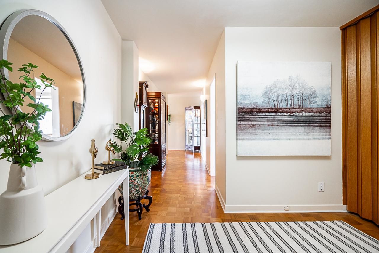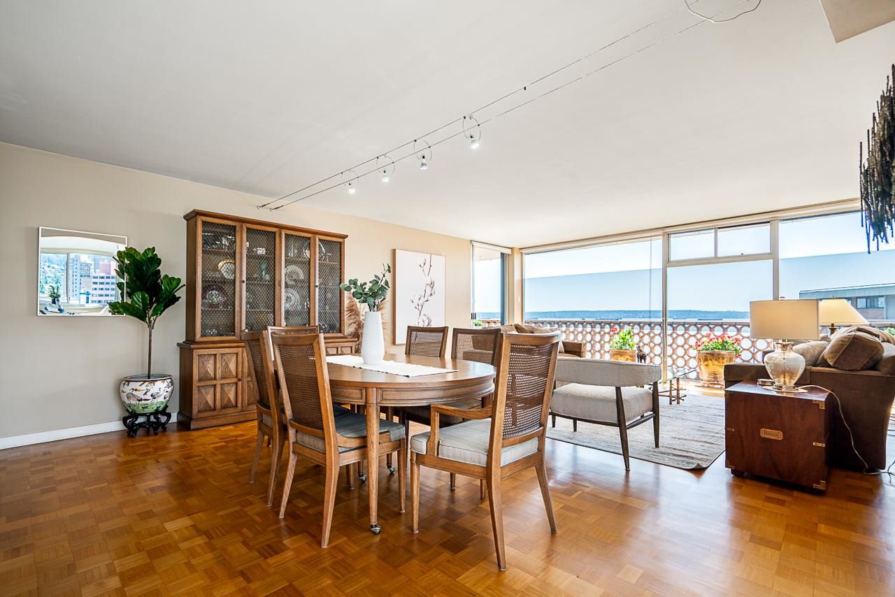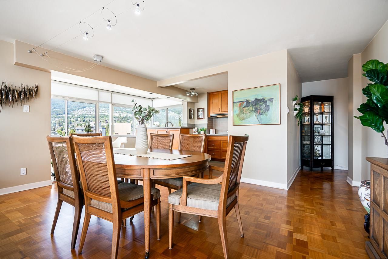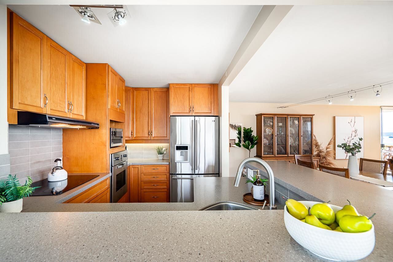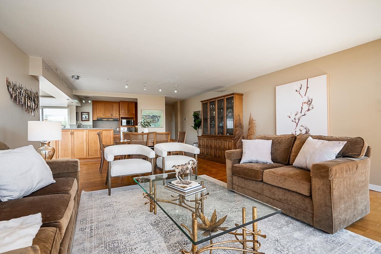 Welcome to the iconic Crescent building and the south west corner Penthouse. Spacious 2 bedrooms, 2 bathrooms, over 1500 SF well maintained suite, with spectacular views and sunsets! Enjoy outside entertaining on your south facing balcony. Features include an updated, open kitchen with stainless steel appliances, Corian counters, large house sized rooms, plenty of storage and in-suite laundry. Both bedrooms offer beautiful views and ensuite bathrooms. The Crescent is located on prestigious Argyle Avenue in a prime Dundarave location, steps to the Seawall, recreation centres, shopping and all amenities. Enjoy the cruise ships go by. This is the perfect lifestyle!