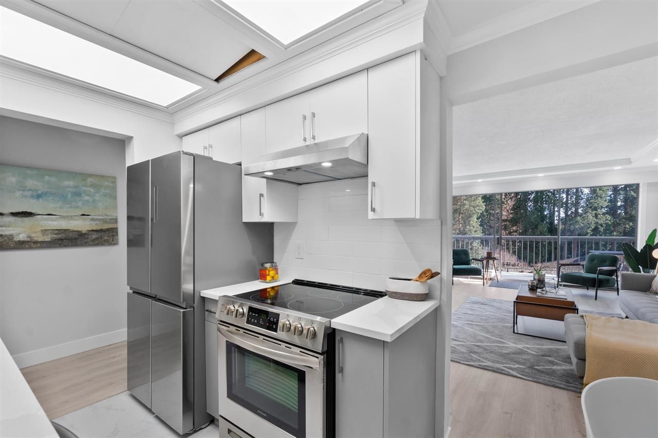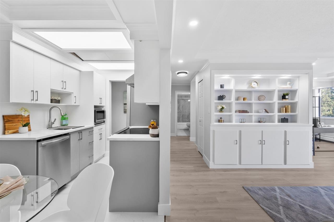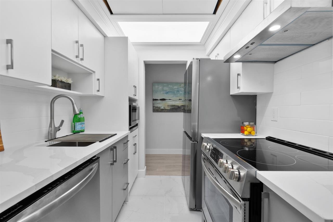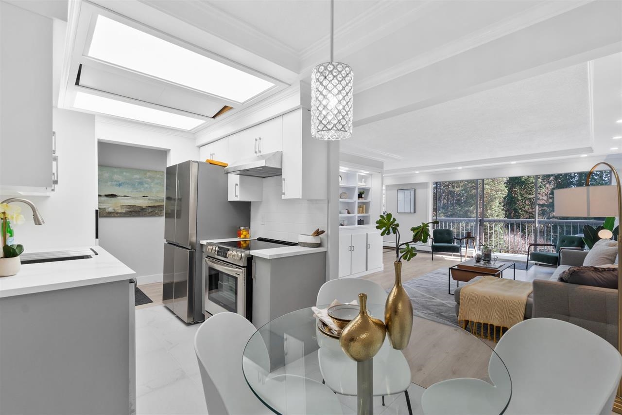 WESTCOT ELEMENTARY & SENTINEL SECONDARY SCHOOL CATCHEMENT. Concrete building & Fully renovated home features a large master bedroom with a massive den, Currently the den is using as a second bedroom. A south facing patio looking onto a beautiful view. Brand-new kitchen with stainless-steel appliances, a built-in microwave, quartz countertops. Spacious family room offers plenty of space to entertain guests. Tons of storage space in this home with 6 closets and a huge storage locker, as well as 2 parking stalls. The monthly fee including heat & hot water. This well maintained complex is nestled on 8 acres of beautifully sun drenched manicured floral garden. Enjoy the use of the clubhouse, guest suite, meeting room, 2 party rooms and swimming pool.