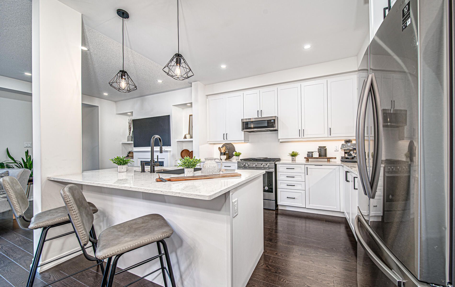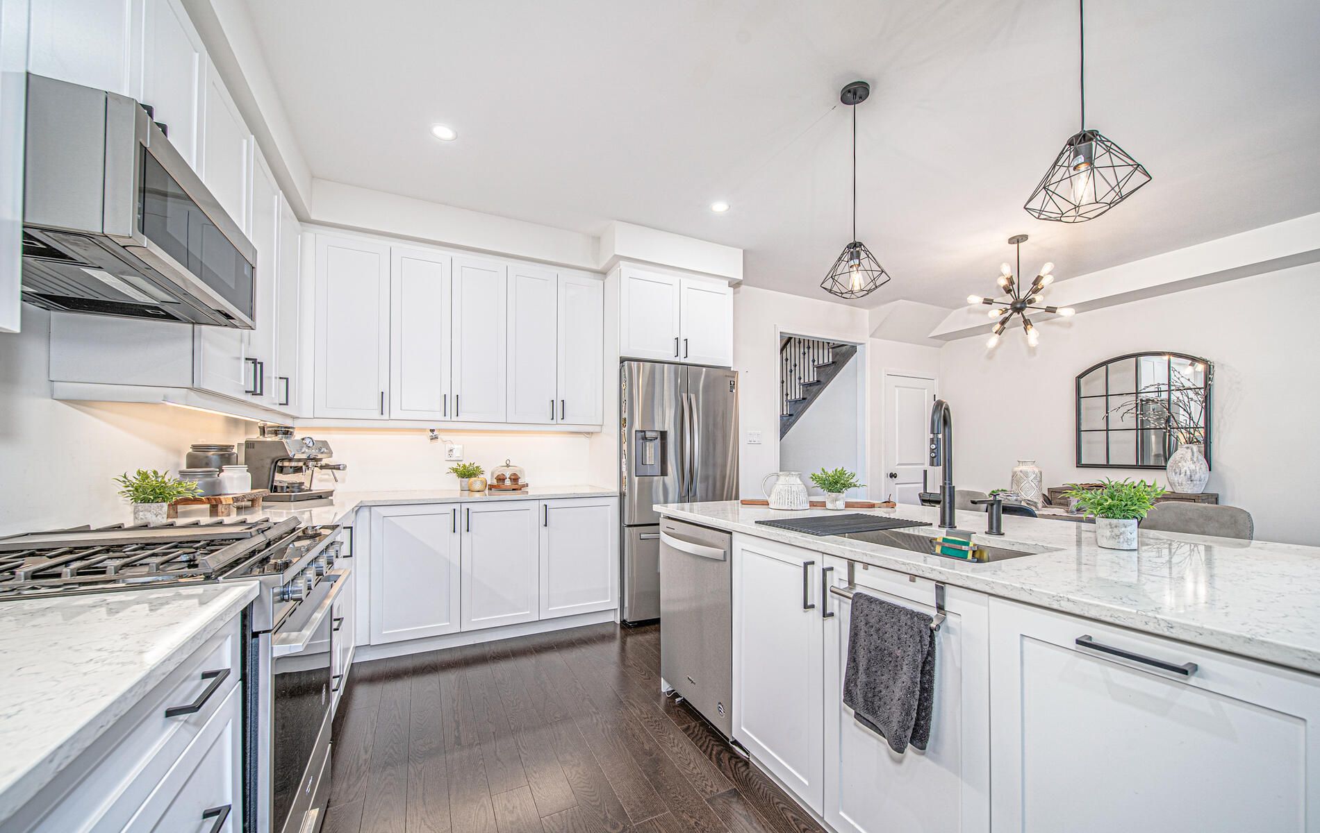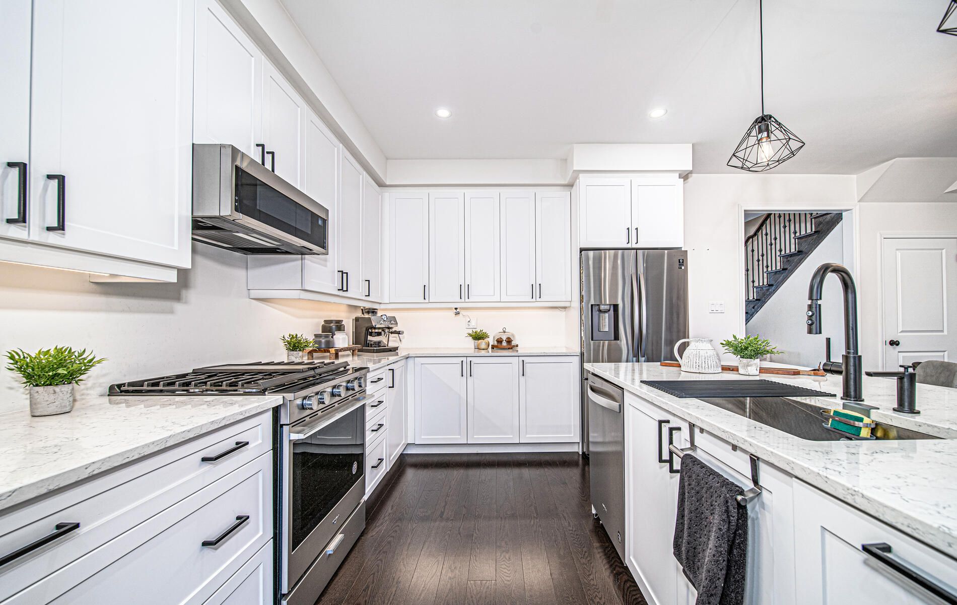 Upgraded kitchen with extended cupboards, valance lighting, quartz counter,