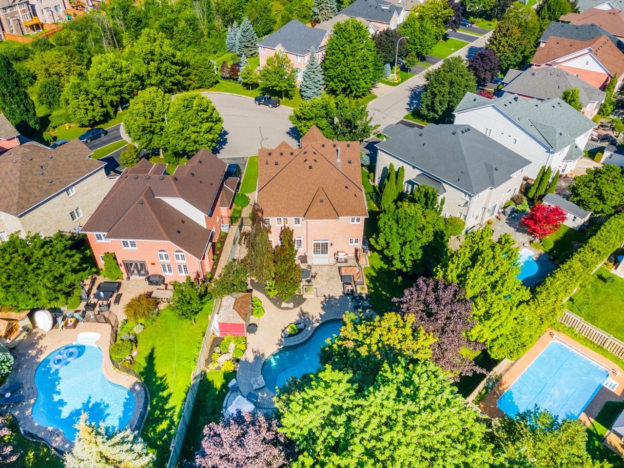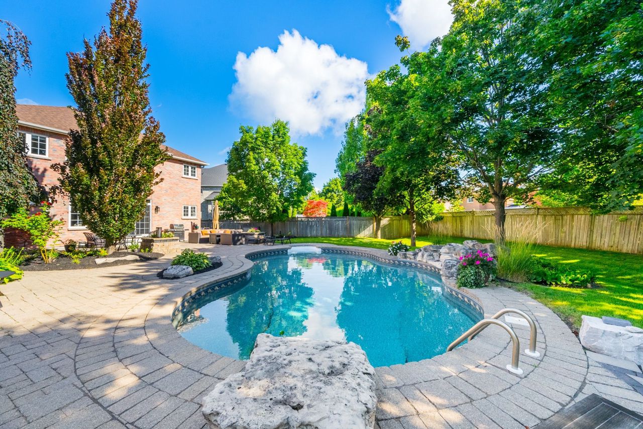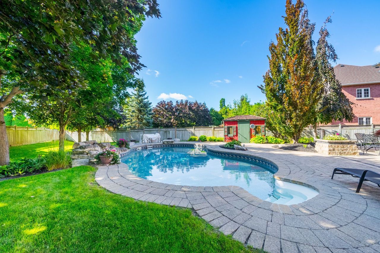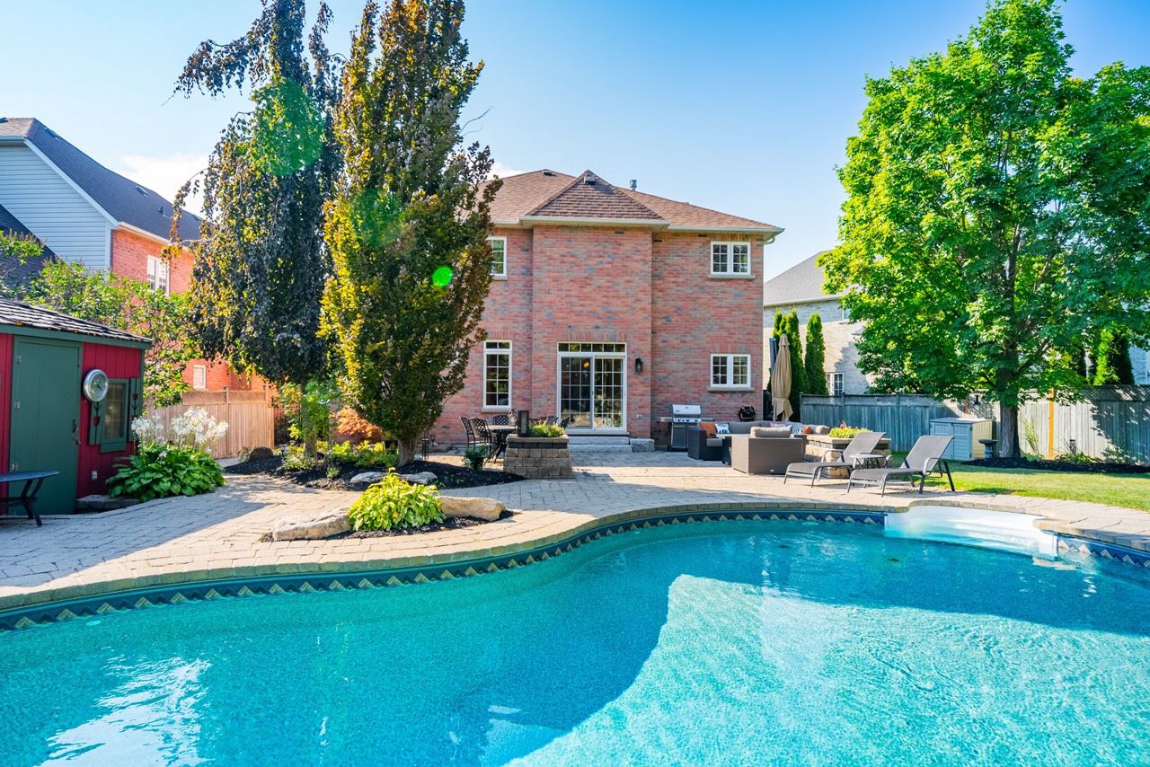 One-of-a-kind 4 bdrm, 5 bath executive Queen's Common family home! Incredible 202ft premium lot w/bkyrd oasis complete w/IG saltwater pool, interlock patio, lrg shed & lush manicured gardens. Monarch Homes 'Hazelwood' model offers an impressive open concept main flr plan featuring extensive hrdwd flrs incl staircase, crown moulding, pot lights & more! Designed w/entertaining in mind in the formal liv rm & dining rm w/soaring cathedral ceiling & shared 2-sided gas f/p. Gourmet kit offers granite counters, w/i pantry, bksplsh, island w/brkfst bar, s/s appls & brkfst area w/walk-out to the patio & pool! Spacious family rm w/cozy gas f/p & bkyrd views. Room to grow w/fully fin bsmt ('19) w/gym & lrg rec rm w/kitchenette, custom built-ins, elec f/p, 2pc bath & ample storage space! Upstairs offers 4 generous bdrms, all with ensuites & great closet space! Upper nook w/walk-out to a relaxing balcony o/l the front gardens - perfect place to enjoy your morning coffee! This home has it all!!!Roof '14, furnace '11, central air '23. Main flr sunken laundry rm - 2.55x1.93 w/quartz counter, sink, closet & garage access. 2nd flr nook - 2.43x2.33 w/crown moulding. Luxury finishes & offering over 3,194 sqft + the fully fin bsmt!
