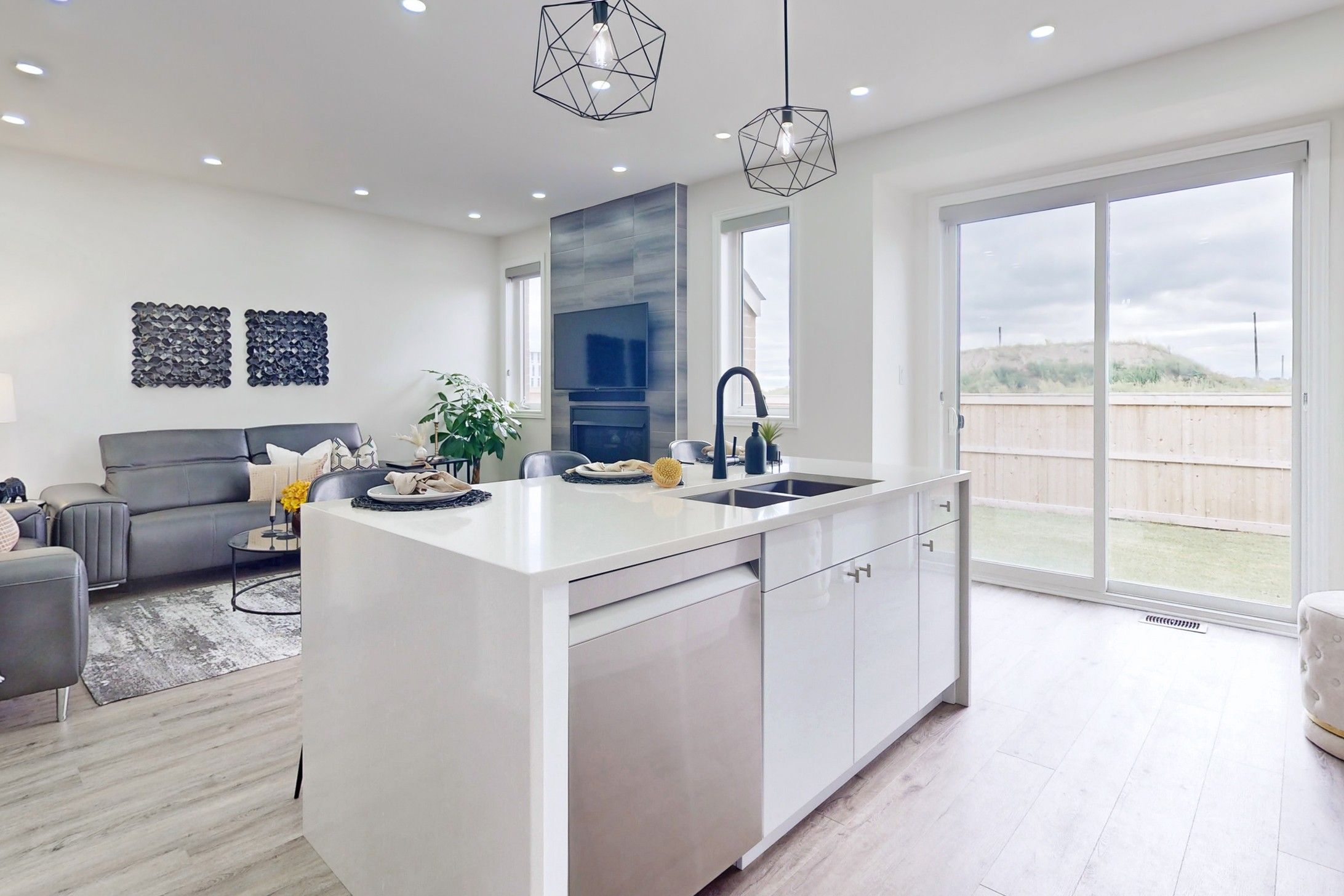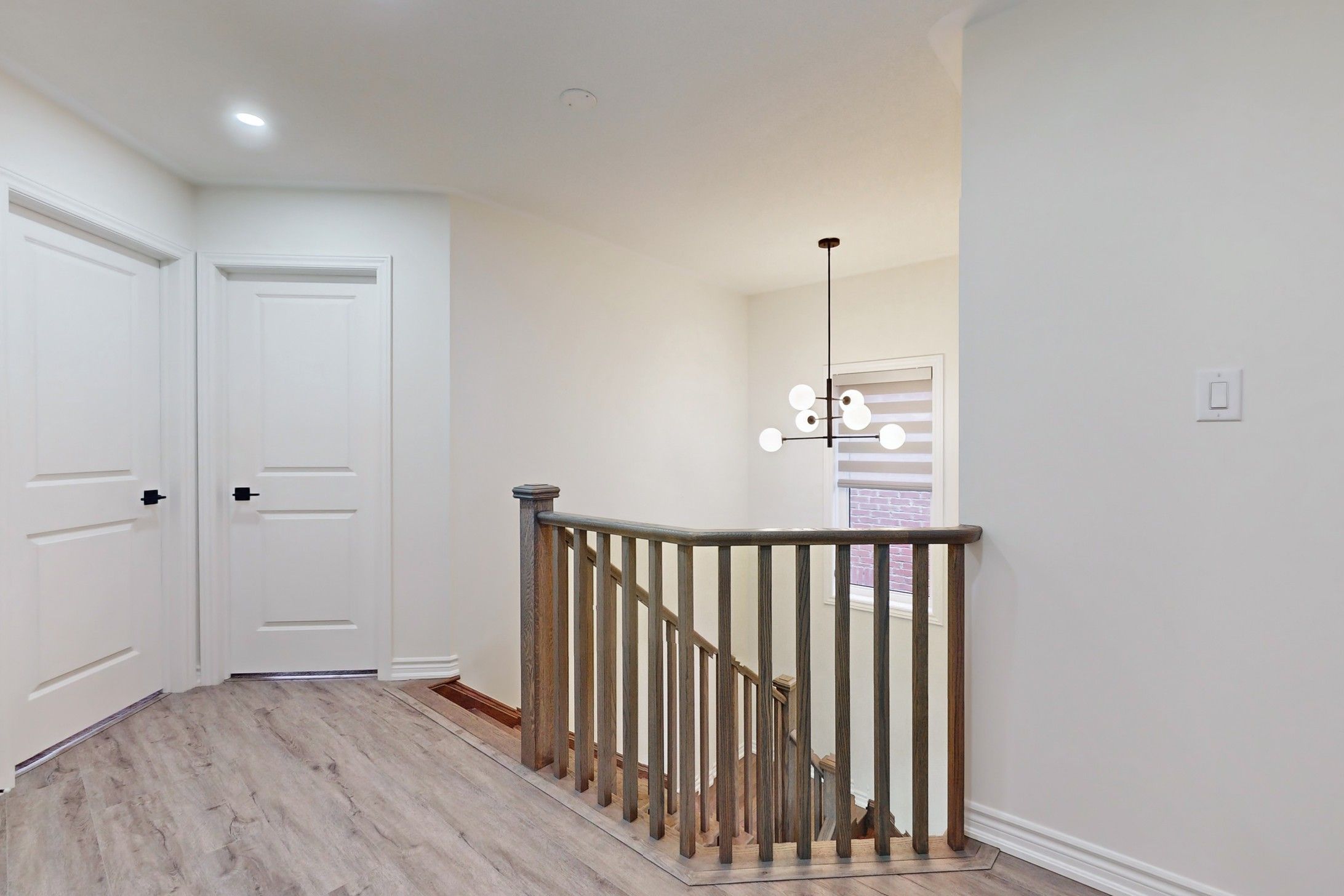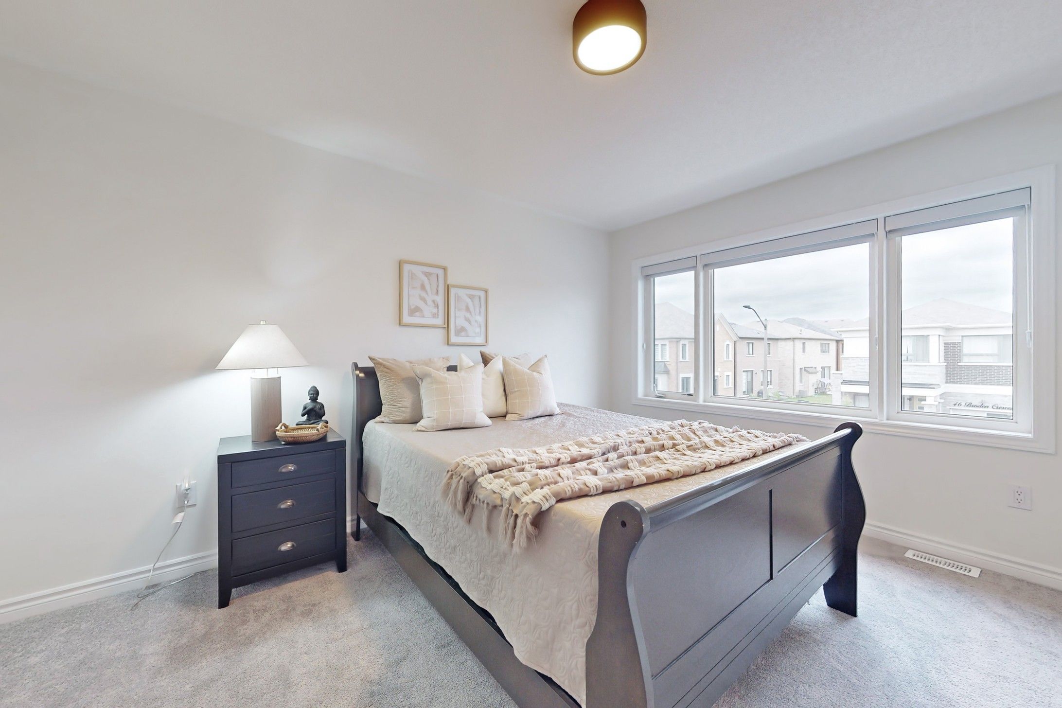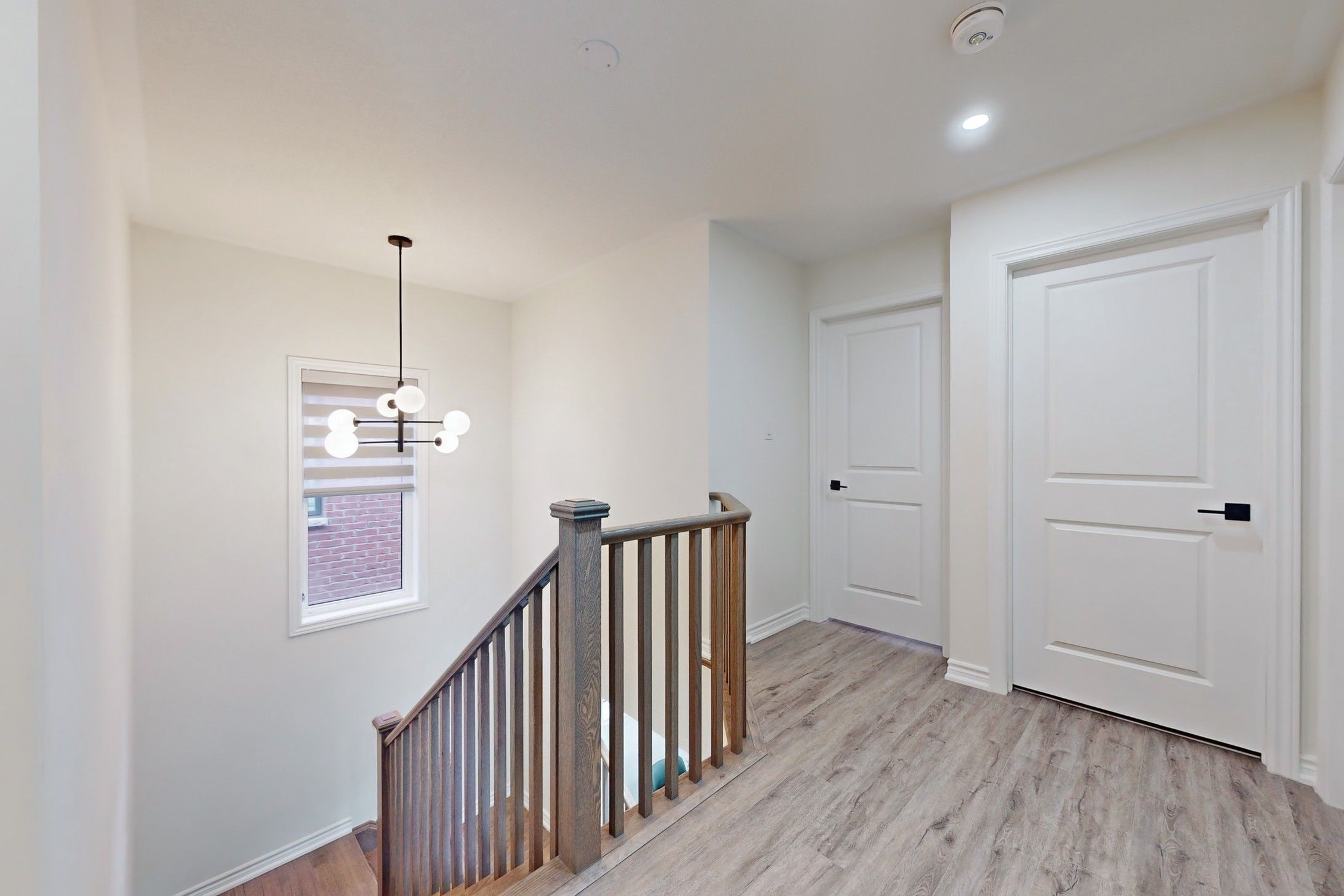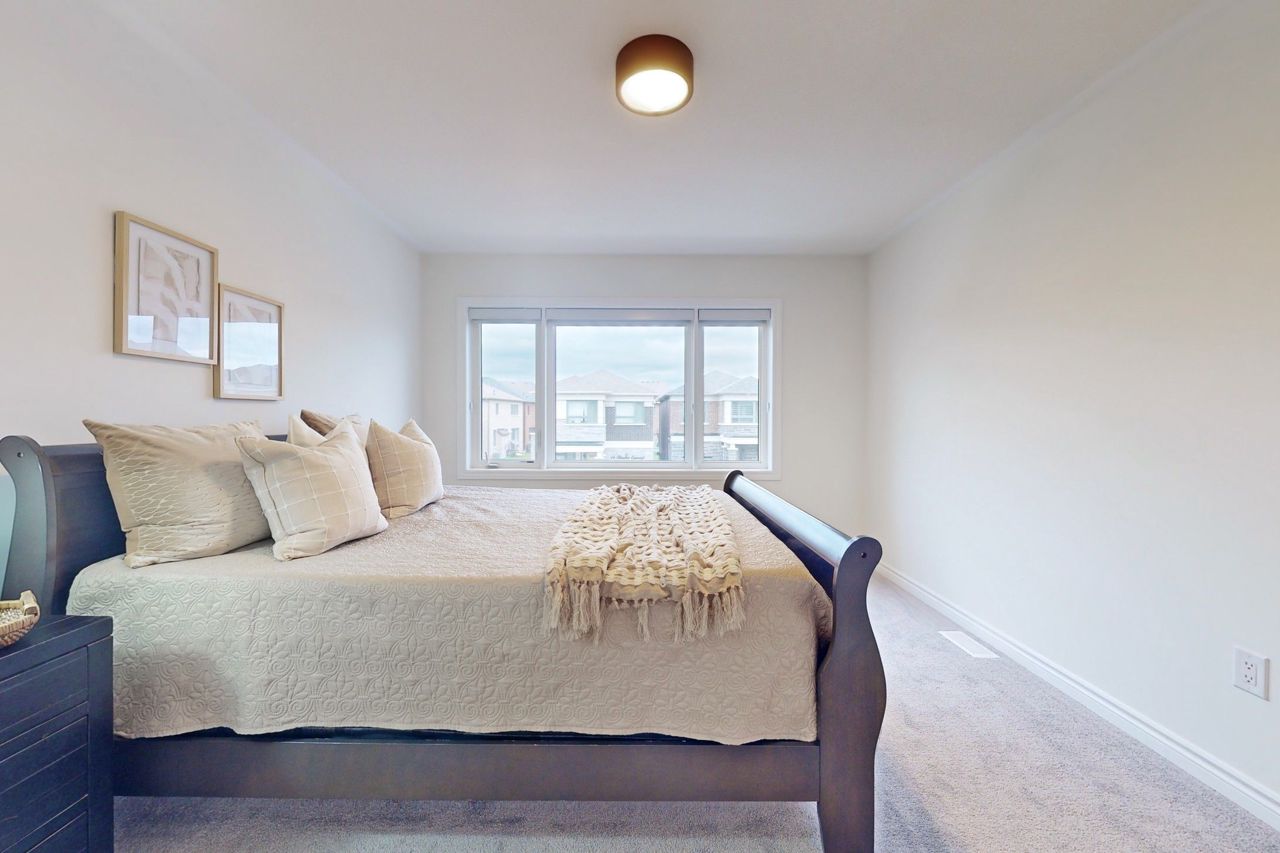 Welcome to Queens Common! Modern Elevation End Unit Townhome, Just Over 2 Years New. Approximately 1980 Sq.ft, Spacious Floor Plan And Over $85,000 Spent On Timeless Upgrades. Main Floor Foyer Greets You with Soaring Ceiling Heights of Almost 11 FT and Built-in Seating. Main Level has 9 FT Ceilings, Wide Plank Vinyl Flooring Throughout, Dining Room with Coffered Ceilings and Great Room with Tiled Wall Gas Fireplace. Large, Bright, Eat-In Chef's Kitchen, An Extended Waterfall Island, Quartz Counter Tops, Herringbone Backsplash, Countertop Gas Stove, Built in Microwave and Oven. Upgraded Oak Staircase Takes You To The 2nd Floor Hallway with Wide Plank Vinyl Floors, 3 Bedrooms, Laundry Room, And an Oasis Primary Room Featuring Wide Plank Vinyl Floor, Window Bench Seating to Read, Large Walk-In Closet, 5-Piece Ensuite, Freestanding Tub And a Frameless Glass Walk In Shower. Basement has 3 Piece Rough-In Plumbing. Less than 5 mins to the 401/412, Pharmacy, Grocery Stores and Tim's.