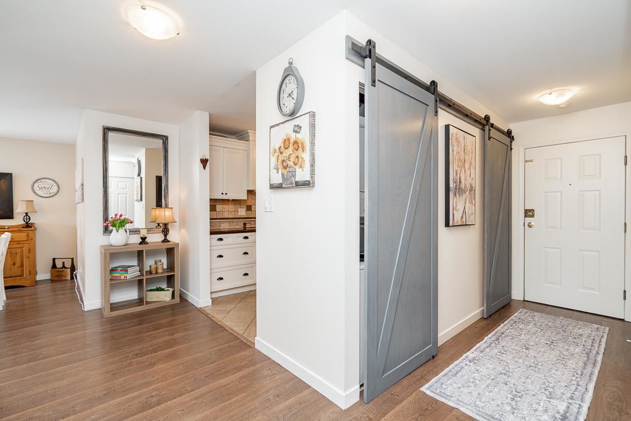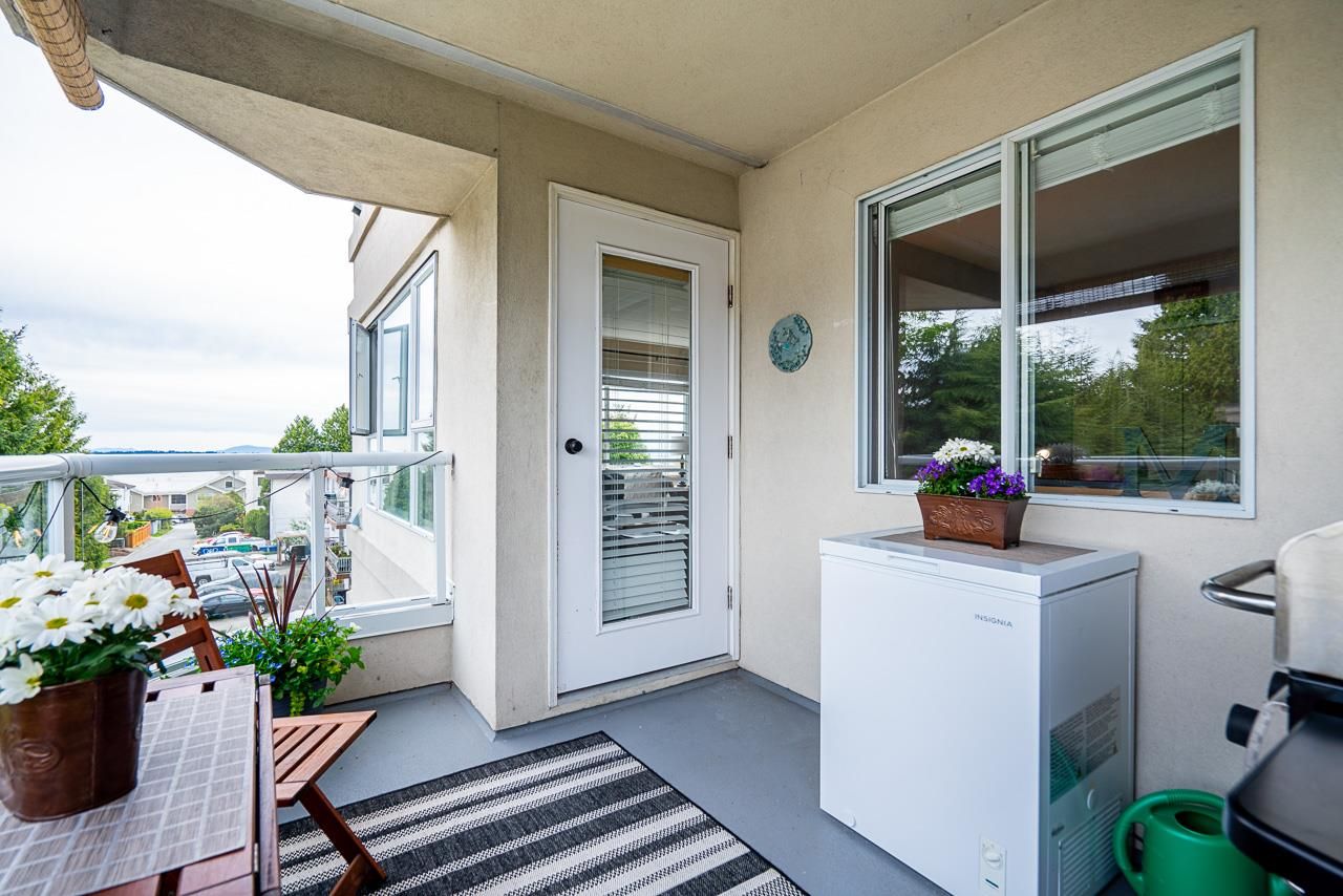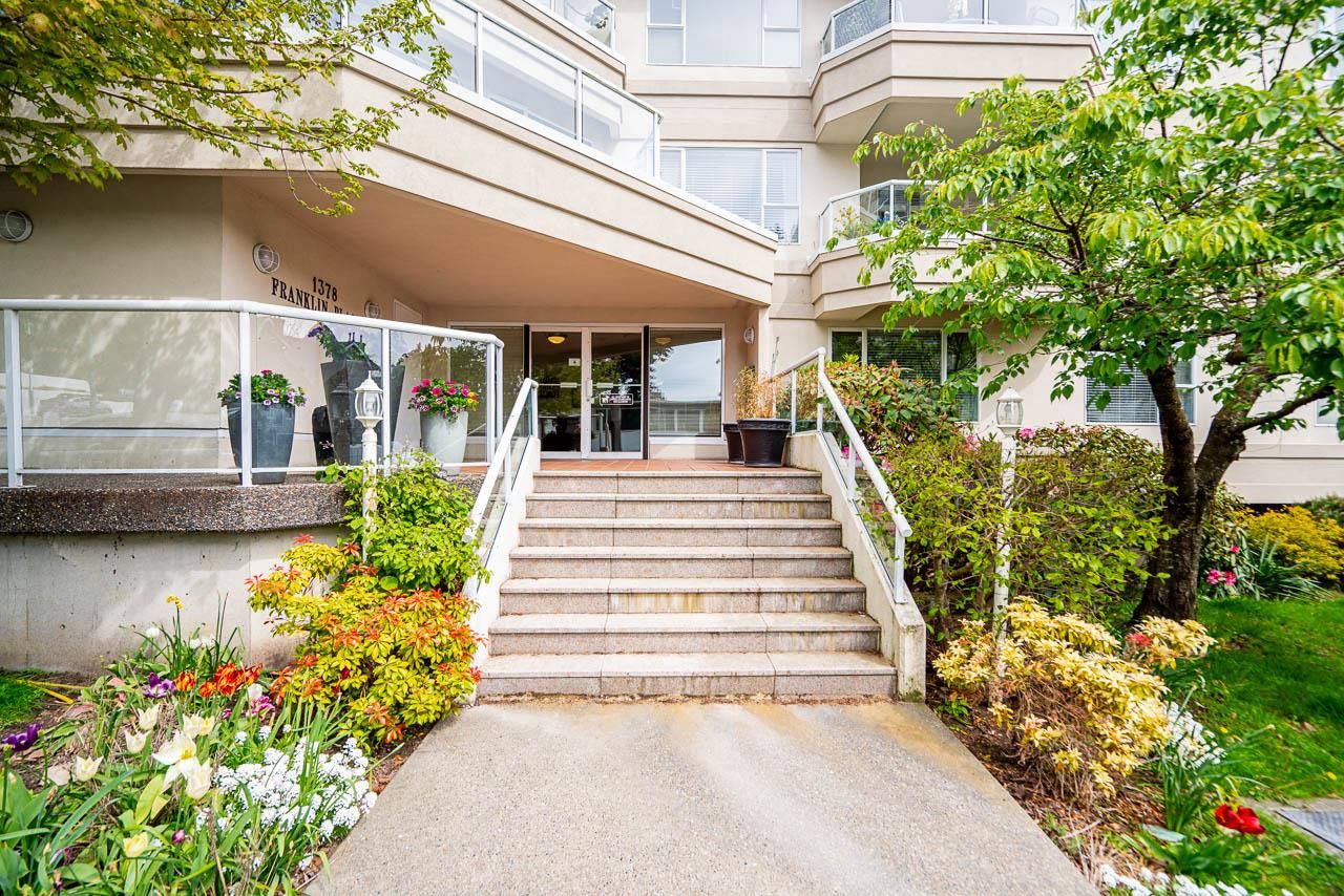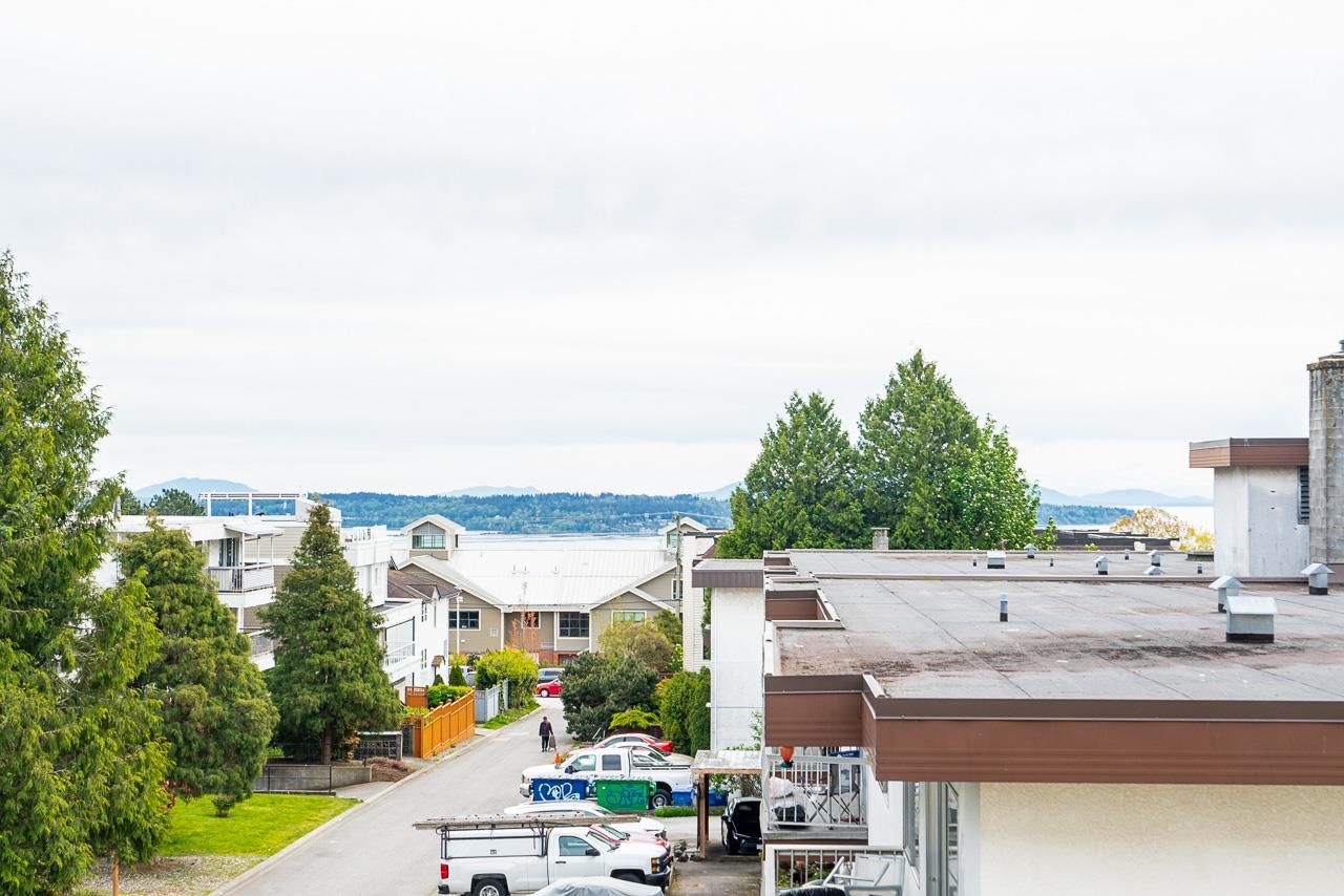 Welcome to Franklin Place- Prime location in the Heart of White Rock! This 2 bedroom 2 full bathroom condo is located in uptown White Rock where the beach is a short walk away. This south east corner unit boasts an excellent open floor plan with a view of the water from the living room and balcony. Its spacious master has been repurposed to give extra closet space and an office to really maximize your square footage. Updated floors, paint and recently renovated bathrooms as well as In suite laundry and tons of closet space. This awesome spot is no longer age restricted and allows for 1 pet (cat/dog, 18” at shoulder or 25lbs) and is walking distance to shops, restaurants, & White Rock Beach. Comes with 1 parking stall and 1 locker.