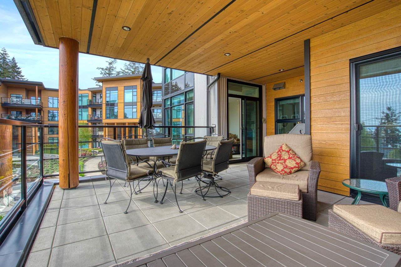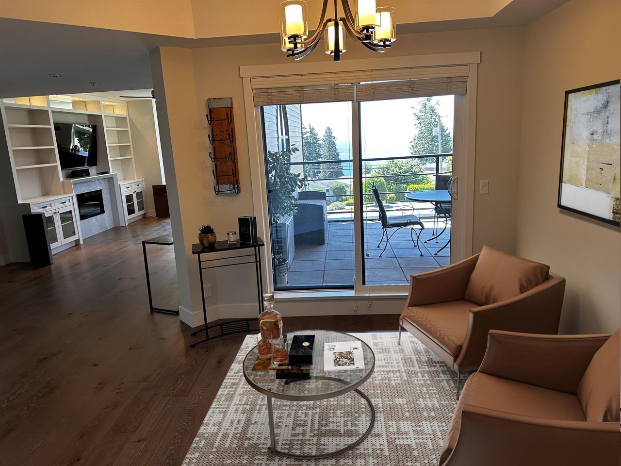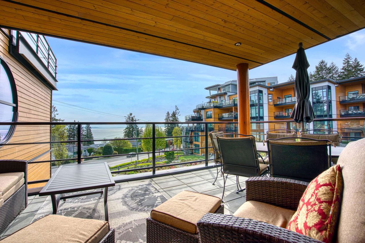 Welcome to The Royce! Nestled above the Semiahmoo Bay, your ocean view home awaits you! Beautifully landscaped gardens and tranquil setting will be your first intro to this elegantly designed building by Ackermann& Assoc. Unique to the area is the spaciousness of this home with over 2300 sq ft of luxurious living, 3 bdrm/Den (or 4th bdrm). Features include gourmet kitchen with high end S/S appliances, gas range, touch hood fan and wine fridge.eng wood floors throughout, air-conditioning, oversized quartz island, 2 large outdoor patios, 2 parking and 2 storage lockers that make this space feel more like a house than a condo.This home is vacant and ready for you. Walking distance to Uptown White Rock or down to the famous White Rock beach your new lifestyle awaits. pets allowed