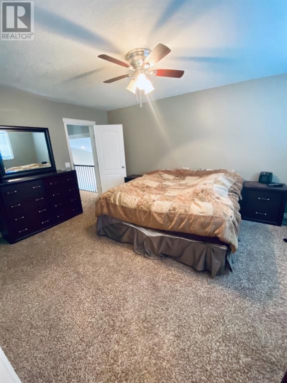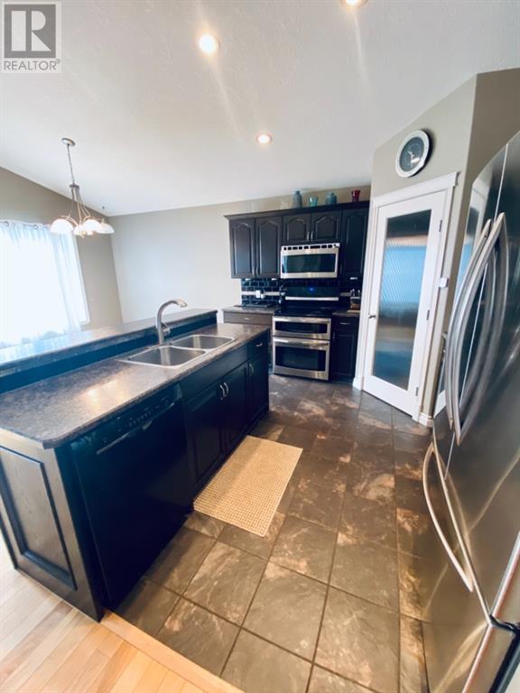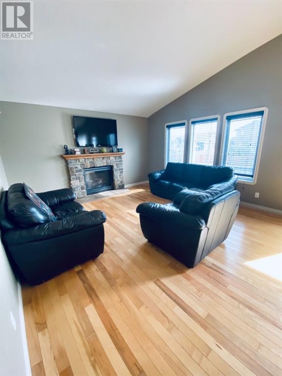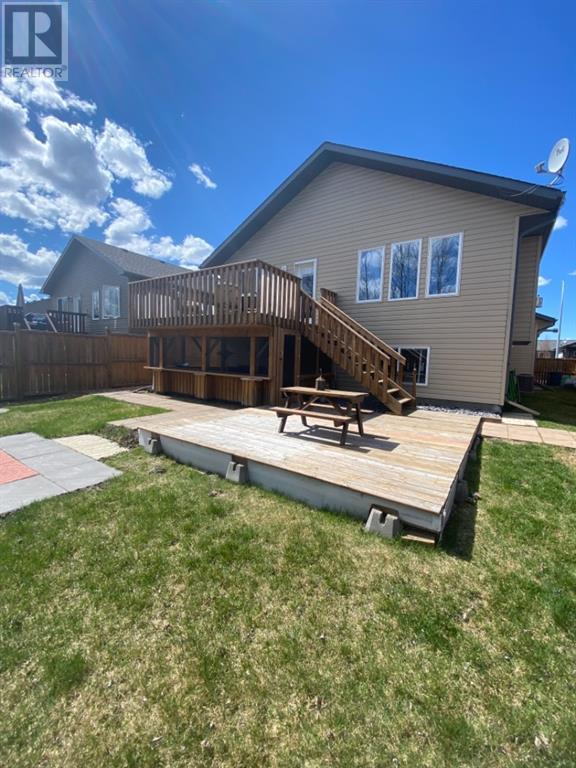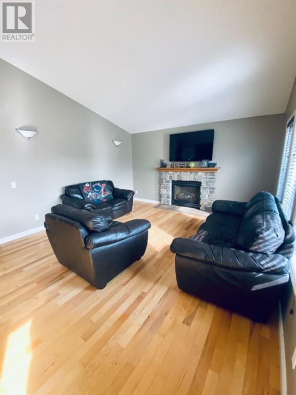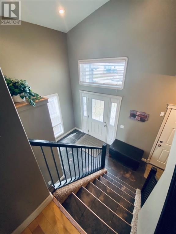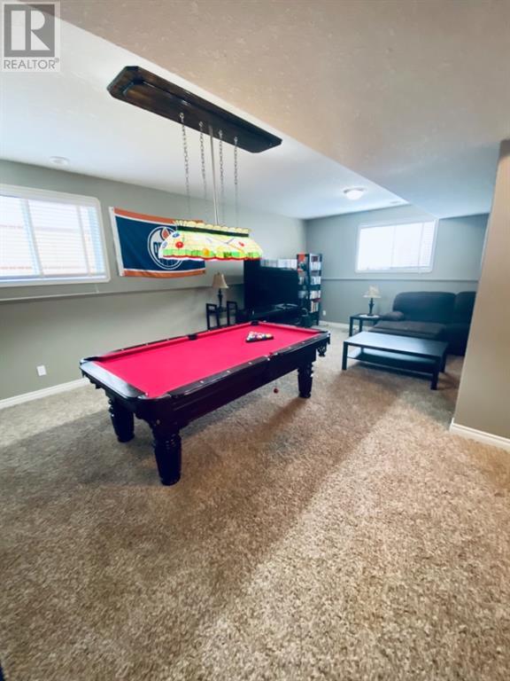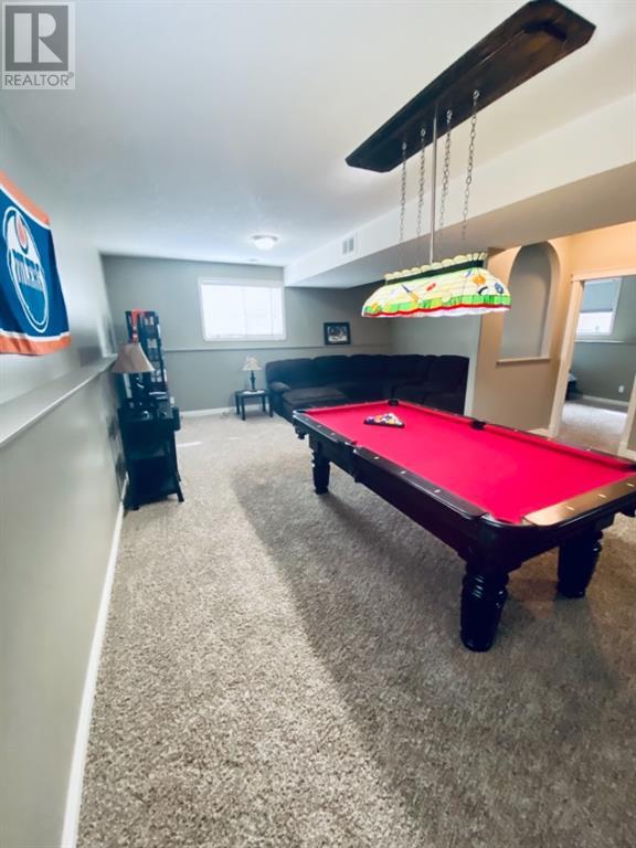 Beautiful 1424sqft modified bi level located close to schools, ball diamonds and more. The home boasts an amazing large entry with high vaulted ceilings. On the upper level secluded from the rest of the home, there is a huge master bedroom, 3pc ensuite and large walk in closet. On the main floor there are two bedrooms, and a 4 pc bathroom. The living areas boasts hardwood flooring and is open and bright, and with the high ceilings it will feel even more spacious. The kitchen has dark soft close cabinetry, a pantry, an eat in kitchen island, and the living room has a gas fireplace to enjoy. The garden doors off the dining room lead to the large south facing backyard, that has no neighbors directly behind. The two tiered deck gives you loads of privacy for you to host family gatherings, and the added bonus of this great backyard is the screened in area underneath the deck that allows you to utilize when its rainy or the mosquitoes are out. Downstairs there is a good sized bedroom, another 4 pc bathroom, laundry room, newer hot water tank and infloor heat The gorgeous rec room has all the space you will need for activities, and the pool table stays with the property. The home has air conditioning which is a must, and an attached 24x24 heated garage, with a new heater installed in 2023. This home is a must see!! (id:22211)