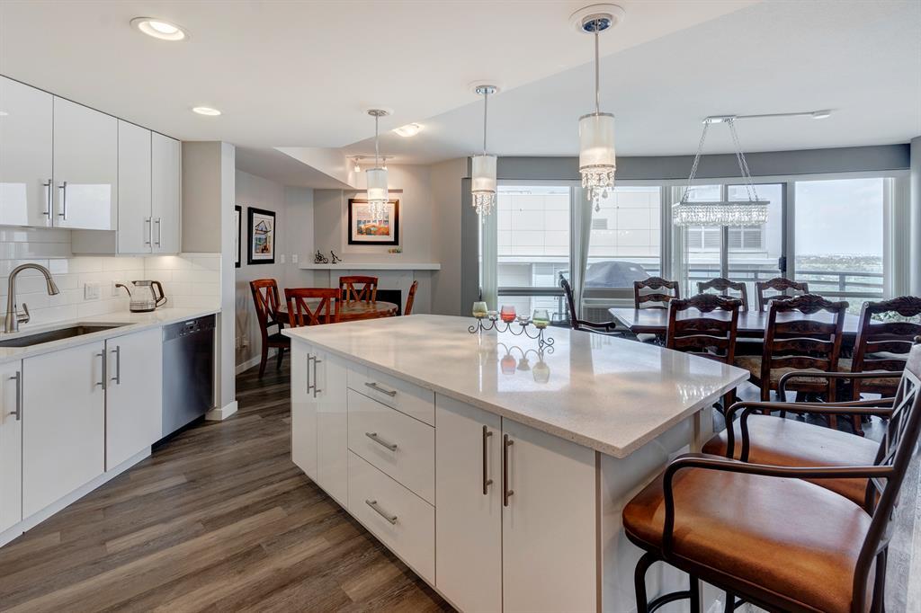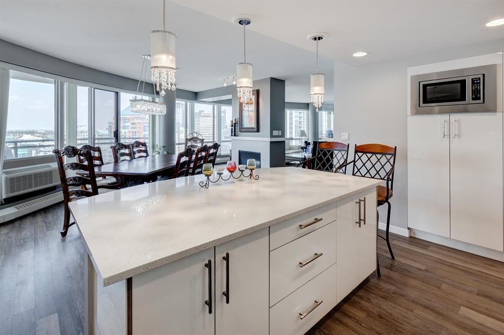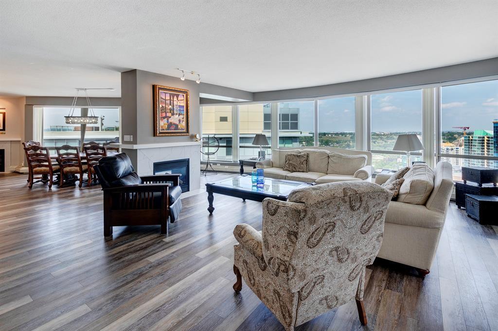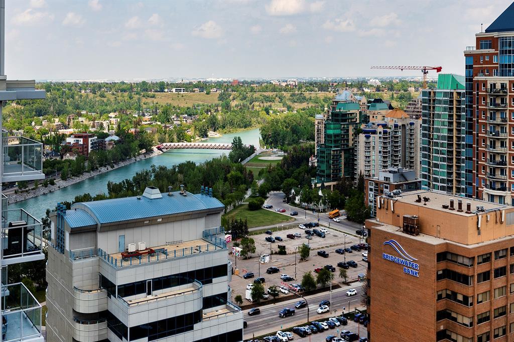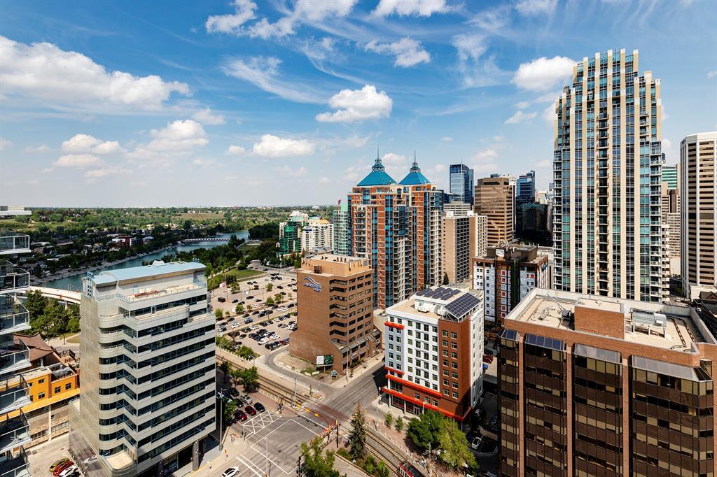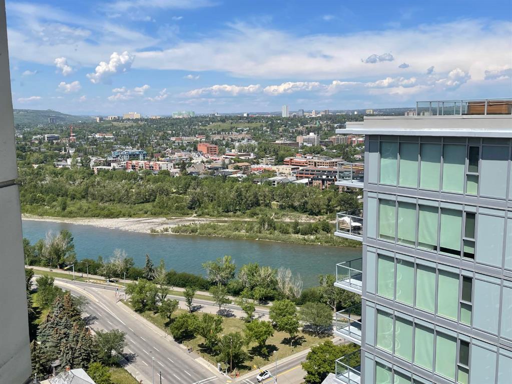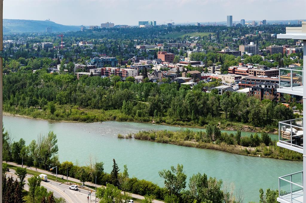 Fully Renovated Executive Suite with Stunning Views! This sensational condominium features 2 bedrooms + den/3 bedroom , 2.5 bathrooms with 2 parking stalls, 2 gas fireplaces, 3 balconies & almost 2,000 square feet of living space on one spacious level! Located in the popular West-end district of Calgary's downtown and steps away from the Bow River Pathway system. The modern fully renovated kitchen is open to the living & dining area - making the perfect space for entertaining. Luxury vinyl plank flooring flows throughout the entire condo with the exception of the tile floor in the bathrooms. The expansive living space has a flex area, full living room & a large private den (easily be converted to a third bedroom) - all with full height windows allowing for natural light to flow through the day. Master bedroom is at the East end of the condo & complete with a full 5 pc en-suite, custom closets & a private balcony that captures morning sun. The second bedroom is complete with it's own full en-suite & there is a powder room for guests. The building is completed with a concierge service that assists with package deliveries and dry cleaning - adding safety and convenience to your daily living. The McLeod also features 'concrete envelope construction', with concrete walls between adjoining suites for sound insulation and fire safety. Swimming pool, fully equipped exercise room, party room with kitchen and pool table. Easy access to the LRT, walking distance to Kensington, Eau Claire and Prince's Island. One block from the river path. Don't miss out on this great opportunity to own a luxurious executive condo in the very secure, very popular McLeod at Riverwest! (id:22211)