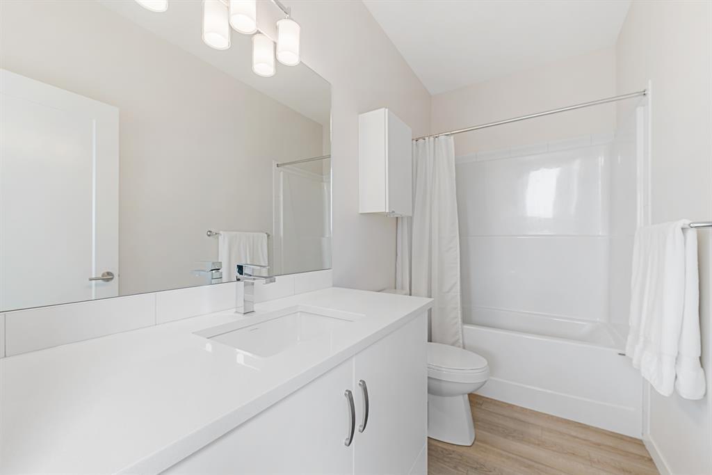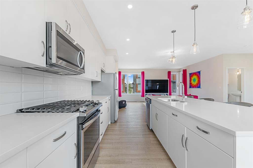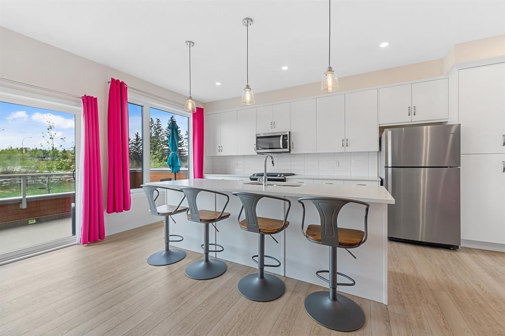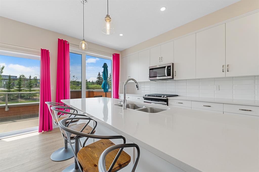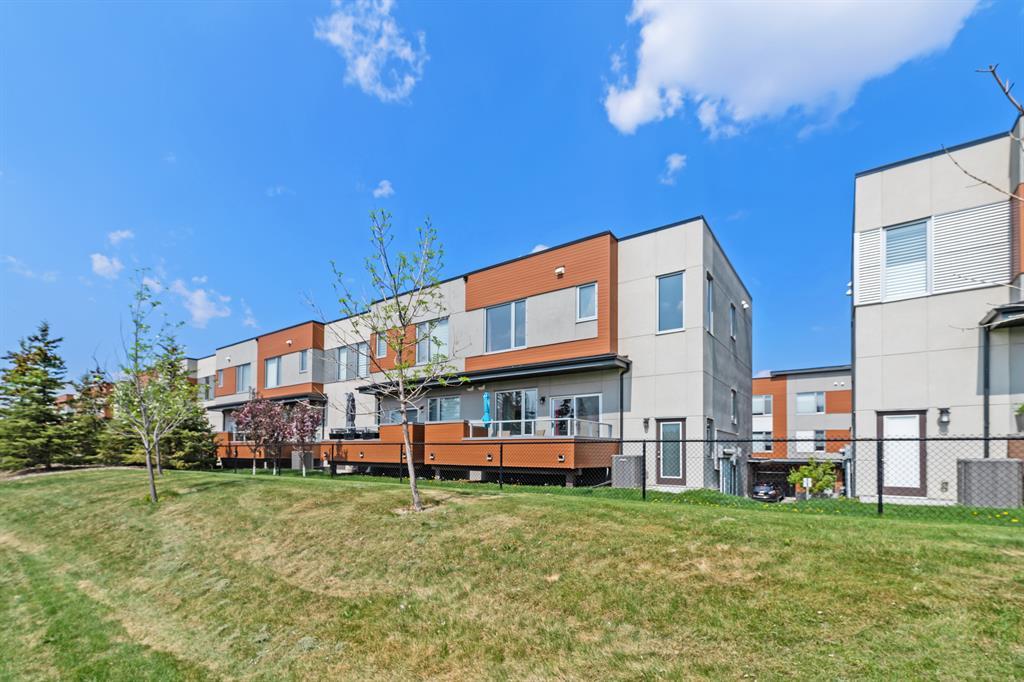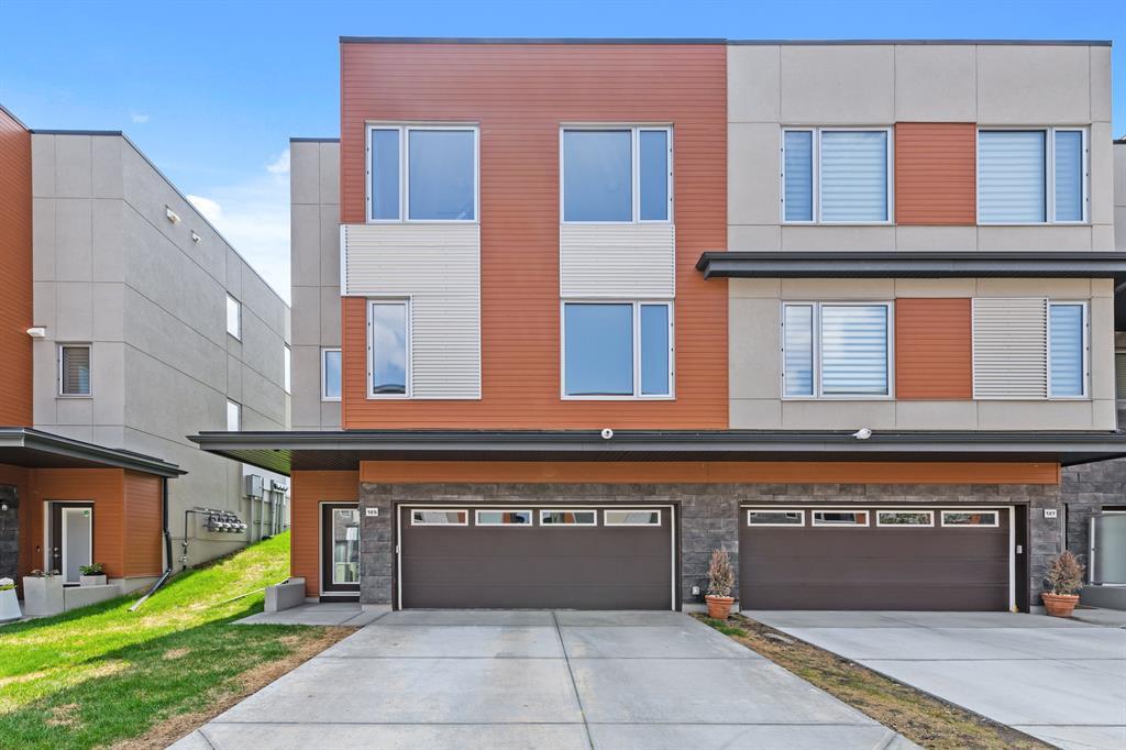 Welcome to Fish Creek Exchange in Shawnee Slopes, one of the new, hot SW communities. This like new executive townhouse (end unit) is in the heart of the development. Everything you could possibly want is walking distance from this community. Mere steps to Fish Creek Provincial Park for your daily walks and Fish Creek /Lacombe LRT Station to get to work or anywhere in the city for that matter. Other amenities, including a grocery store, restaurants, coffee shops, are a walk away or big box stores a quick drive away. This townhome features clean lines and modern touches throughout. In immaculate condition with neutral décor, there are 3 bedrooms and 2.5 bathrooms of air-conditioned luxury. The finished double attached garage plus the concrete driveway could park 4 vehicles (if required). This home is flooded with natural light (multiple oversized windows), airy and peaceful with a lovely little park behind the home that you can view from your south facing maintenance free deck (no neighbours behind you). 9’ knock down ceilings and neutral luxury vinyl plank flooring contribute to the modern feel throughout. The heart of the home, the upgraded kitchen, features a 9’ quartz island and countertops, with pendant lighting as well as plentiful over-height mission white cabinets. There are pot lights, a built in pantry, plenty of drawers and a Whirlpool stainless appliance package featuring a gas range. This home with 1660.39 square feet, includes the living room, with cable outlets on 3 walls, allowing ample space for any furniture configuration you prefer. A 2 piece powder room completes this level. The upper level includes a king sized primary bedroom with an upgraded ensuite featuring a raised vanity with double sinks and large shower with built-in seat. There is also a huge walk-in closet with plenty of shelving and hanging space. The other two bedrooms are bright, spacious and have double sliding door closets. The main bathroom incudes a high pro file vanity and deep soaker tub. The laundry area is also conveniently located on this upper level. Truly a beautiful home, call to view today, you won’t be disappointed. (id:22211)