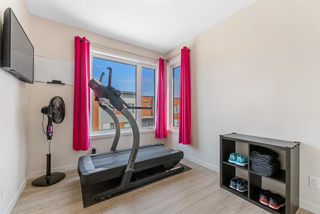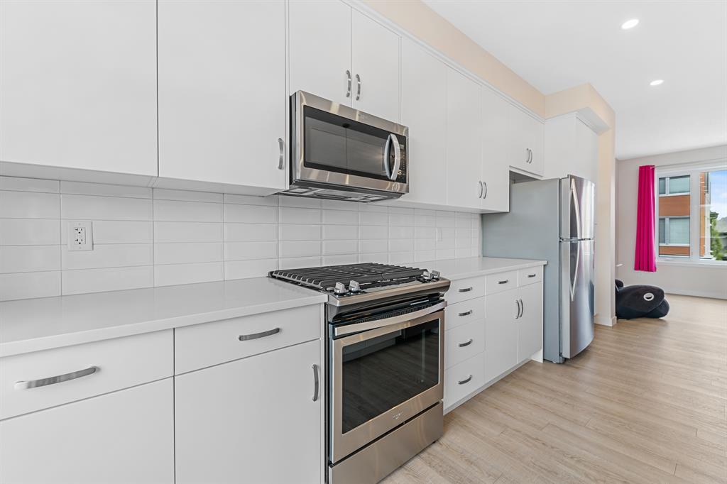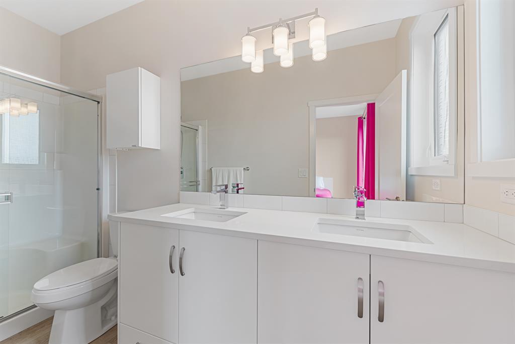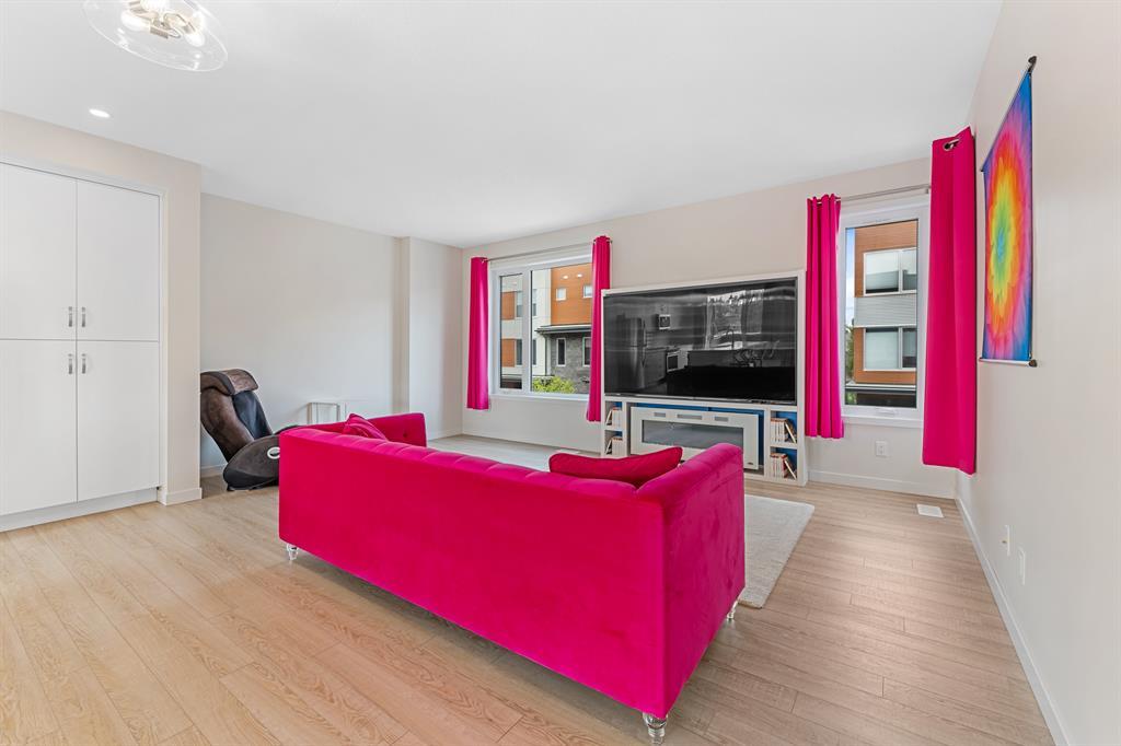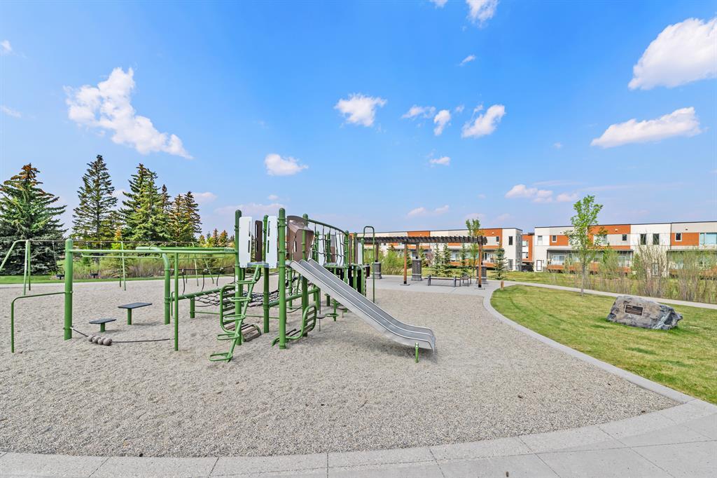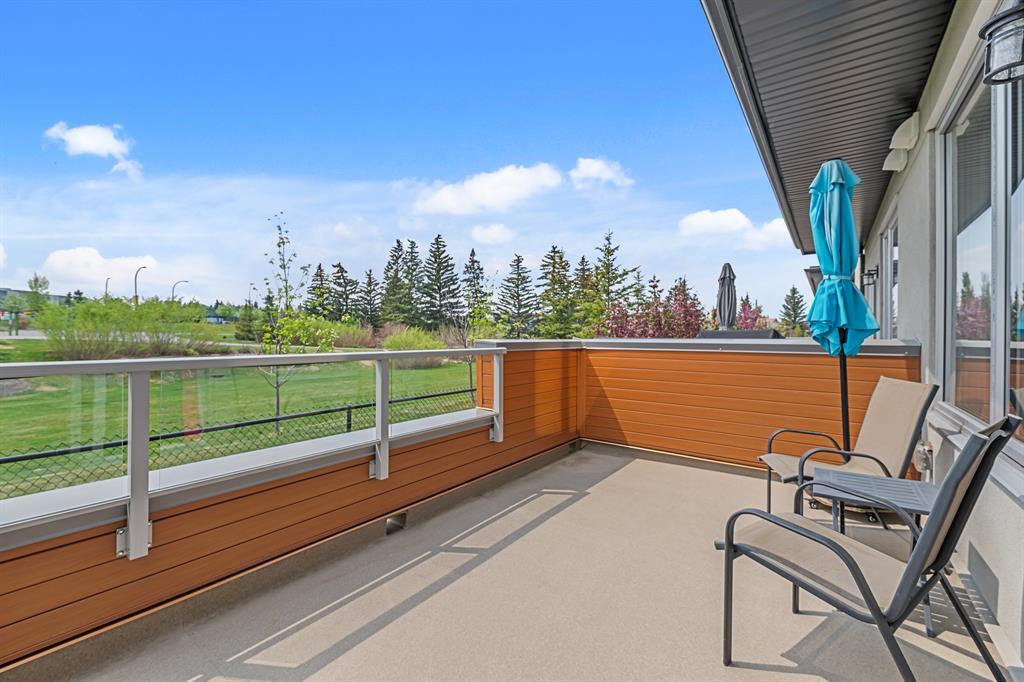 Welcome to Fish Creek Exchange in Shawnee Slopes, one of the new, hot SW communities. This like new executive townhouse (end unit) is in the heart of the development. Everything you could possibly want is walking distance from this community. Mere steps to Fish Creek Provincial Park for your daily walks and Fish Creek /Lacombe LRT Station to get to work or anywhere in the city for that matter. Other amenities, including a grocery store, restaurants, coffee shops, are a walk away or big box stores a quick drive away. This townhome features clean lines and modern touches throughout. In immaculate condition with neutral décor, there are 3 bedrooms and 2.5 bathrooms of air-conditioned luxury. The finished double attached garage plus the concrete driveway could park 4 vehicles (if required). This home is flooded with natural light (multiple oversized windows), airy and peaceful with a lovely little park behind the home that you can view from your south facing maintenance free deck (no neighbours behind you). 9’ knock down ceilings and neutral luxury vinyl plank flooring contribute to the modern feel throughout. The heart of the home, the upgraded kitchen, features a 9’ quartz island and countertops, with pendant lighting as well as plentiful over-height mission white cabinets. There are pot lights, a built in pantry, plenty of drawers and a Whirlpool stainless appliance package featuring a gas range. This home with 1660.39 square feet, includes the living room, with cable outlets on 3 walls, allowing ample space for any furniture configuration you prefer. A 2 piece powder room completes this level. The upper level includes a king sized primary bedroom with an upgraded ensuite featuring a raised vanity with double sinks and large shower with built-in seat. There is also a huge walk-in closet with plenty of shelving and hanging space. The other two bedrooms are bright, spacious and have double sliding door closets. The main bathroom incudes a high pro file vanity and deep soaker tub. The laundry area is also conveniently located on this upper level. Truly a beautiful home, call to view today, you won’t be disappointed. (id:22211)