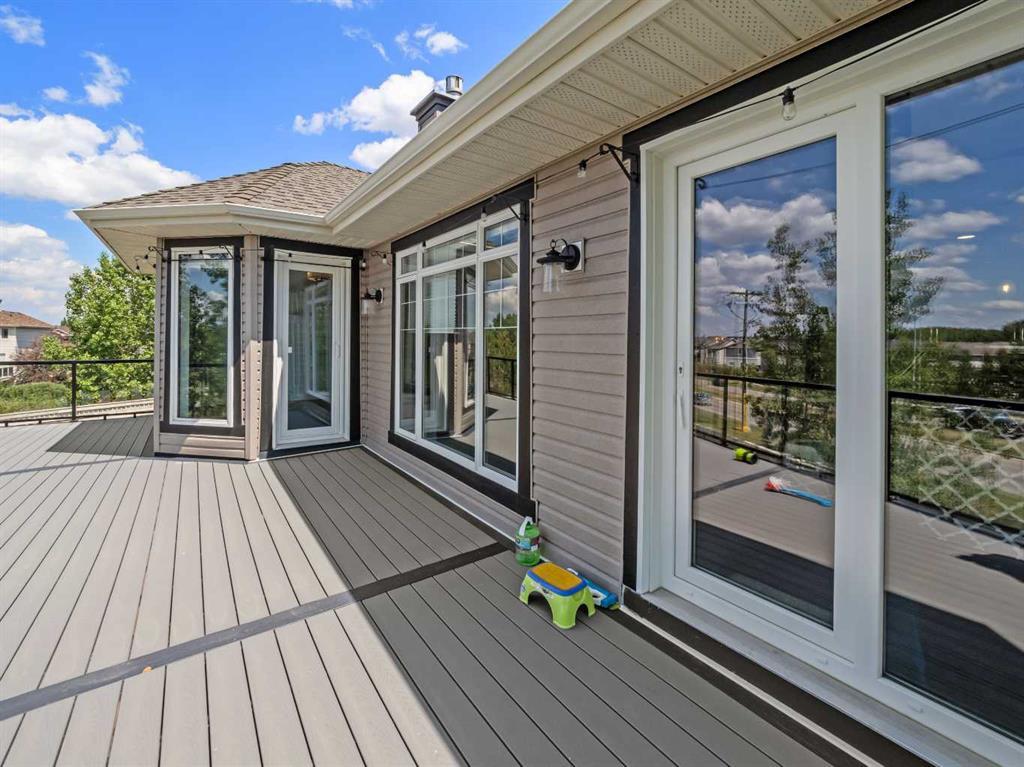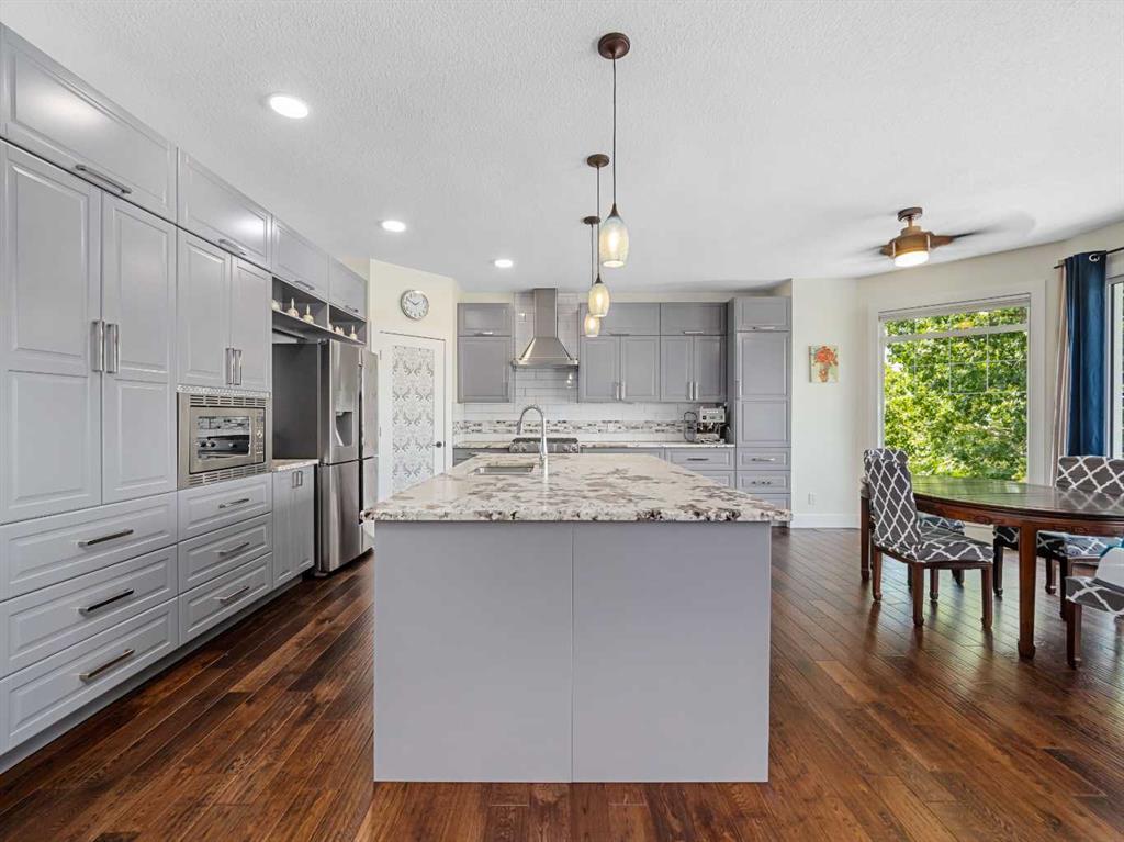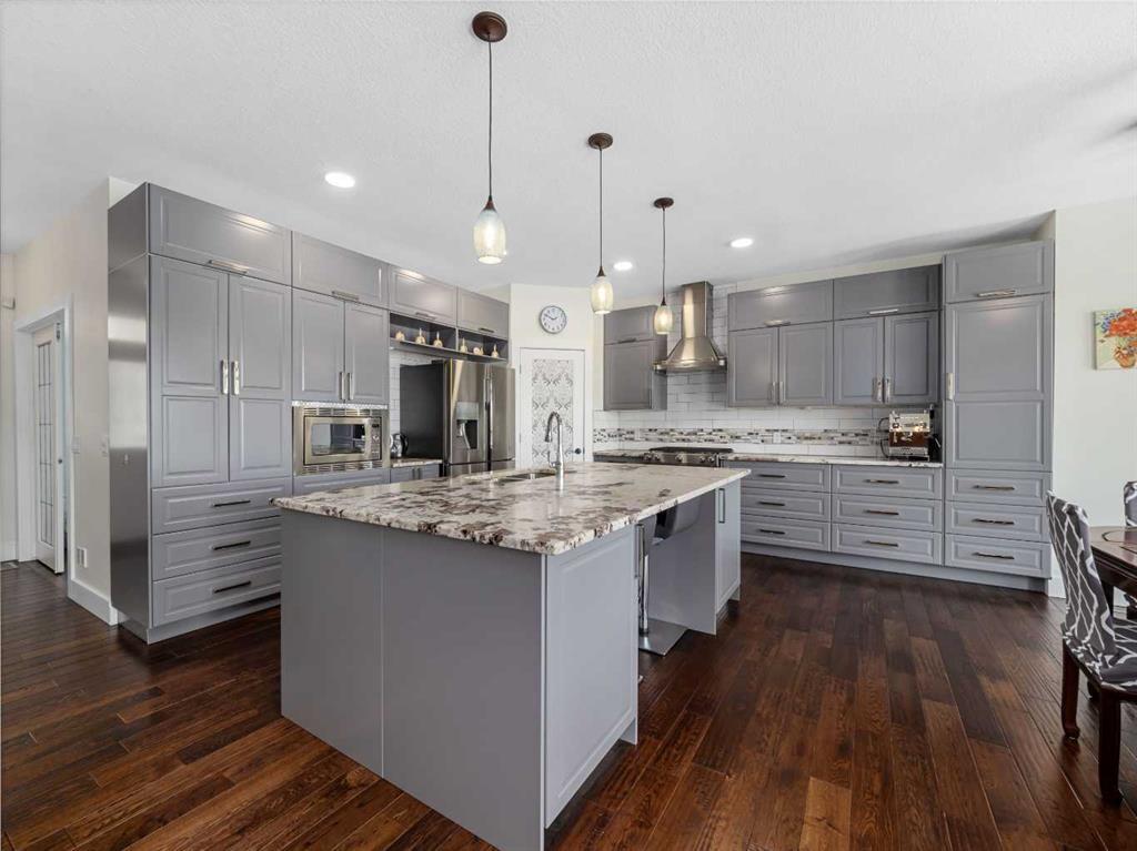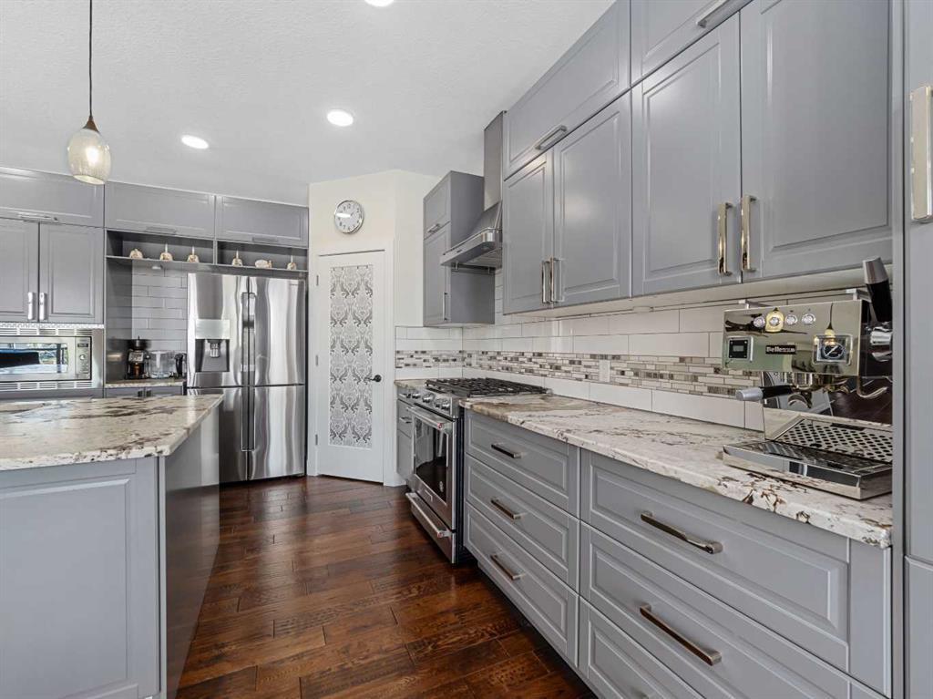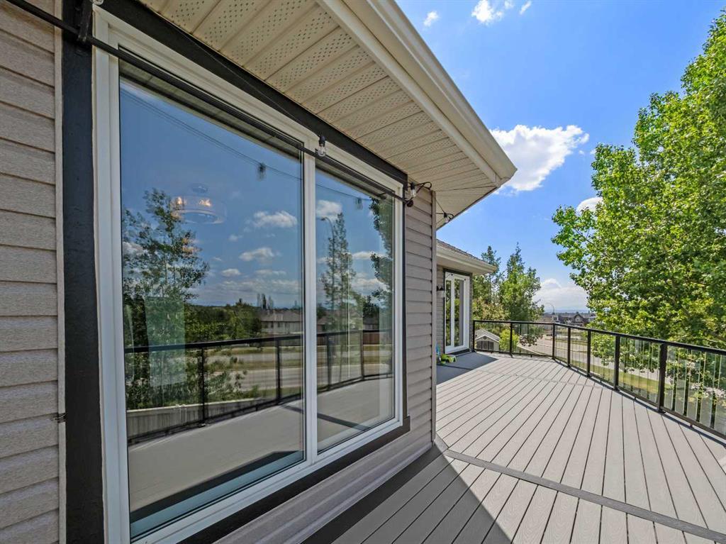 Look No further! Here's your next high-end and cozy dream home you've been searching for! Executive WALKOUT Bungalow with FULLY Finished Basement in the sought-after NW community Royal Oak! The Completely RENOVATED house has WEST Sunny Backyard. The huge pie LOT is professionally landscaped (LOT size: 9030sqft). The remarkable home also boasts Spectacular mountain VIEWS, large open concept spaces and tons of custom finishes and In-floor heated THREE-CAR GARAGE. Large den/office, formal dining room or used as bedroom at the front of the house. Spacious custom kitchen with handpicked, leathered granite countertops, built-in high-end stainless-steel appliances (Miele, Samsung, Kitchenaid), Double-sided fireplace, and many large windows letting in both an abundance of light and the amazing views! The main floor master suite includes a HUGE spa-like ensuite bathroom with a giant, custom shower, a standalone soaker tub, double vanities with granite countertops, a private water closet, HUGE walk-in closet, and additional insulation in the floors and walls (spray foam and Roxul) keeping it both warm and quiet in your private retreat. The rear mud room is just off the garage and offers a private ½ bath, large closets, and custom feature wall. The walkout basement has a large rec space with wet bar area, TWO large bedrooms with walk-in closets, another FULL bath, and a designated laundry area. Another cool feature is a large, fully tiled storage room under the stairs, equipped with its own motion-censored ventilation and lighting system. So many upgrades include Air Conditioning, Central Vacuum system, In-Floor glycol heating throughout basement and garage, custom motored Hunter Douglas blinds, high-end light fixtures, keyless entry and electric doorbell, heated towel rack, irrigation system, alarm system wired, European tilt and turn doors (downstairs exterior x 2, master bedroom, and main room deck doors), newer windows in some areas, and an EXPENSIVE, maintenance free Trex composite second story deck. An energy-efficient Sync water heater, furnace, and heat exchanger were added from Gradient Thermal. The home is truly unique and has been lovingly designed and well maintained. Short walking distance to all the schools, playgrounds, community center and other amenities. Drive 3 minutes or Walk 15 minutes (1.9Km) to LRT station and Shane Homes YMCA at Rocky Ridge. 5 Minutes drive to Royal Oak shopping centre, Walmart etc. ACT NOW before it's gone! (id:22211)