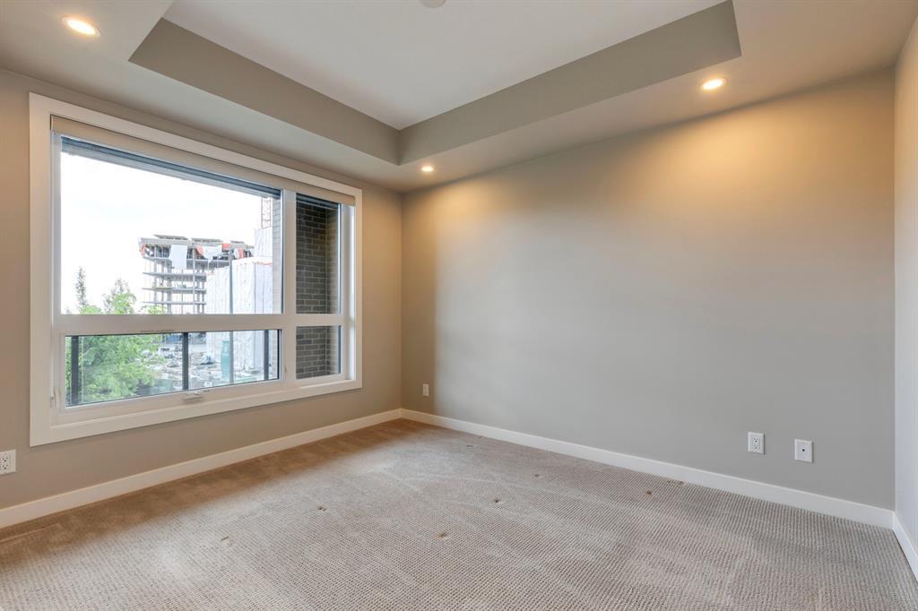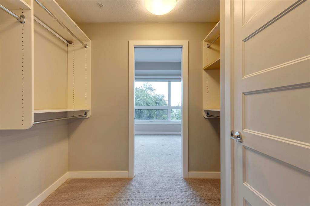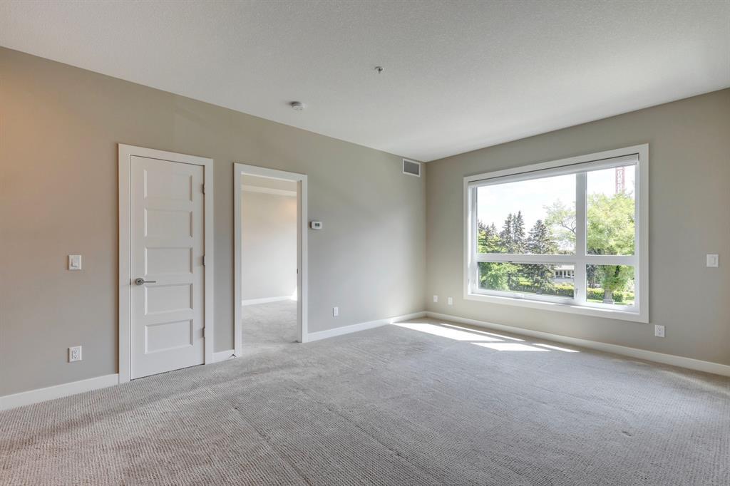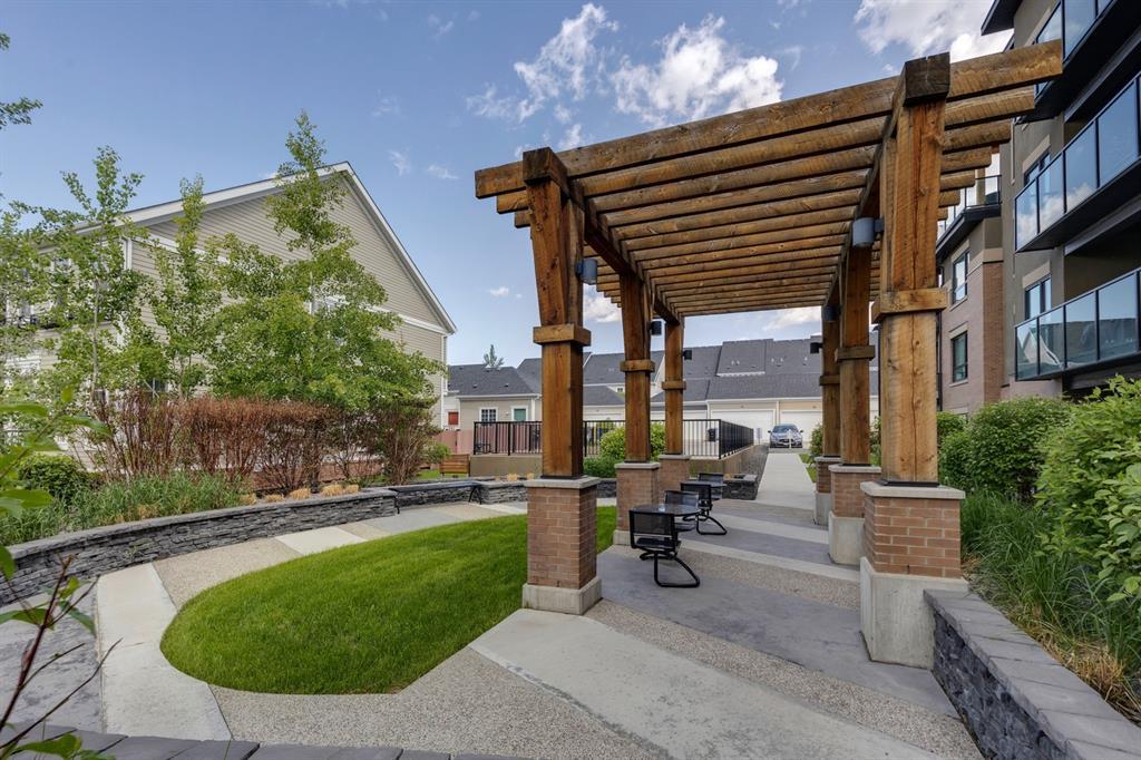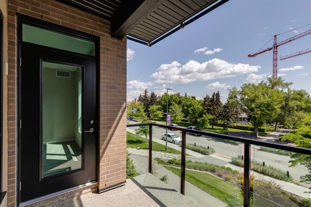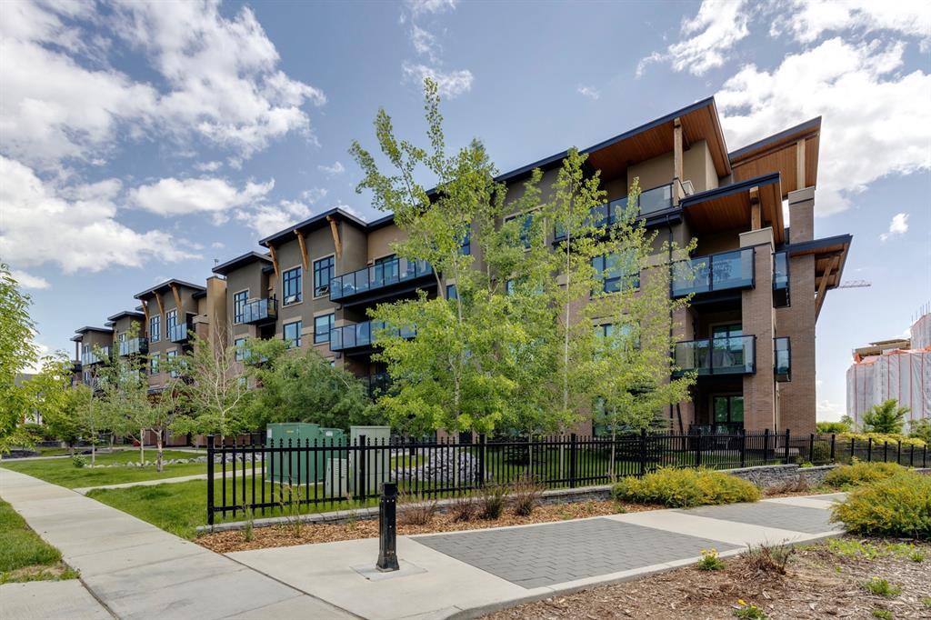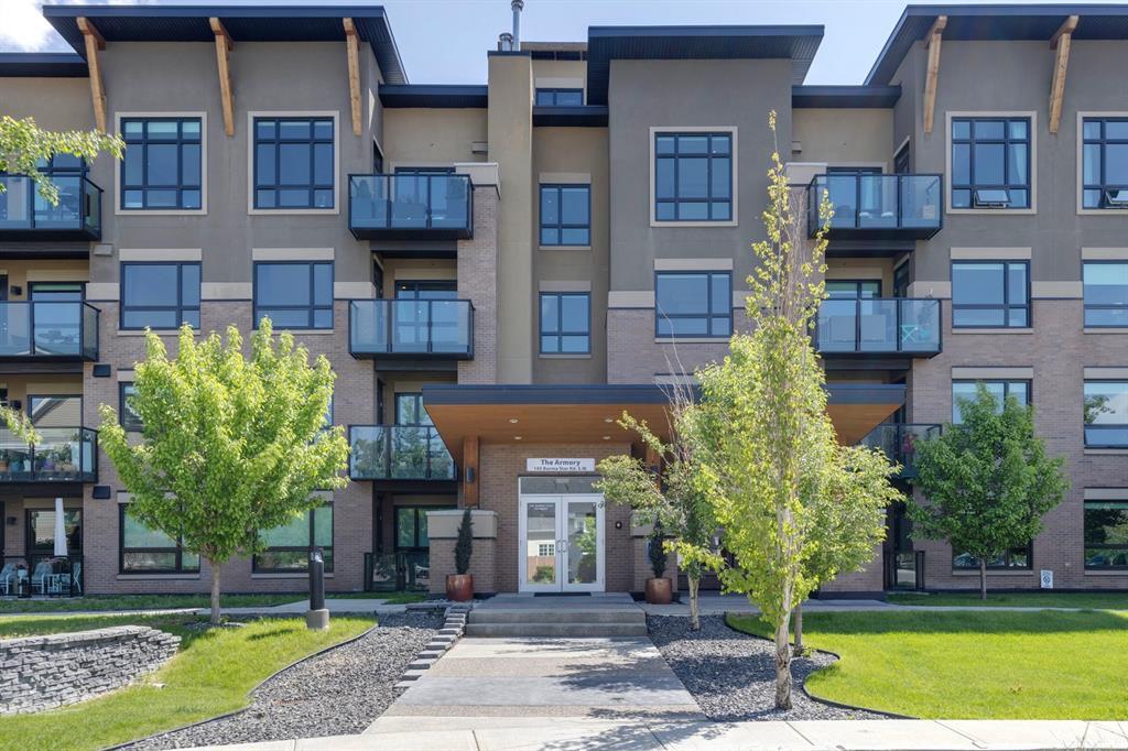 Welcome to The Armory in the vibrant, Historic community of Currie Barracks, home to many of Calgary's small businesses, restaurants and services, miles of bike and walking paths, acres of parks and green spaces and only a 7 minute commute to downtown. Beautiful and bright, this 2 bedroom plus den condo has the perfect view from the main living area and deck overlooking the Officers Mess Garden. 9 foot ceilings create an open feeling and the massive windows allow the light to pour in. Kitchen with upgraded appliance package is thoughtfully laid out and 2 large bedrooms situated on opposite sides of the living space each with their own bathroom and walk through closets. A quiet secluded den perfect for home office. Titled parking PLUS massive titled storage area built at the top of the parking spot (not just a wall cage). Only pay your electricity, cable. internet as all other utilities are included. Unit is fully air conditioned. (id:22211)