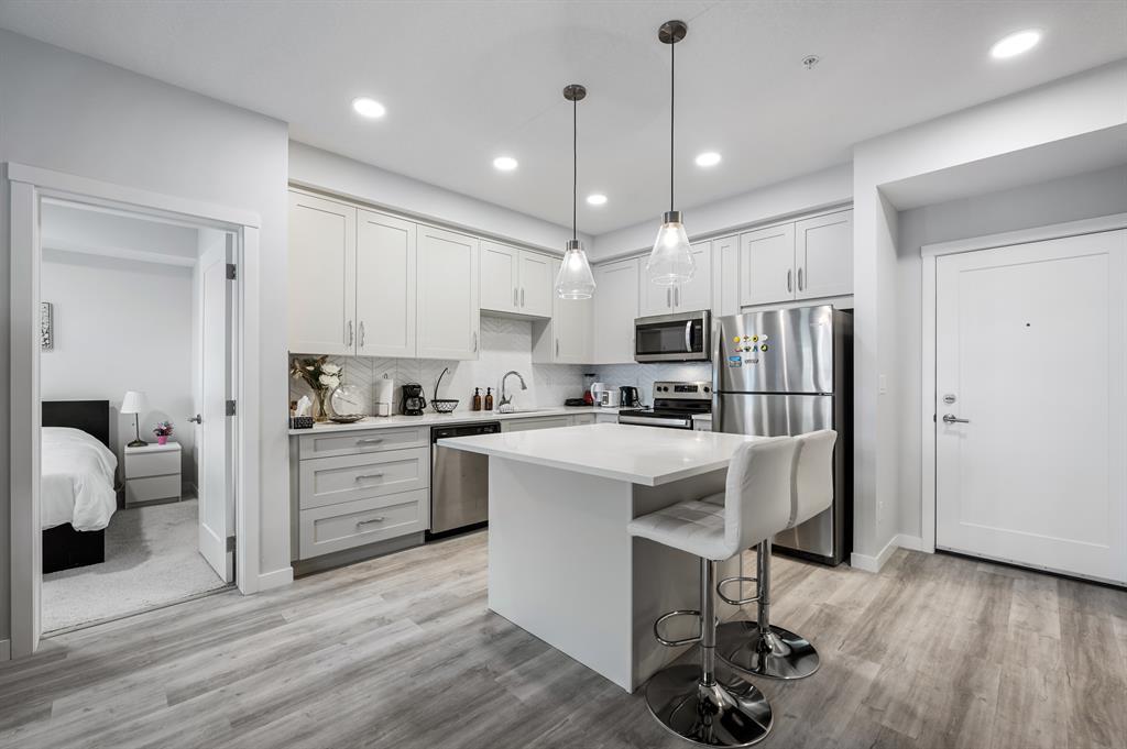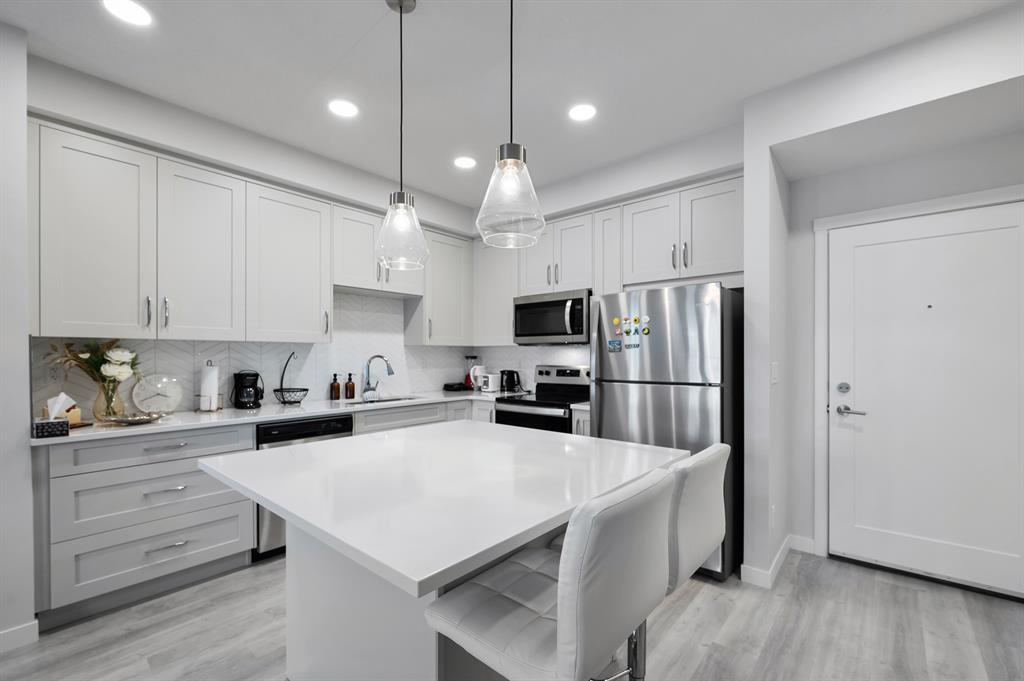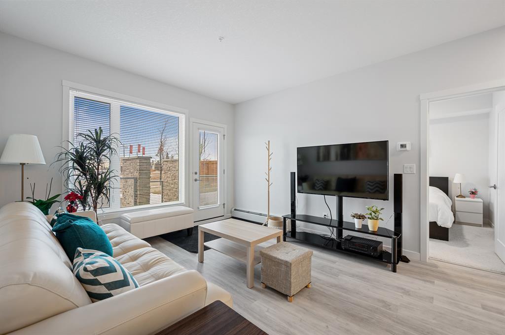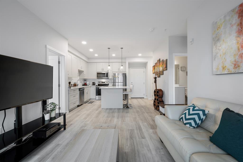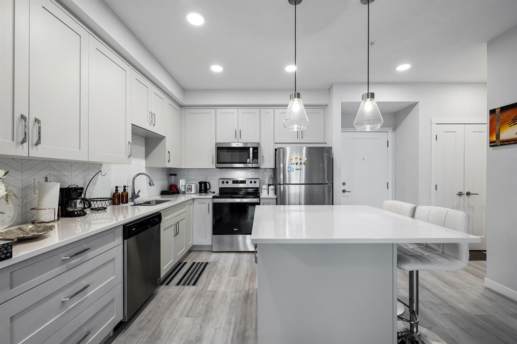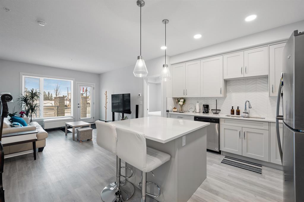 Introducing a brand-new condo in Shawnee Slopes, offering nearly 800 sqft of living space. Step inside to discover a spacious open floor plan that creates an inviting atmosphere. The kitchen boasts modern stainless steel appliances, elegant white cabinetry, quartz countertops, and a convenient island with a cozy eating nook. Transitioning seamlessly, the kitchen flows into the living room, highlighted by large windows that flood the area with abundant natural light. With its ground floor location, you have direct access in and out of the unit through the patio door, just off the living room. The primary suite is enhanced by a generous walk-in closet and a stylish 3-piece ensuite. Additional features of this unit include a second bedroom, a well-appointed 4-piece bathroom, and convenient in-suite laundry. Situated with easy proximity to Macleod Trail, Fish Creek Park, shopping, dining, and much more, this condo offers a fantastic lifestyle opportunity. (id:22211)