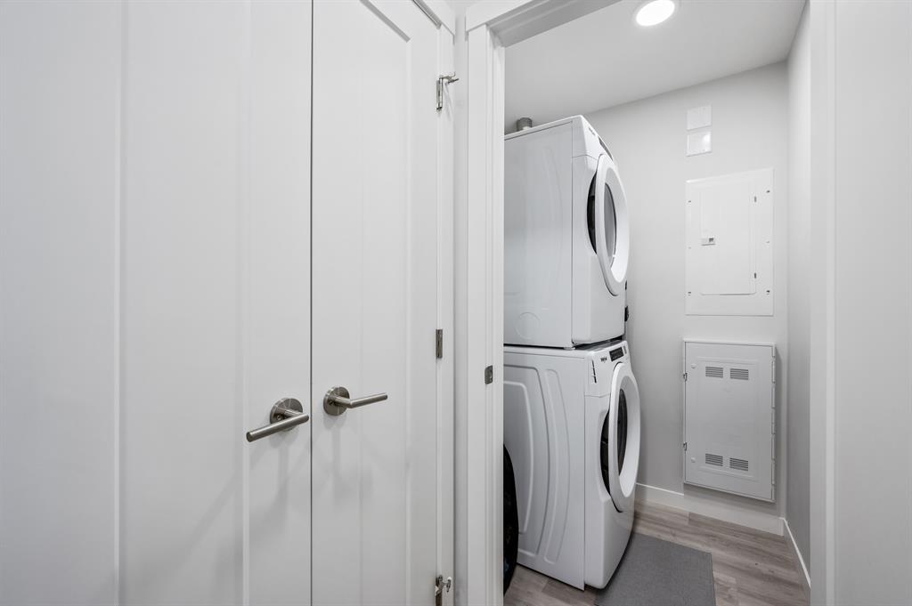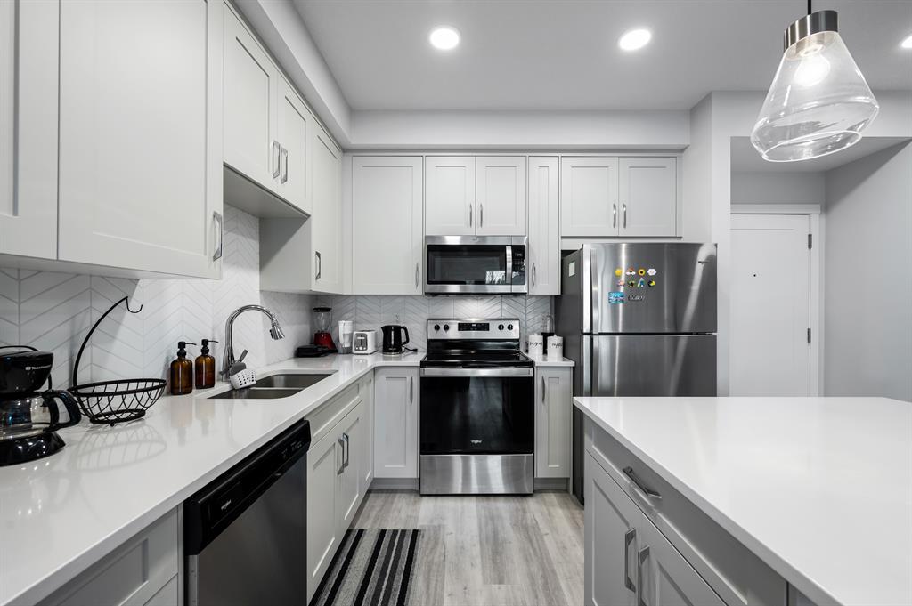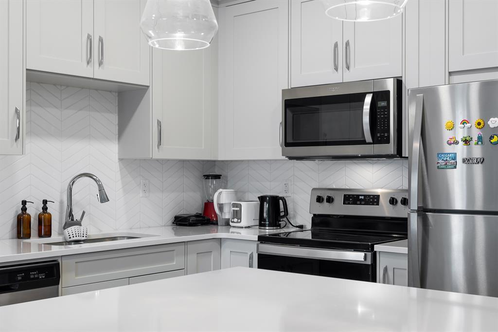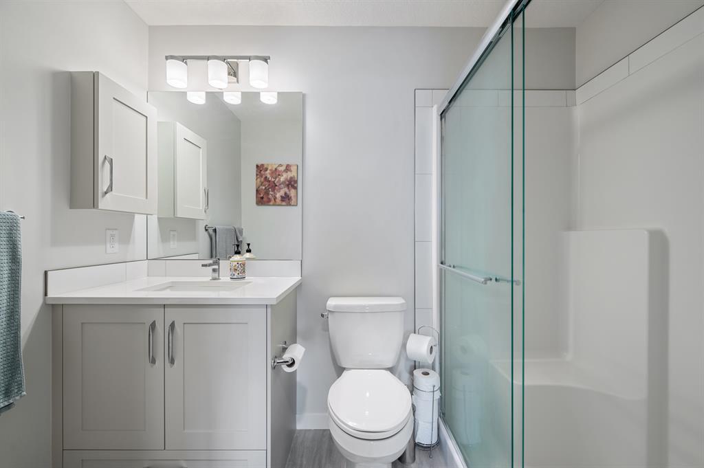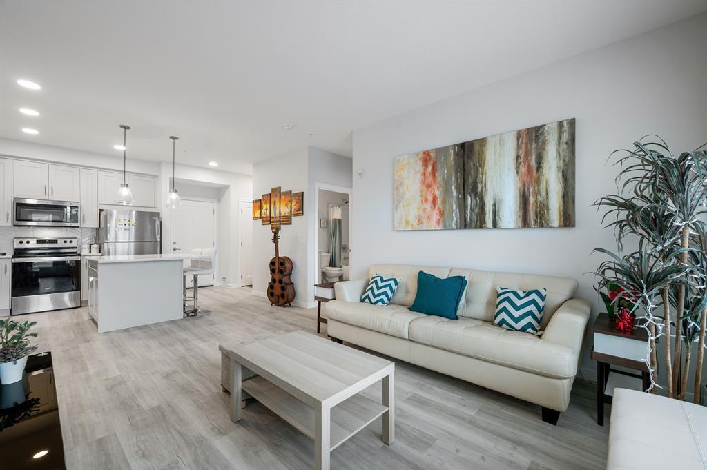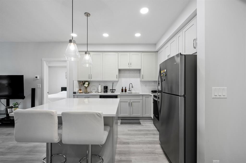 Introducing a brand-new condo in Shawnee Slopes, offering nearly 800 sqft of living space. Step inside to discover a spacious open floor plan that creates an inviting atmosphere. The kitchen boasts modern stainless steel appliances, elegant white cabinetry, quartz countertops, and a convenient island with a cozy eating nook. Transitioning seamlessly, the kitchen flows into the living room, highlighted by large windows that flood the area with abundant natural light. With its ground floor location, you have direct access in and out of the unit through the patio door, just off the living room. The primary suite is enhanced by a generous walk-in closet and a stylish 3-piece ensuite. Additional features of this unit include a second bedroom, a well-appointed 4-piece bathroom, and convenient in-suite laundry. Situated with easy proximity to Macleod Trail, Fish Creek Park, shopping, dining, and much more, this condo offers a fantastic lifestyle opportunity. (id:22211)