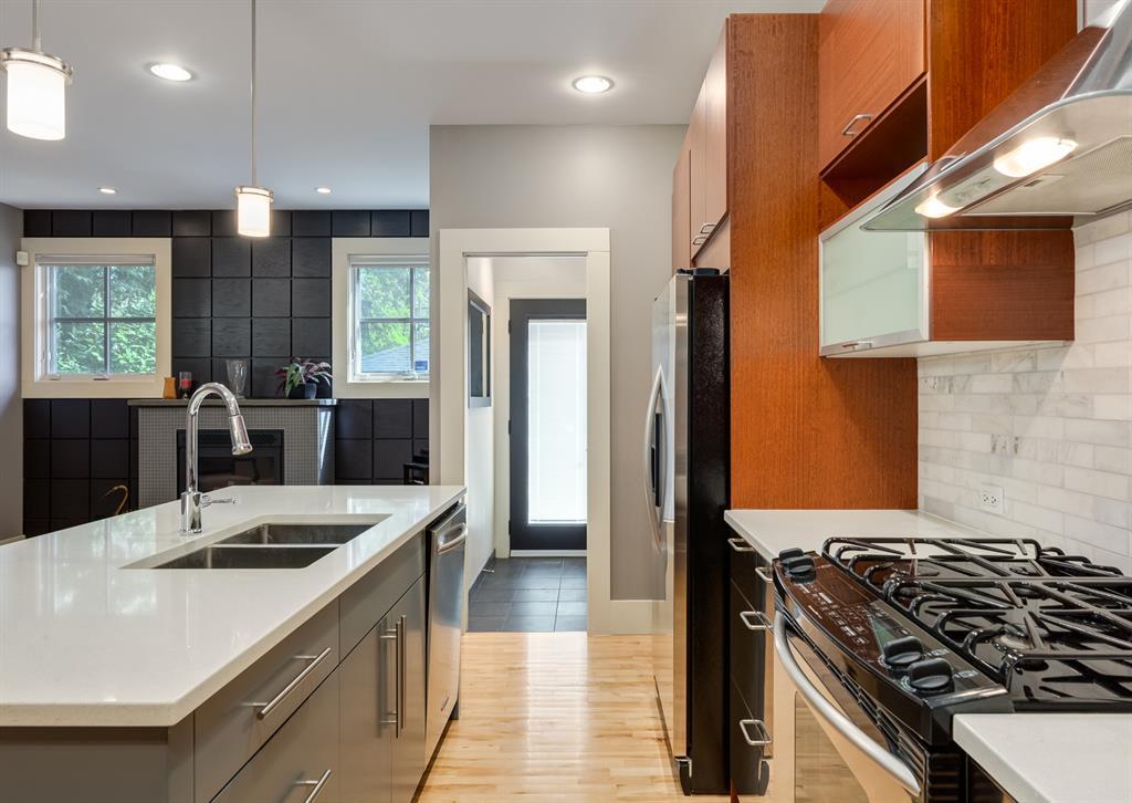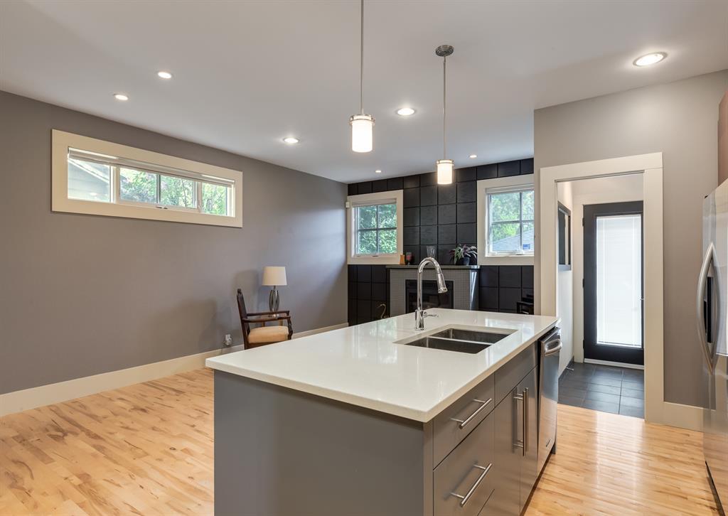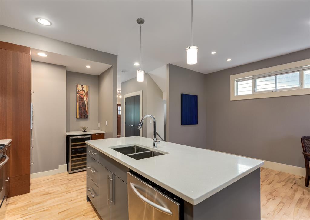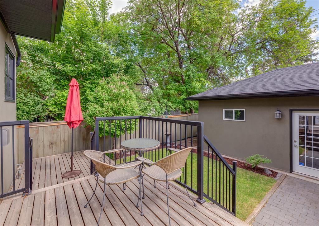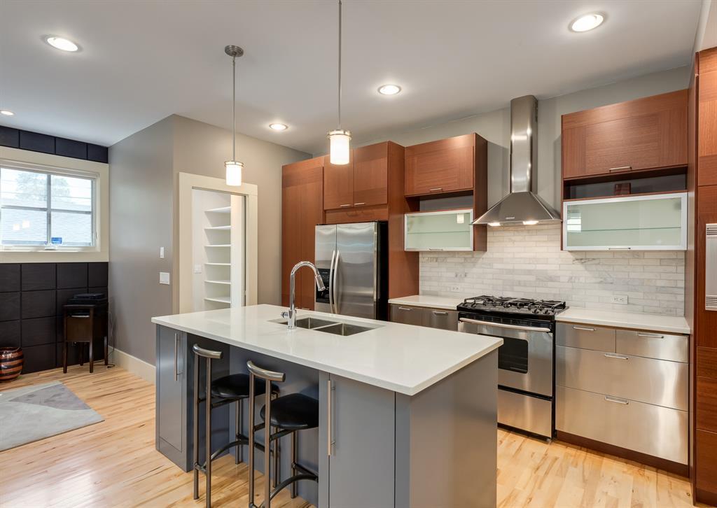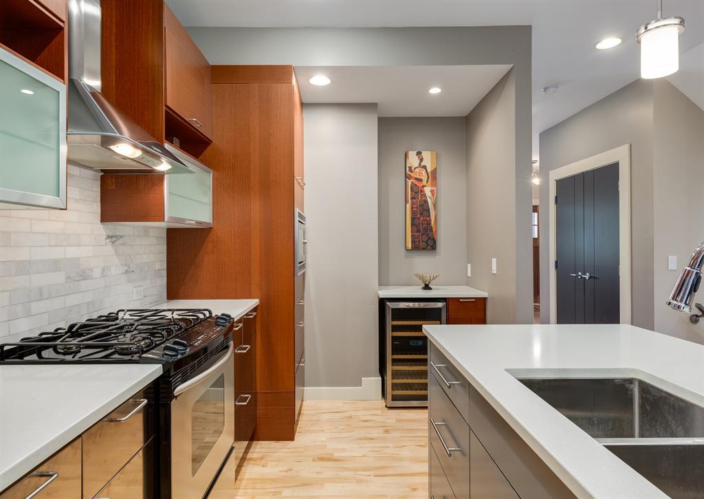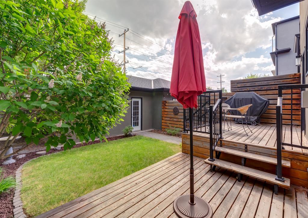 Absolutely mint, this home is pristine and shows like new. With attractive curb appeal, from the landscaped yard, extra wide aggregate sidewalk and steps, and a gorgeous custom wood front door. As you step inside you are greeted by a light and bright interior. With finished onsite maple hardwood floors and a comfortable front living room. The open-concept kitchen has newer quartz counters, a stainless steel appliance set with a gas range, and a fridge with a water dispenser and a beverage fridge. There is an updated center island with a deep dual basin sink and quality full-wood interior cabinets. The family room feature wall expresses elegant quality with wood panel detailing and a natural gas fireplace. there is a mudroom rear entry with built-ins for all your storage needs, and stepping onto the back deck you can enjoy a private setting with the fabulous south sun, with the shade of mature trees and lilacs. With gas hookups and a two-tiered deck that eases onto the fully landscaped yard, a perfect place to relax during the long summer days ahead. The hardwood finish flows up and down the stairs with a modern stainless steel handrail. With 3 Bedrooms total, both upper rooms enjoy ensuite full bathrooms, and walk-in closets and the primary bedroom is spacious with a Juliet balcony and south views. Fully developed downstairs delivering 2136 square feet of total living space and 3.5 bathrooms. There is a cozy recreation room, ample storage, fully air-conditioned, and a 2-car garage. All in a fabulous Kensington location, moments to the river paths, the downtown, cafes, coffee shops, grocery stores, and transit. (id:22211)