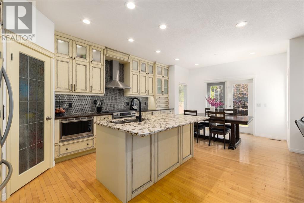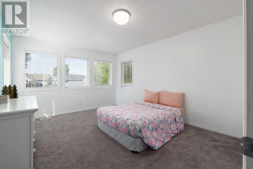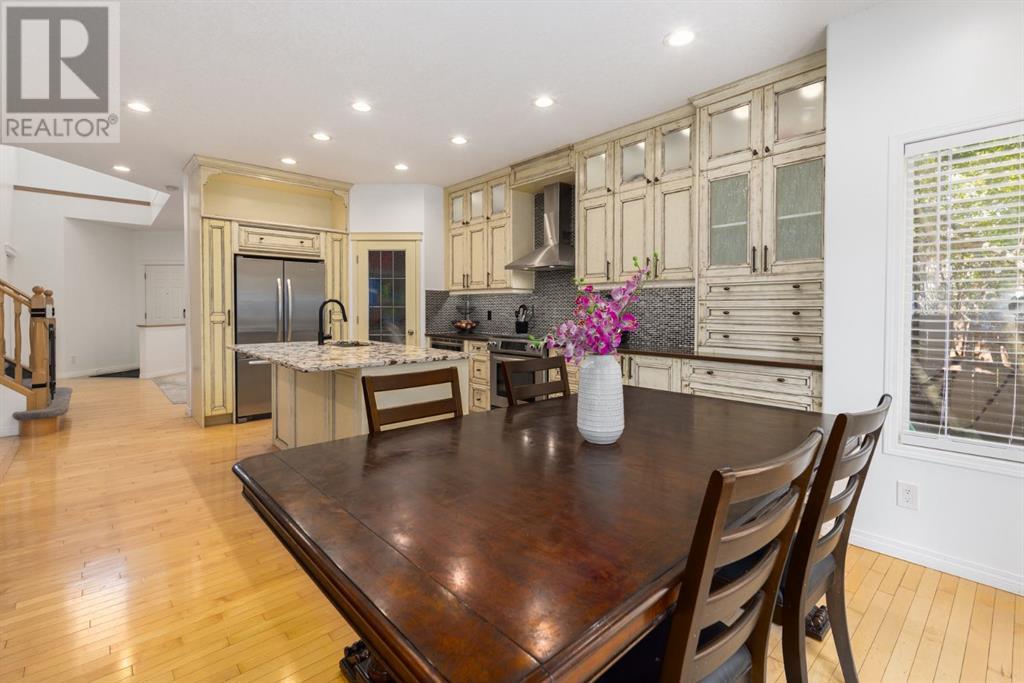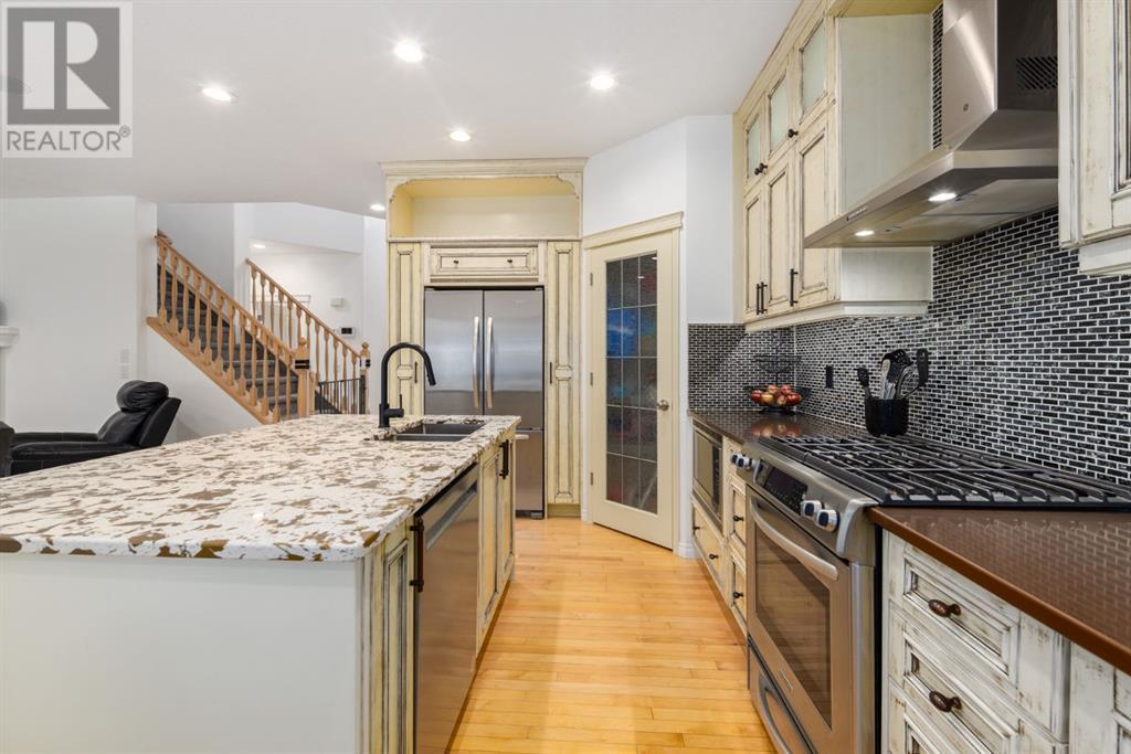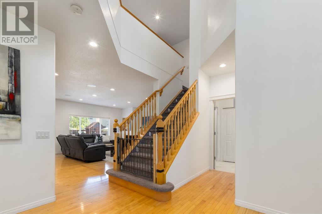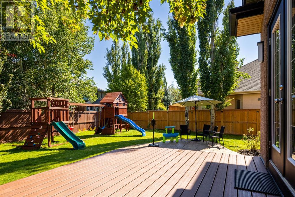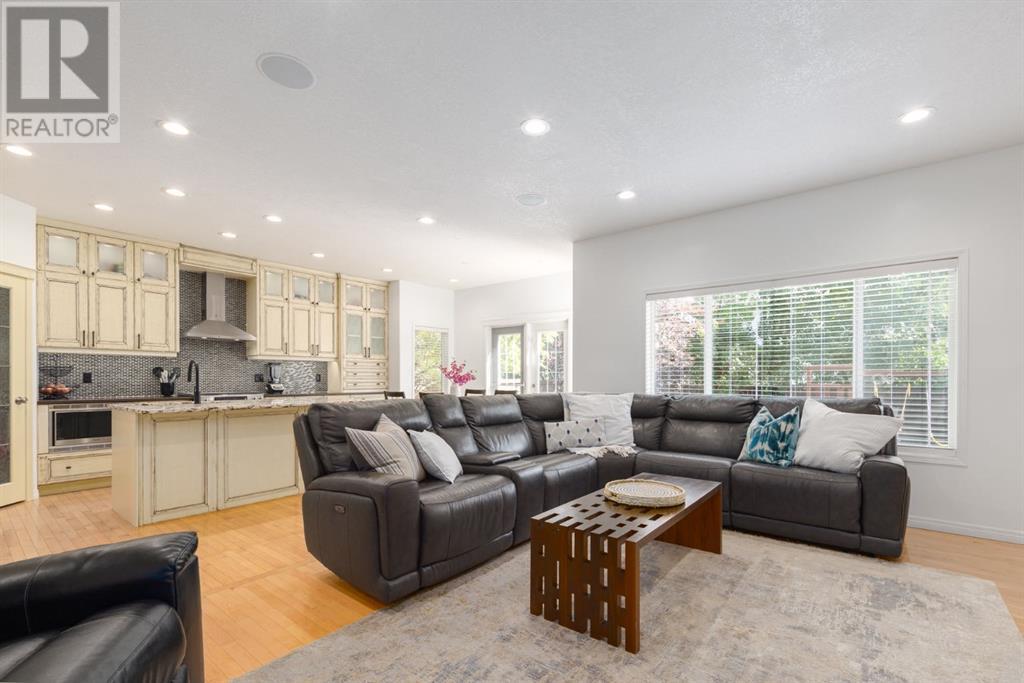On a quiet, tree lined cul-de-sac near schools and the ravine lies the perfect 6 bedroom, 3 1/2 bathroom family home. Poised on an oversized, pie shaped lot with a large backyard, this Jayman built home is the perfect place to raise a growing family. You’re greeted through the entryway by sky high knockdown ceilings, designer lighting, and a huge renovation including new lighting throughout including 30 new LED pot lights, all new window coverings, new plush carpets throughout, central air conditioning, and much more. The open concept main floor boasts a brand new kitchen with ample cabinetry, designer backsplash, pull out storage, a corner pantry, bar seating, new appliances including a gas range, Quartz countertops, and beautifully upgraded lighting including pot lights, under cabinet lighting, and decorative accent lighting in the top row of cabinets to create the perfect ambience. The kitchen is open to the spacious dining room and is flooded with natural light through large SE windows overlooking the backyard, the perfect place to host dinners with loved ones. The adjacent living room is sized for a large family and is warmed by a cozy gas fireplace with tile surround and a beautiful mantle. On the other end of the main floor, an upgraded mud room is situated off the double garage and boasts new tile, laundry machines, and all new cabinetry. The main floor powder room has also seen recent upgrading including lights and tile. Up the stairs you’ll find a built-in solid wood bookshelf, linen closet, four large bedrooms and two beautifully renovated bathrooms. The luxurious primary retreat overlooks the backyard, features a spacious walk-in closet and has room for king sized furniture. The luxurious ensuite bathroom has been recently renovated to include dual vanities, Quartz countertops, a giant soaker tub, ample storage, all new tile, and a new standup shower. All bedrooms are spacious and feature upgraded shelving in the closets. The 4th bedroom up is surround ed by sunny windows and could easily be re-purposed as a bonus room or play/media room with a walk in closet for storing toys and games. The lower level features a large media room with a wet bar, perfect for movie nights, and two sunny bedrooms, one of which is currently being used as a kids playroom. The large bathroom on the lower level enjoys heated floors and a large vanity with tons of storage. Other bonuses include heated floors in the basement enhancing your comfort year round, central air conditioning, fresh designer paint, and so much more. The stunning backyard has been beautifully landscaped including a large composite deck, stamped concrete patio, fencing, several mature trees, and tons of private space for kids to play. This unbeatable cul-de-sac location is only a few minute walk to two K-9 schools, Craston’s ravine which connects to Calgary’s coveted Bow River Pathway system and Fish Creek Park, playgrounds, groceries, cafes, and many other amenities. (id:22211)