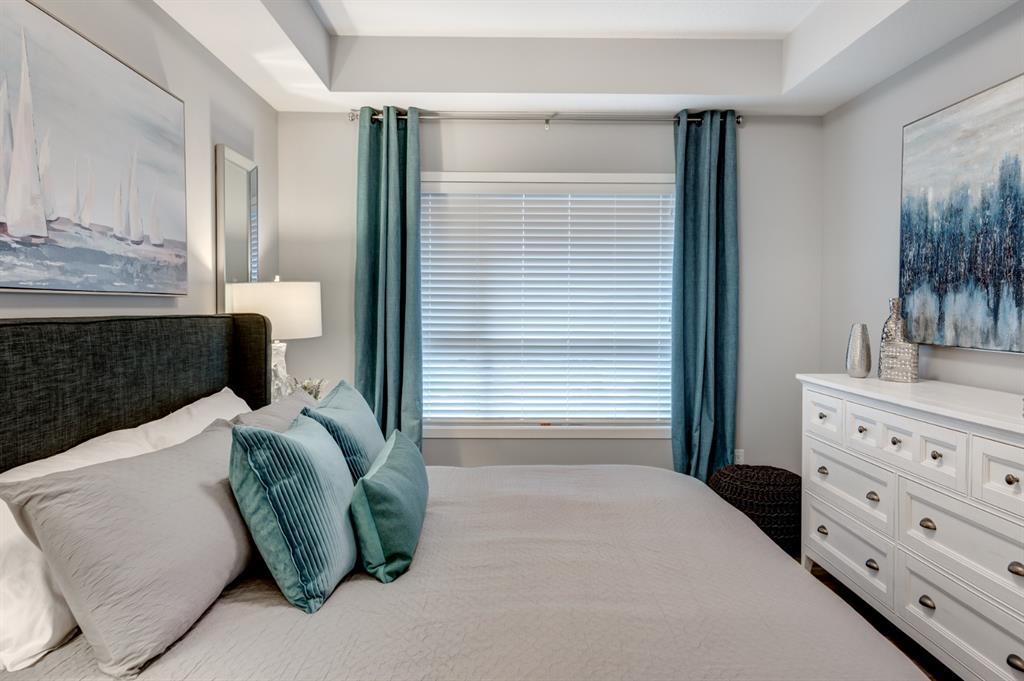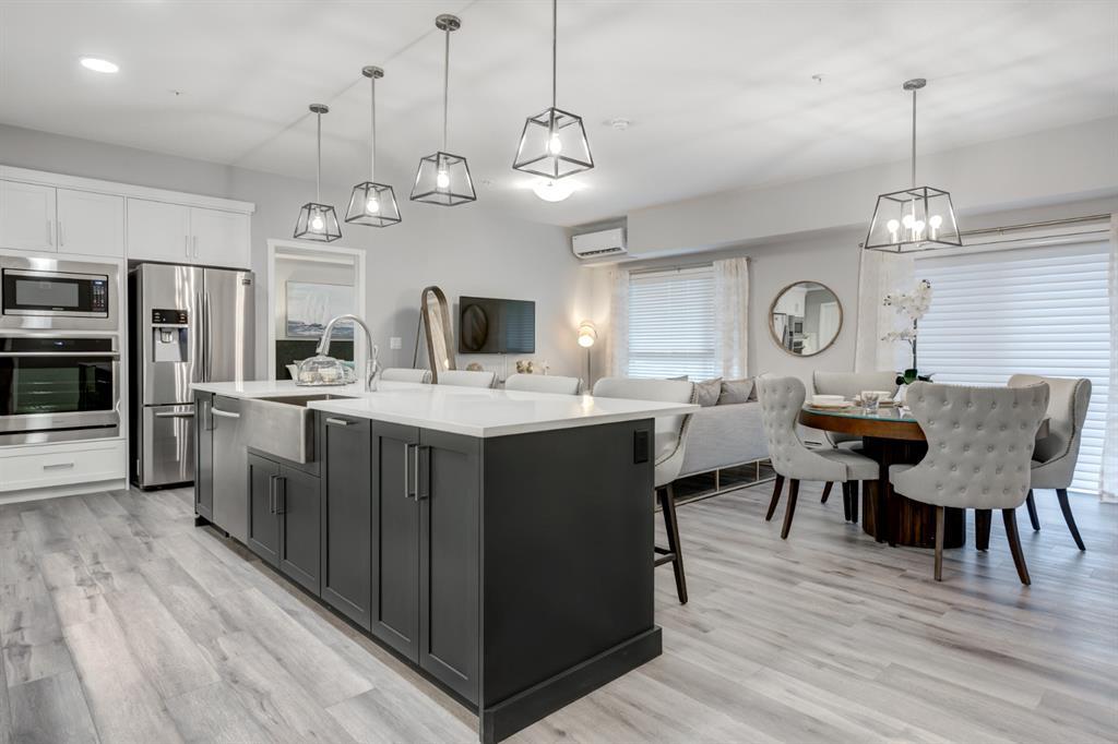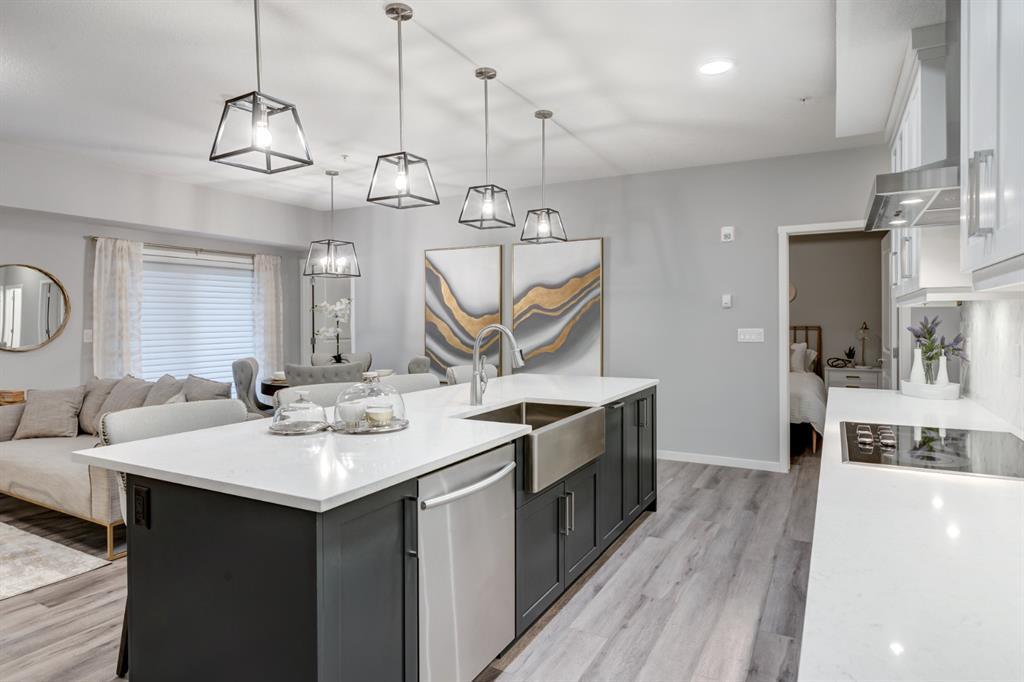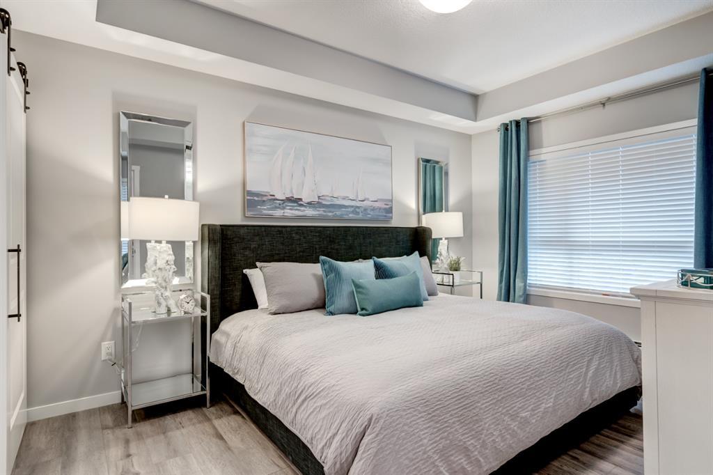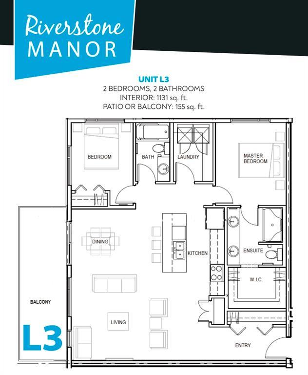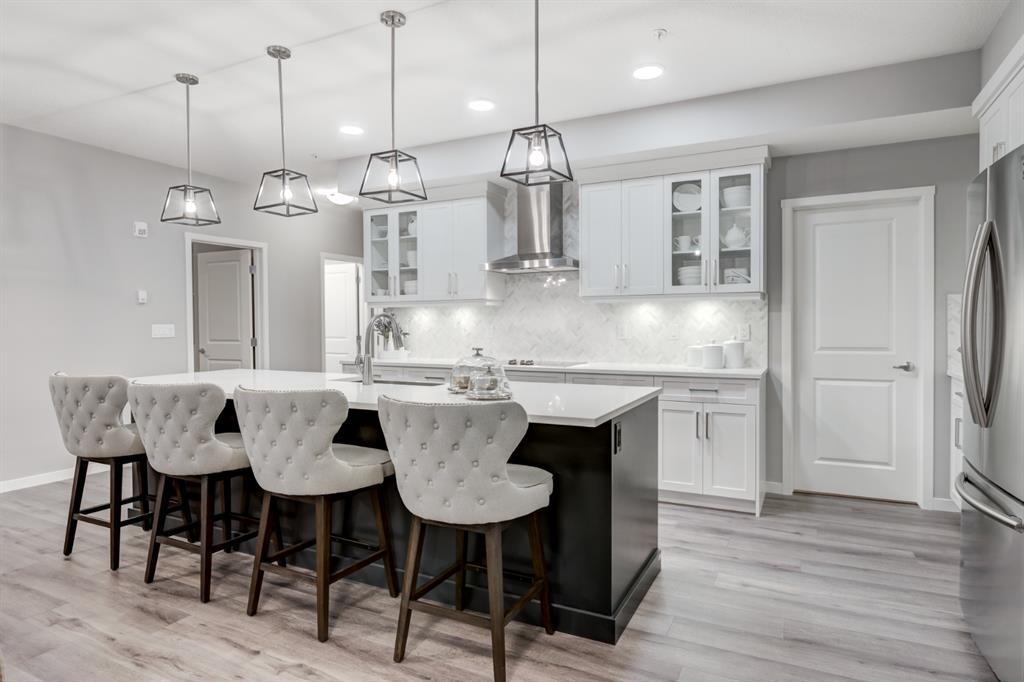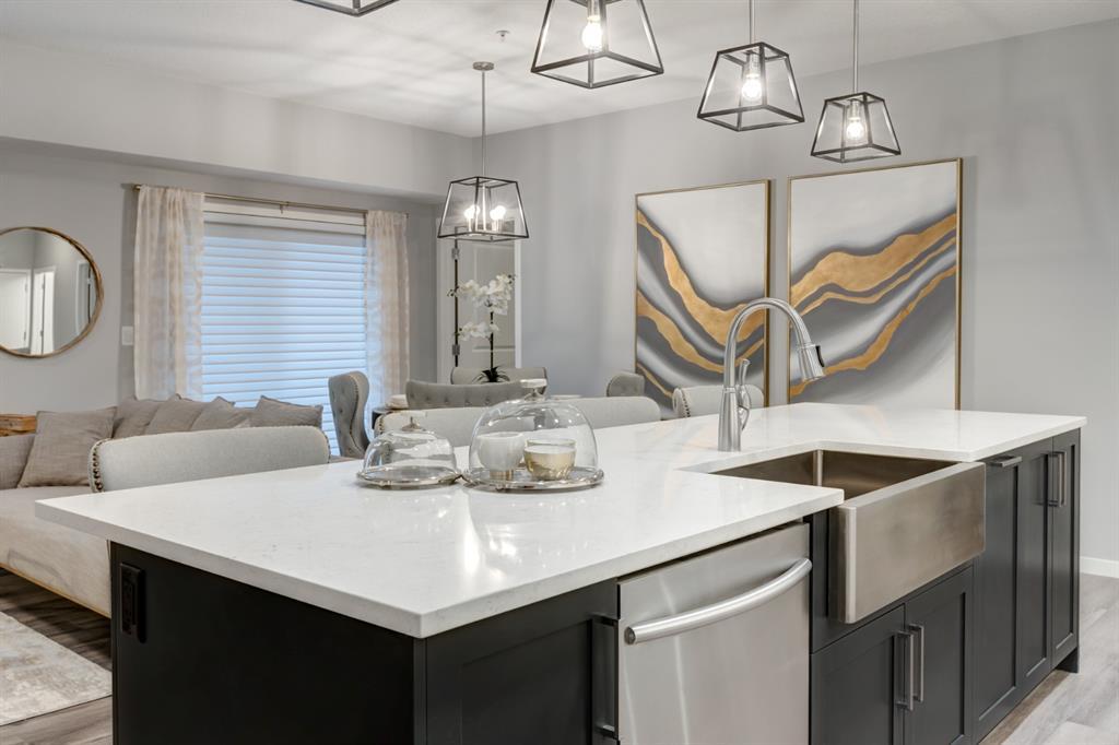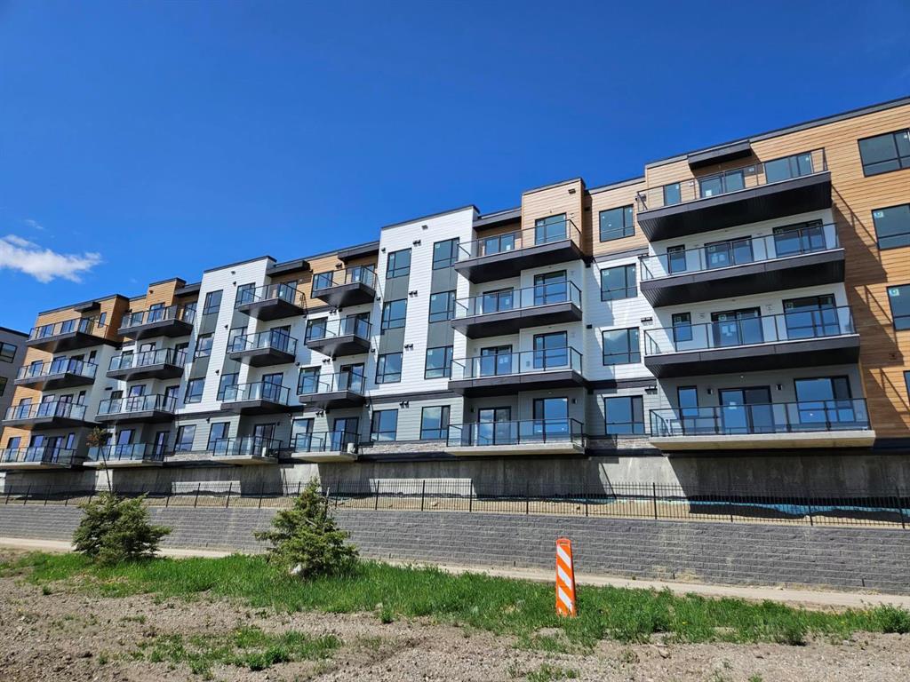 INTRODUCING RIVERSTONE MANOR, IN THE EXCLUSIVE COMMUNITY OF RIVERSTONE IN CRANSTON, CALGARY. BUILT BY “BUILDER OF CHOICE” WINNER CEDARGLEN LIVING, 4 YEARS RUNNING! BRAND NEW "L3" unit with notable features. You will feel right at home in this well thought-out 1,054.67 RMS sq.ft. (1131 sq.ft. builder size) 2 bed, 2 bath home with open plan, 9' ceilings, LVP flooring (no carpet), Low E triple glazed windows, electric baseboard heating, BBQ gas line on the balcony, Fresh Air System (ERV) and so much more. Super bright, NW CORNER UNIT, with west exposure balcony. The kitchen is spectacular with full height cabinets, quartz counters, pots/pan drawers, undermount sink, upgraded backsplash and S/S appliances. The island is extensive which transitions into the spacious living area and large dining room, perfect for entertaining. The spacious primary bedroom has a large window (triple pane windows), sizeable walk-in closet and dual vanities with a stand-up shower. The additional bedroom is perfect for kids, guests, or an office. Nearby is the laundry/storage room (washer & dryer included) and a 4pc bath with quartz counters and undermount sink. Highlights include: Hardie board siding, electric baseboard heating, BBQ gas line on the balcony, Air conditioner rough-in, LVP to bedrooms & closets, full height tiles above shower and tub, added pot/pan drawers to the kitchen and added drawers to ensuite vanity. 1 titled underground parking stall included (Limited storage lockers may be available for purchase). Strategically located steps from the beautiful Bow River, adjacent to the scenic wet pond, access to Cranston’s Resident’s Association and many other bespoke amenities. PET FRIENDLY COMPLEX, UNIT IS UNDER CONSTRUCTION AND PHOTOS ARE OF A FORMER SHOW HOME AND FOR REFERENCE ONLY. FINISHING'S AND UPGRADES WILL DIFFER, NO FURNITURE OR ACCESSORIES INCLUDED. Estimated Completion date for this unit is August 2, 2023. (id:22211)