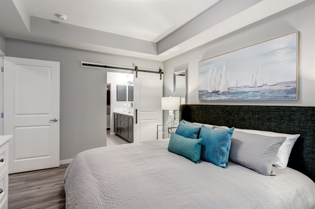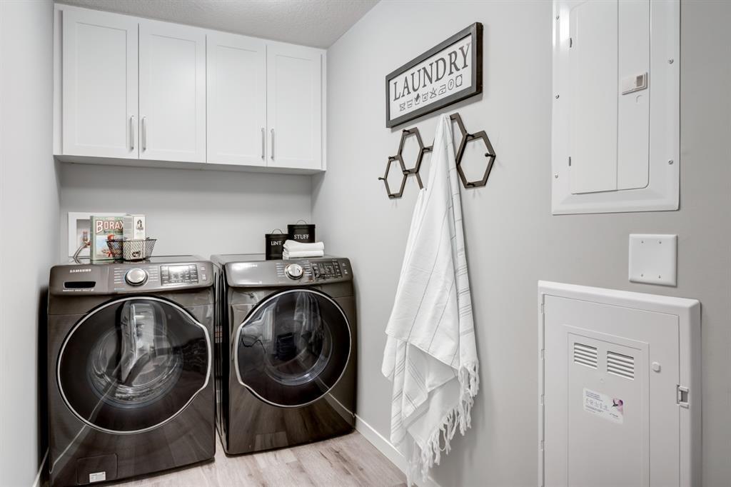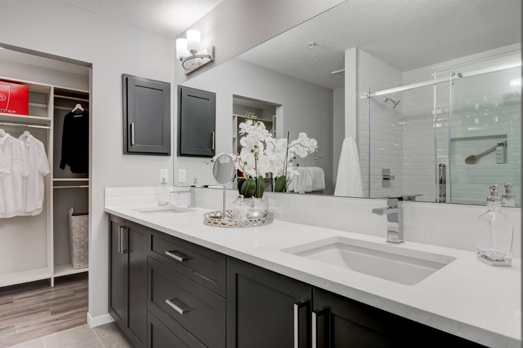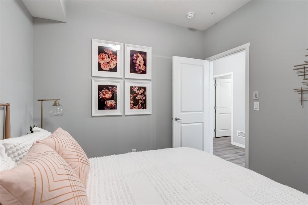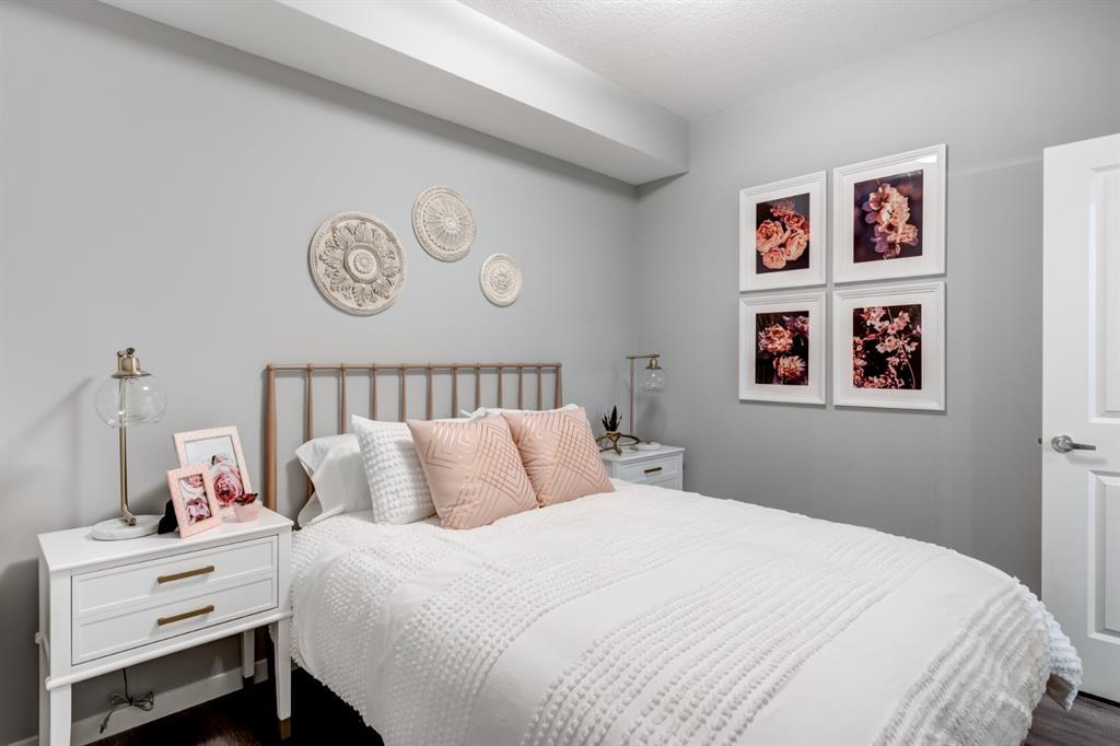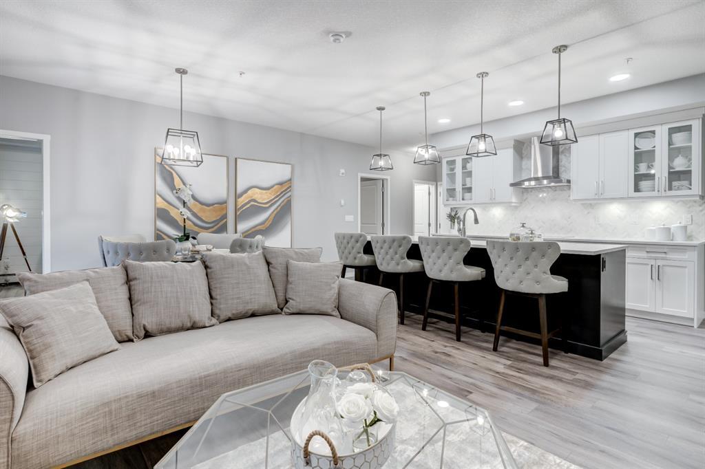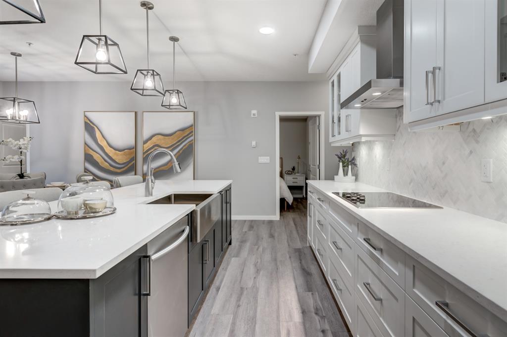 INTRODUCING RIVERSTONE MANOR, IN THE EXCLUSIVE COMMUNITY OF RIVERSTONE IN CRANSTON, CALGARY. BUILT BY “BUILDER OF CHOICE” WINNER CEDARGLEN LIVING, 4 YEARS RUNNING! BRAND NEW "L3" unit with notable features. You will feel right at home in this well thought-out 1,054.67 RMS sq.ft. (1131 sq.ft. builder size) 2 bed, 2 bath home with open plan, 9' ceilings, LVP flooring (no carpet), Low E triple glazed windows, electric baseboard heating, BBQ gas line on the balcony, Fresh Air System (ERV) and so much more. Super bright, NW CORNER UNIT, with west exposure balcony. The kitchen is spectacular with full height cabinets, quartz counters, pots/pan drawers, undermount sink, upgraded backsplash and S/S appliances. The island is extensive which transitions into the spacious living area and large dining room, perfect for entertaining. The spacious primary bedroom has a large window (triple pane windows), sizeable walk-in closet and dual vanities with a stand-up shower. The additional bedroom is perfect for kids, guests, or an office. Nearby is the laundry/storage room (washer & dryer included) and a 4pc bath with quartz counters and undermount sink. Highlights include: Hardie board siding, electric baseboard heating, BBQ gas line on the balcony, Air conditioner rough-in, LVP to bedrooms & closets, full height tiles above shower and tub, added pot/pan drawers to the kitchen and added drawers to ensuite vanity. 1 titled underground parking stall included (Limited storage lockers may be available for purchase). Strategically located steps from the beautiful Bow River, adjacent to the scenic wet pond, access to Cranston’s Resident’s Association and many other bespoke amenities. PET FRIENDLY COMPLEX, UNIT IS UNDER CONSTRUCTION AND PHOTOS ARE OF A FORMER SHOW HOME AND FOR REFERENCE ONLY. FINISHING'S AND UPGRADES WILL DIFFER, NO FURNITURE OR ACCESSORIES INCLUDED. Estimated Completion date for this unit is August 2, 2023. (id:22211)
