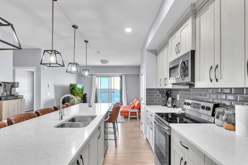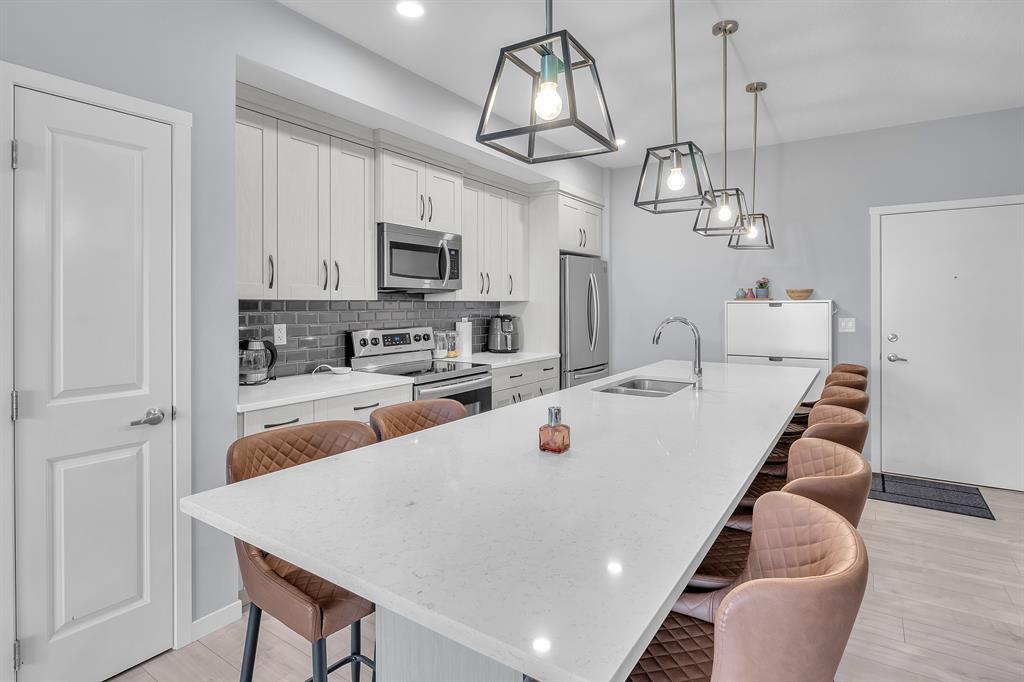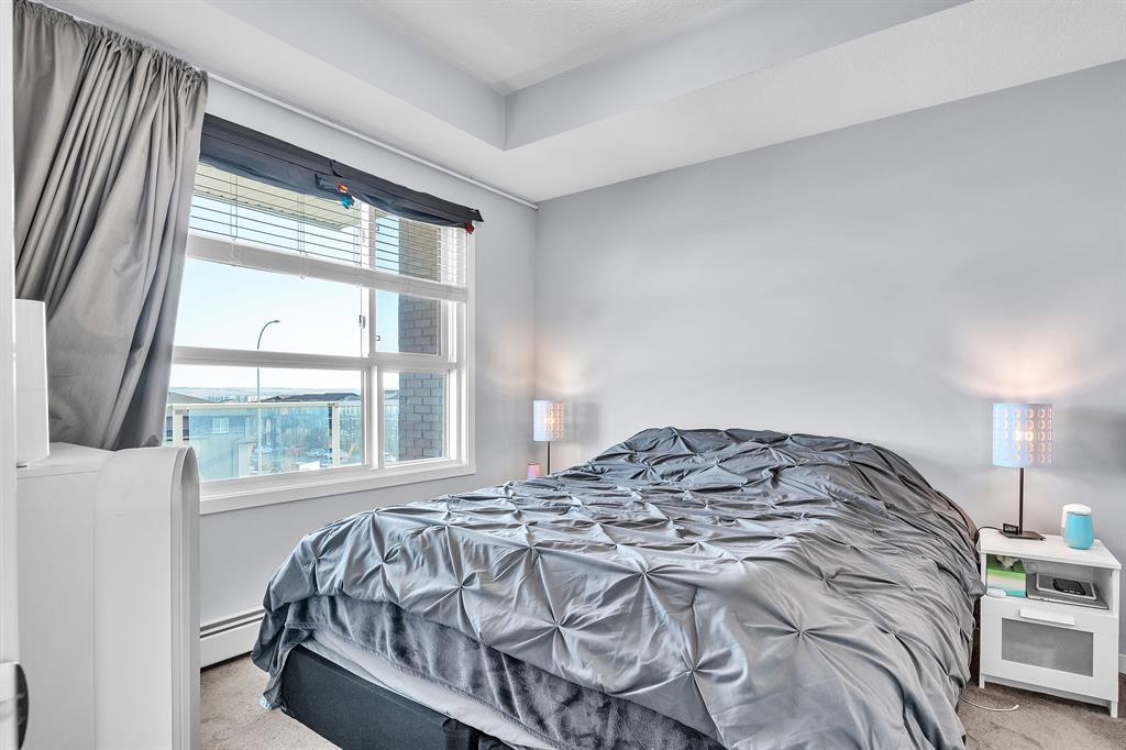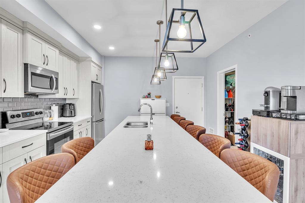 NEW PRICE NOW! You must view this bright and beautiful TOP FLOOR 900 sq ft 2 bedroom, 2 bathroom condo with a deck featuring a peek of the valley to the south. In virtually new condition featuring all the upgrades you expect in your new pad, you will quickly call this place home after viewing it just once. Features include a stylish kitchen with top notch stainless steel appliances, quartz countertops, pantry, and a large island. The large living room with soaring 9 ft HIGH ceiling calls your attention towards a massive 22 ft X 7 ft south-facing deck with a gas line for your summer barbeques:-) On each side of the living area are the spacious bedrooms -- with the primary one featuring an ensuite with double undermounted sinks and large shower. This room also has a sizable walk-in closet. The second bedroom, also with a walk-in closet, is beside the other discretely located full bathroom with a tub. The flexible in-suite storage room also has the laundry machines. There is also a storage locker downstairs. From this perfect condo, you are walking distance to the Superstore, Save-On Foods, VIP movie theater, various restaurants and shopping; also minutes to the South Health Care campus, Fish Creek Park with scenic walking, and biking paths. Also, behind this condo building is an open field that leads to the LARGE new YMCA. This condo has titled underground parking. Let’s get you started towards owning the perfect place to call home! (id:22211)