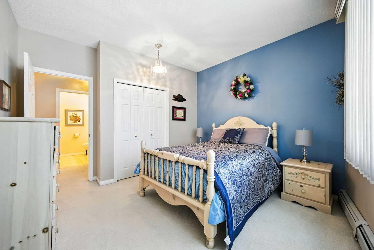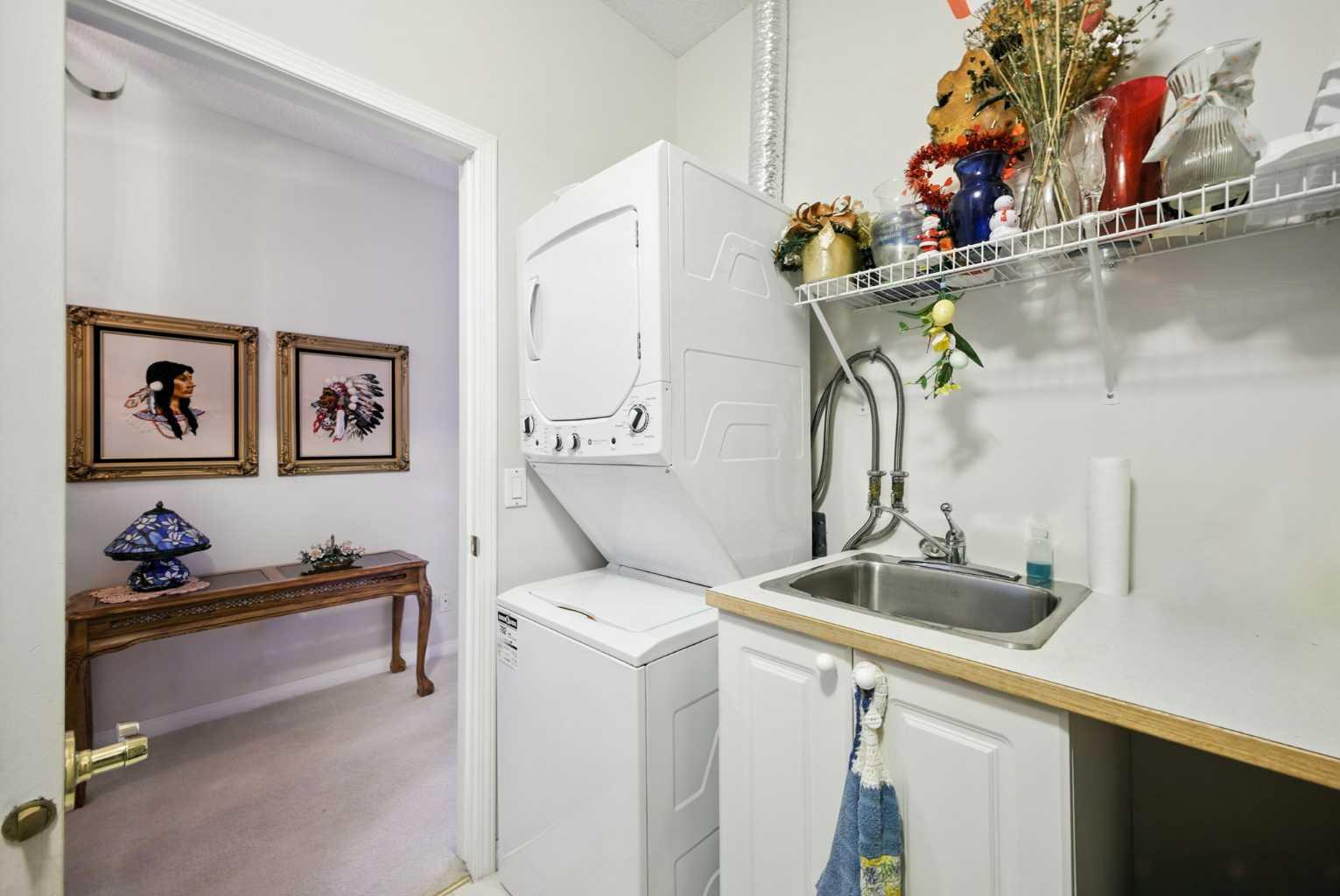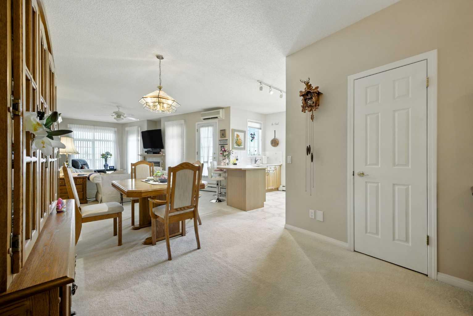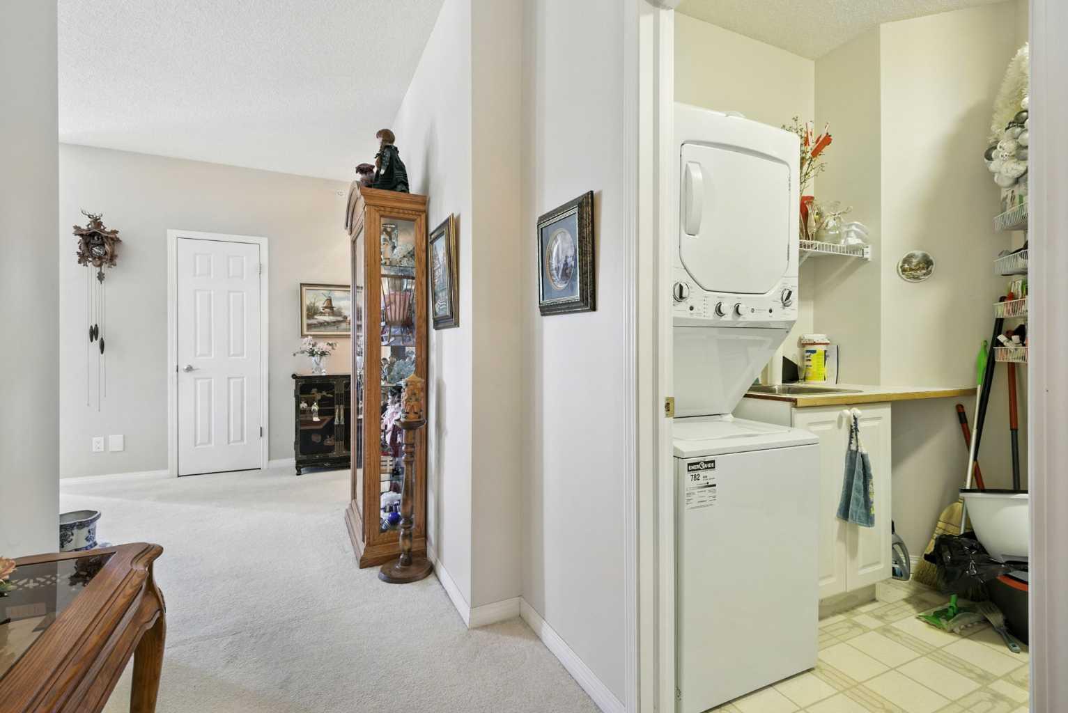 Welcome to this spacious 2-bedroom, 2-bathroom top-floor condo in a desirable 18+ complex, rich with amenities. Offering over 1,200 sq. ft. of bright living space, this home features a generous balcony with sweeping mountain views. Enjoy the comfort of two A/C wall units, a cozy gas fireplace, and an open kitchen with breakfast bar seating. Additional highlights include a new washer and dryer, central vacuum system, and electronic blinds in the living room. The layout is designed for convenience with in-suite laundry and the rare benefit of TWO titled parking stalls.