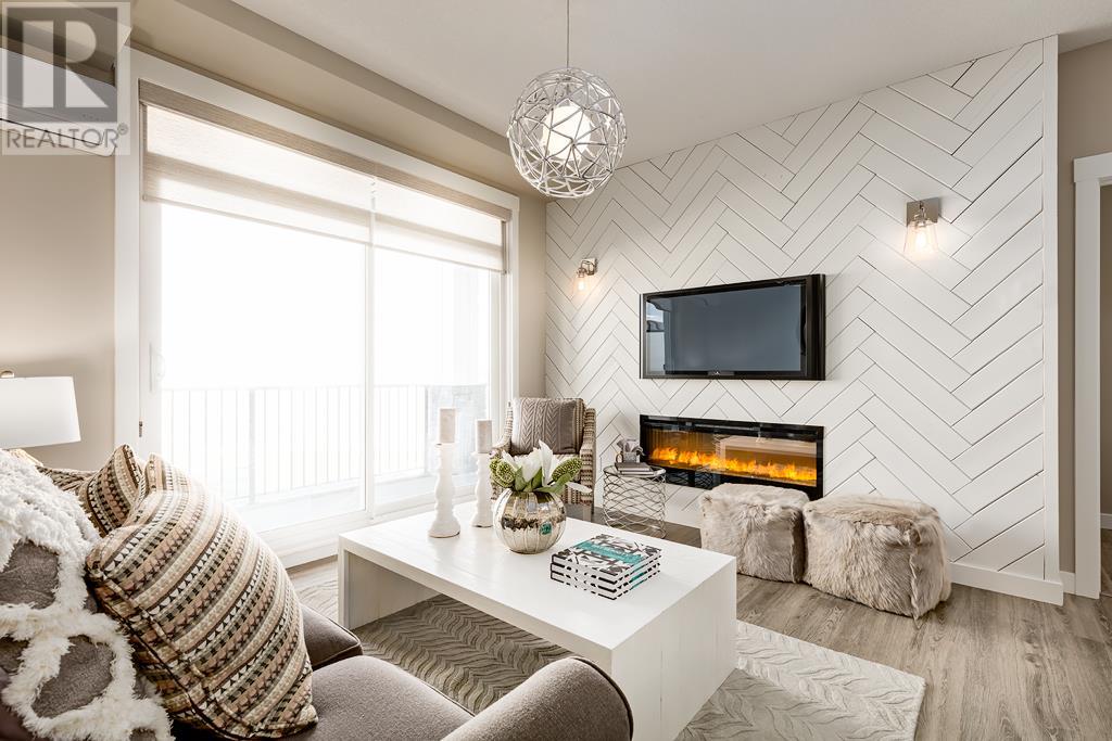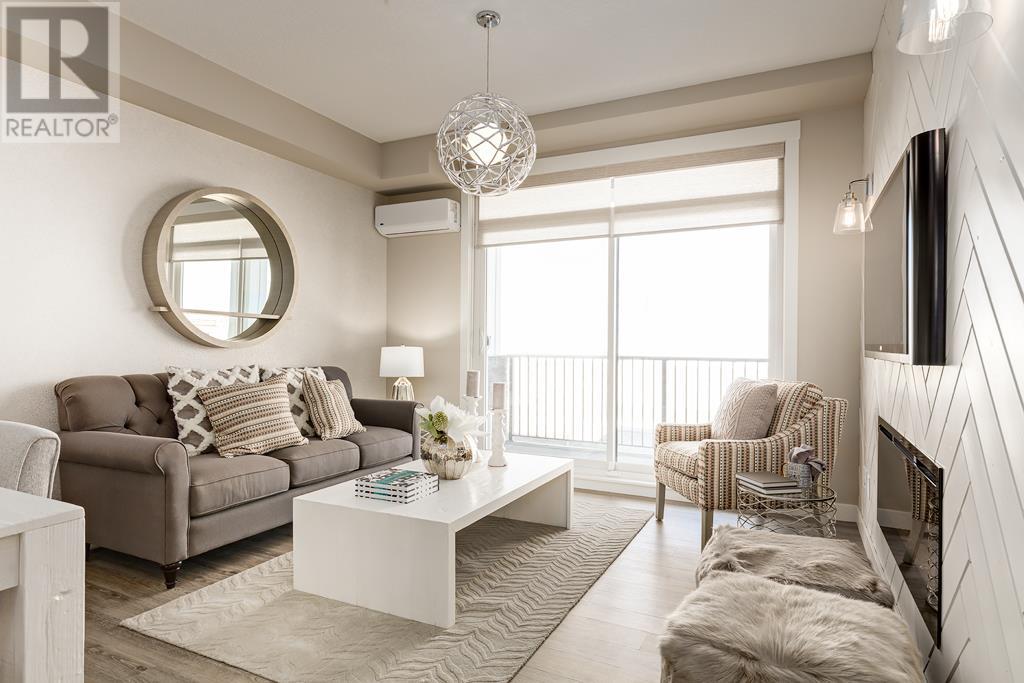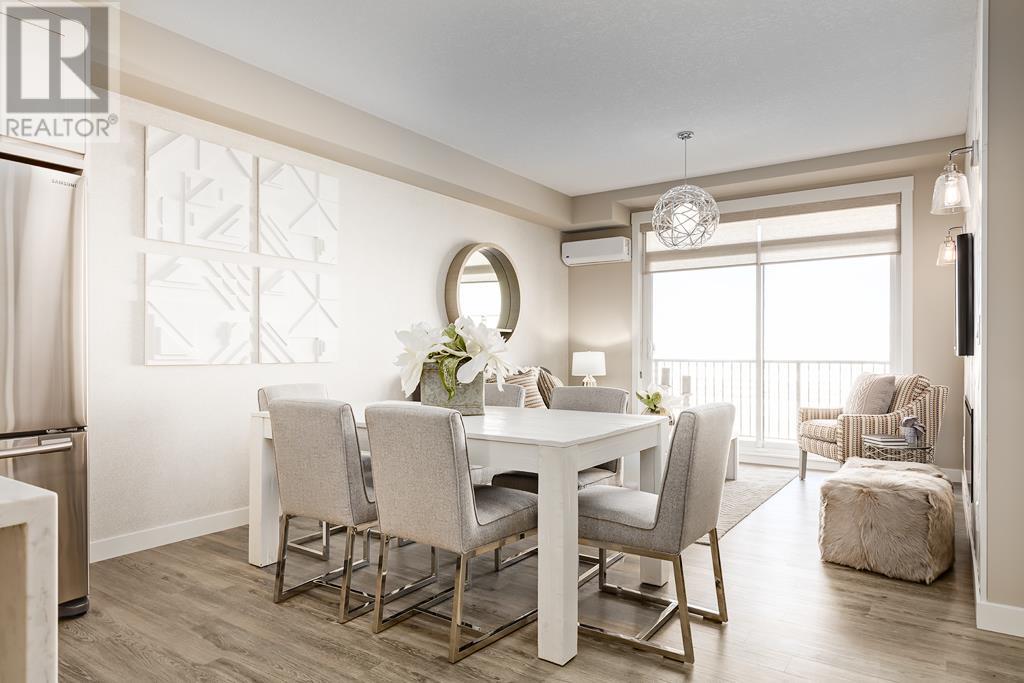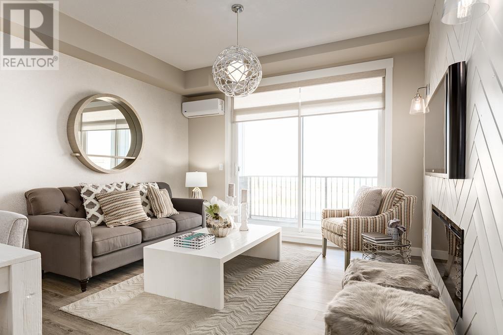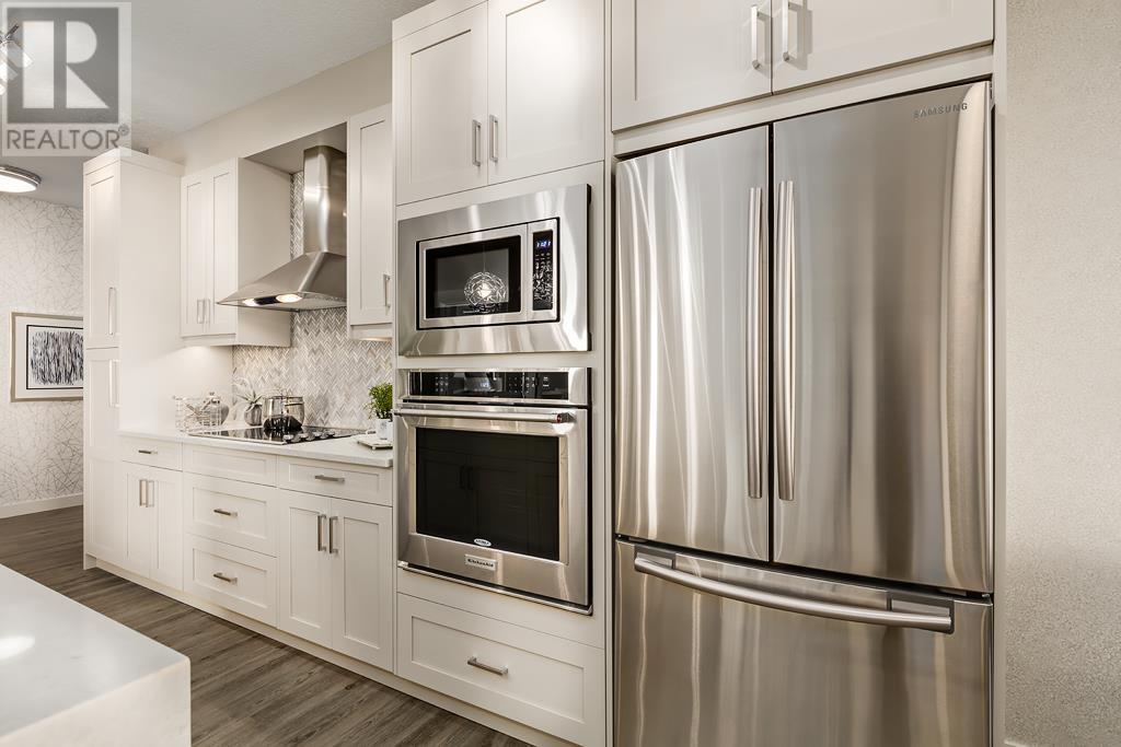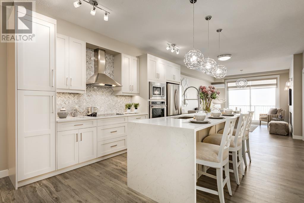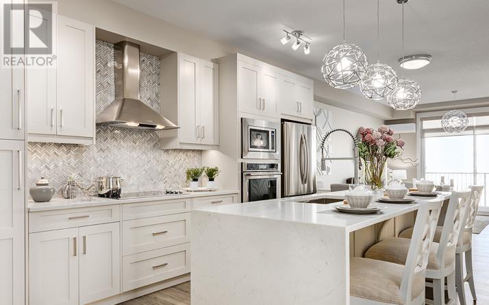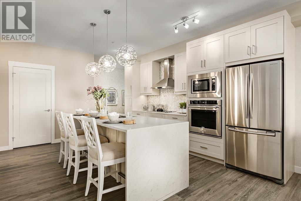 Welcome to the Atwood 3ES plan, a stunning 1073 square foot (builder size), third-floor condo located in Livingston one of Calgary's newest master planned NW communities. Let's start with the spacious 145 square foot private balcony with glass railings. This beautiful 2 bedroom, 2 bathroom unit also features a 9-foot high ceilings with a knockdown finish. The bedroom windows offer an East-facing view, perfect for capturing the morning sun.Enjoy a modern, high-end kitchen equipped with stainless steel Samsung appliances, including a smooth cook-top range, counter-depth fridge with ice maker, dishwasher, and over-the-range microwave hood fan. You'll also find a large closet upon entering the foyer for additional storage, and quartz countertops throughout the kitchen and bathrooms. The gourmet kitchen boasts a big island, perfect for family gatherings and entertaining. The modern shaker-style style cabinets are found throughout the kitchen and bathrooms as well. The spacious living room and dining areas make this unit perfect for entertaining guests. The master bedroom features extra windows and a huge walk-in closet, while the ensuite has his and her sinks. The second bedroom includes a pocket door with direct access to the main bath. You'll enjoy upgraded interior 3” casing, 4” door headers, and 4” baseboards, along with luxury vinyl plank floors in the kitchen, entry, bathroom, and laundry, and carpeted bedrooms complete with 8 lb underlay. The beautiful suite also includes underground heated titled parking along with additional storage space. This unit also includes chrome-finish Moen plumbing fixtures and polished chrome or matte black interior doorknobs. The heat-recovery-ventilator is included in the unit, ensuring a comfortable living space and an abundance of climate-controlled fresh air year-round.In addition, this home comes equipped with Air Conditioning for those warm summer days. The estimated monthly condo fee is $390.00, including heat, water, sewer, professional management and reserve fund contributions . The estimated possession date is late spring/summer of 2024.This unit is offered by Logel Homes, a 7-time winner of Best Customer Experience, 2-time Multi-Family Builder of The Year. Logel Homes is also a 7-time winner of Canada’s Best Managed Company. Don't miss your opportunity to own this luxurious condo and experience the best in modern living. Logel Homes "Where Excellence Comes Standard!" (id:22211)