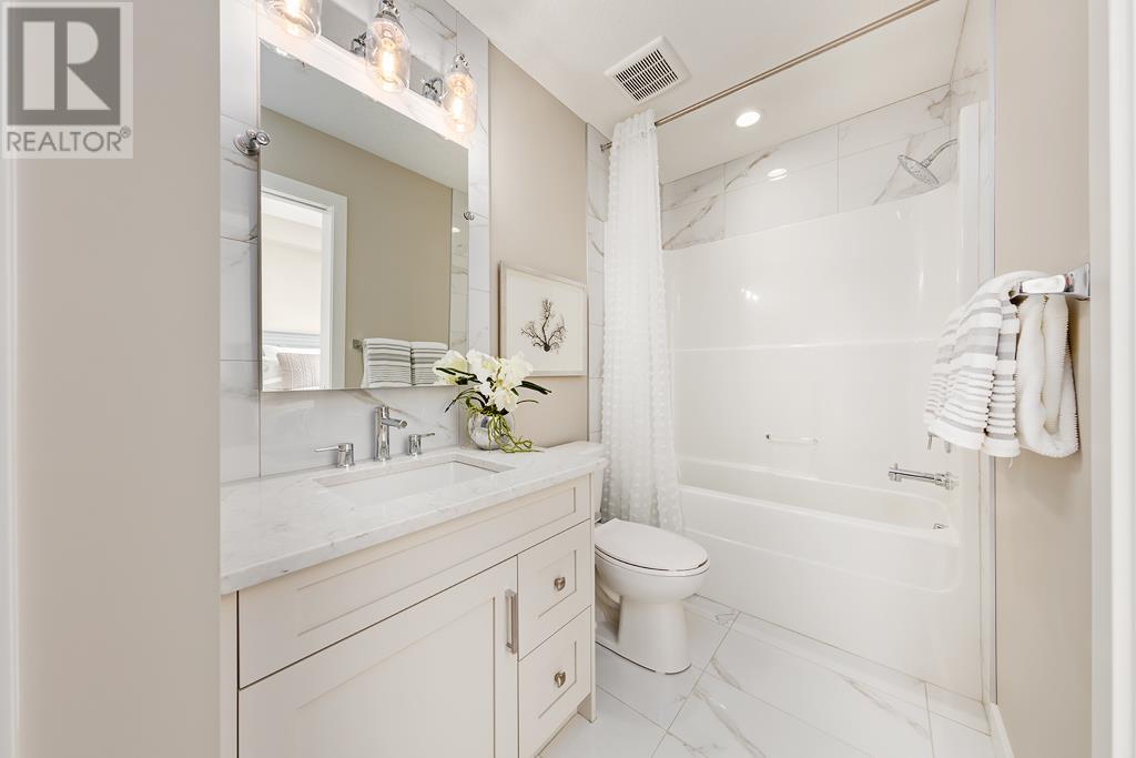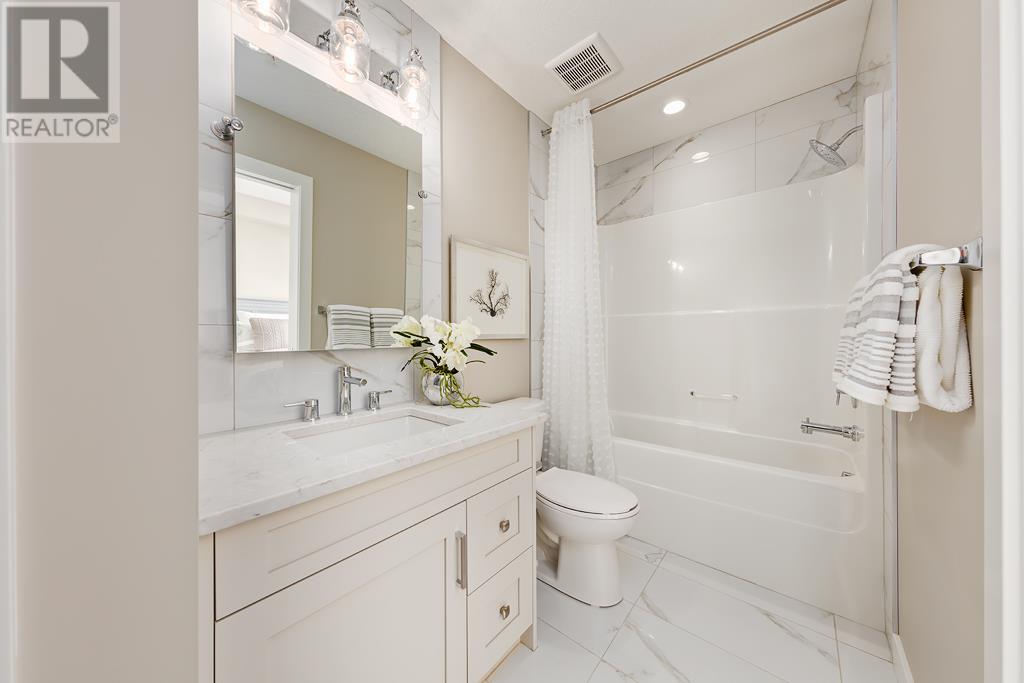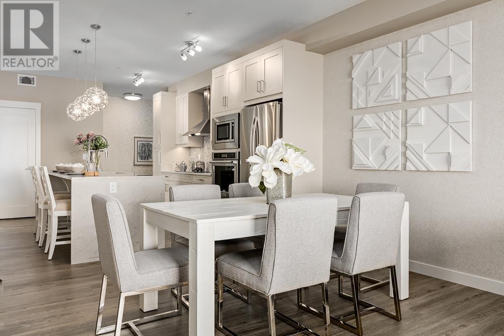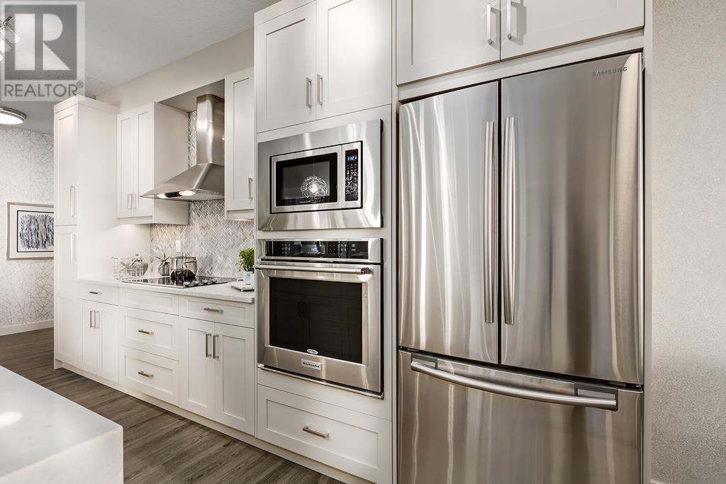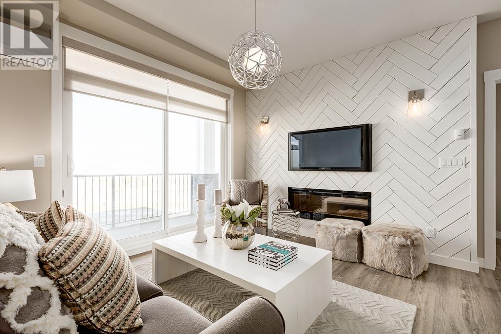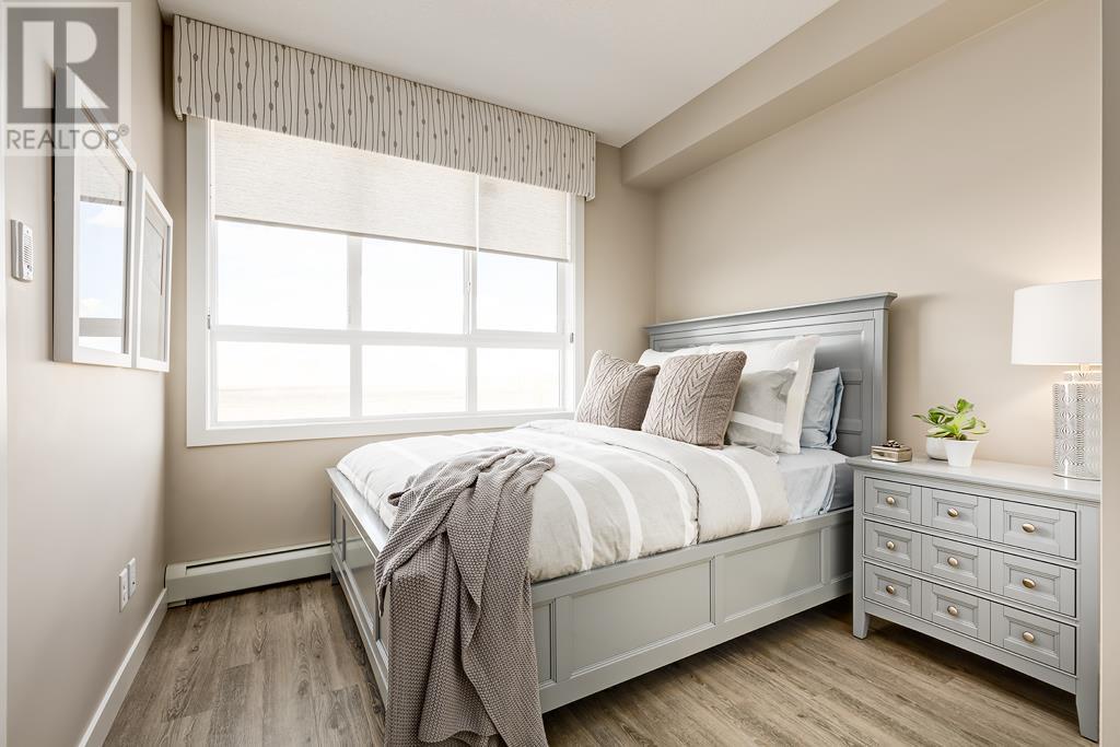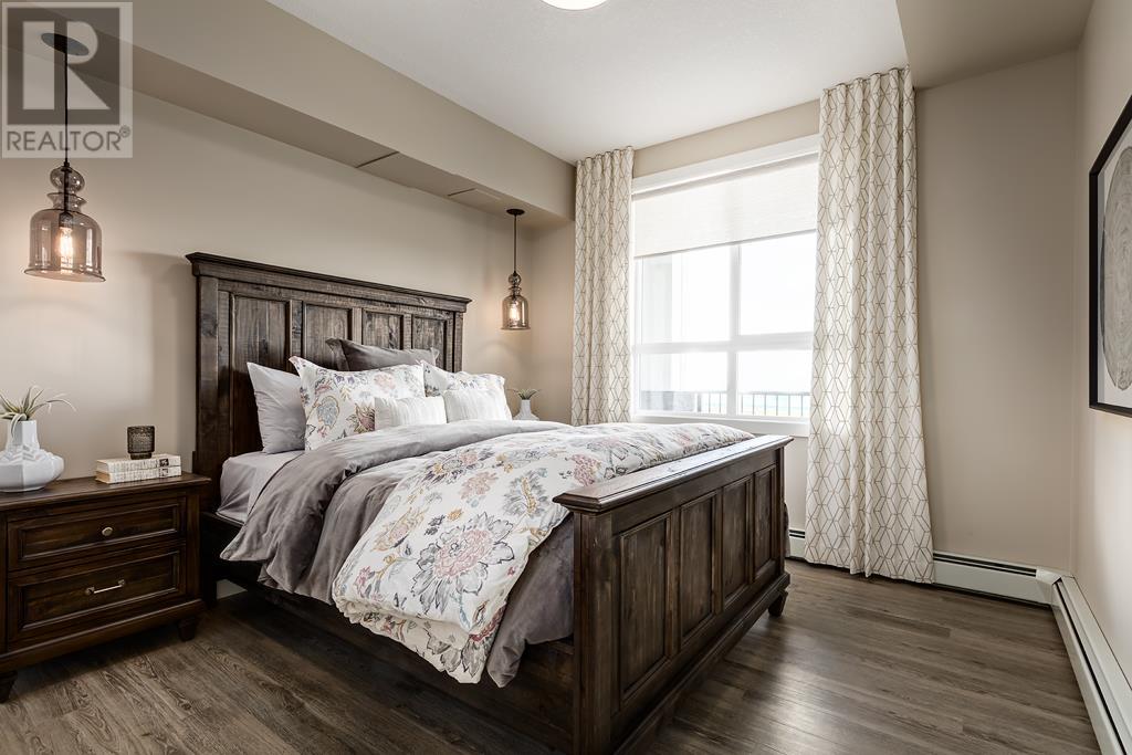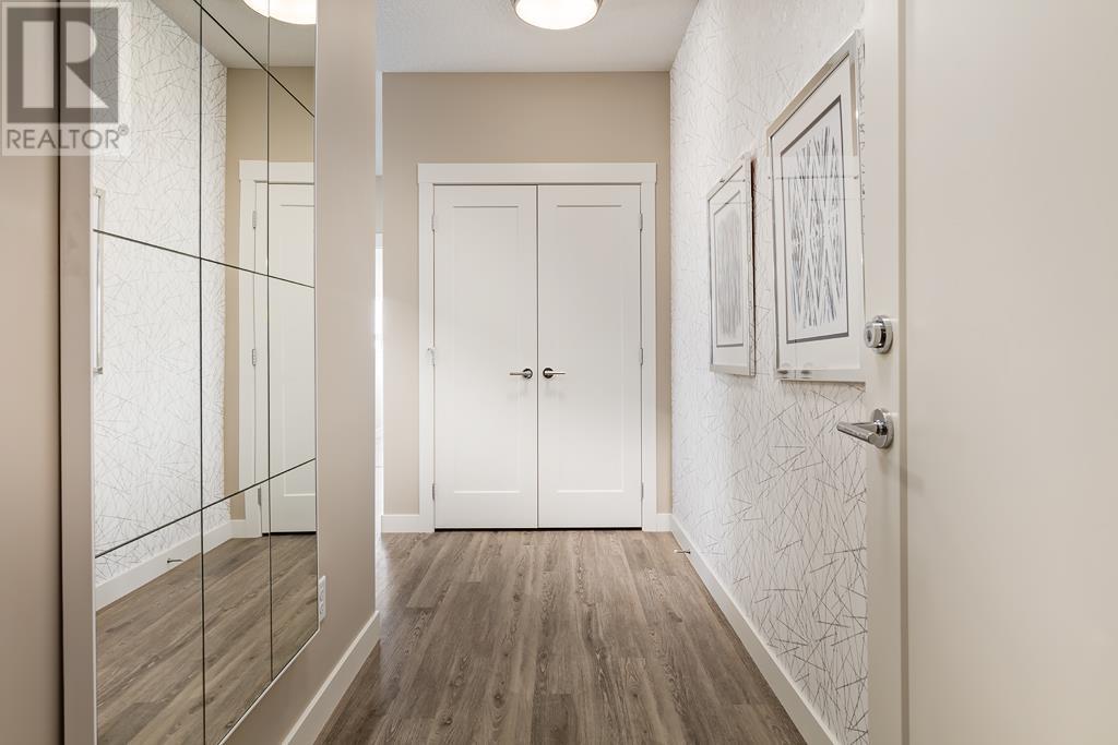 Welcome to the Atwood 3ES plan, a stunning 1073 square foot (builder size), third-floor condo located in Livingston one of Calgary's newest master planned NW communities. Let's start with the spacious 145 square foot private balcony with glass railings. This beautiful 2 bedroom, 2 bathroom unit also features a 9-foot high ceilings with a knockdown finish. The bedroom windows offer an East-facing view, perfect for capturing the morning sun.Enjoy a modern, high-end kitchen equipped with stainless steel Samsung appliances, including a smooth cook-top range, counter-depth fridge with ice maker, dishwasher, and over-the-range microwave hood fan. You'll also find a large closet upon entering the foyer for additional storage, and quartz countertops throughout the kitchen and bathrooms. The gourmet kitchen boasts a big island, perfect for family gatherings and entertaining. The modern shaker-style style cabinets are found throughout the kitchen and bathrooms as well. The spacious living room and dining areas make this unit perfect for entertaining guests. The master bedroom features extra windows and a huge walk-in closet, while the ensuite has his and her sinks. The second bedroom includes a pocket door with direct access to the main bath. You'll enjoy upgraded interior 3” casing, 4” door headers, and 4” baseboards, along with luxury vinyl plank floors in the kitchen, entry, bathroom, and laundry, and carpeted bedrooms complete with 8 lb underlay. The beautiful suite also includes underground heated titled parking along with additional storage space. This unit also includes chrome-finish Moen plumbing fixtures and polished chrome or matte black interior doorknobs. The heat-recovery-ventilator is included in the unit, ensuring a comfortable living space and an abundance of climate-controlled fresh air year-round.In addition, this home comes equipped with Air Conditioning for those warm summer days. The estimated monthly condo fee is $390.00, including heat, water, sewer, professional management and reserve fund contributions . The estimated possession date is late spring/summer of 2024.This unit is offered by Logel Homes, a 7-time winner of Best Customer Experience, 2-time Multi-Family Builder of The Year. Logel Homes is also a 7-time winner of Canada’s Best Managed Company. Don't miss your opportunity to own this luxurious condo and experience the best in modern living. Logel Homes "Where Excellence Comes Standard!" (id:22211)