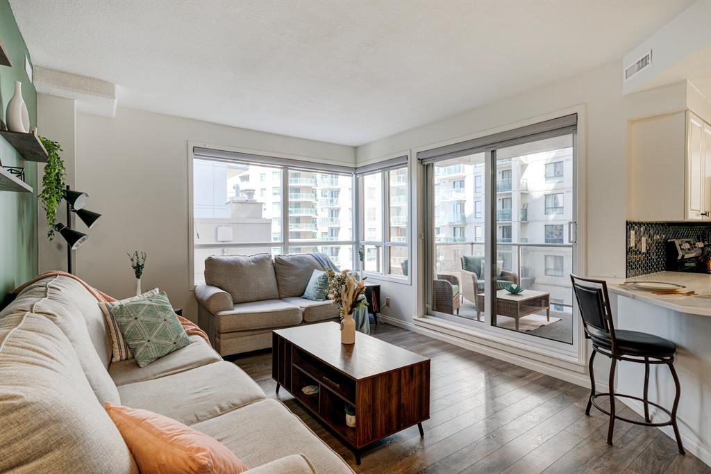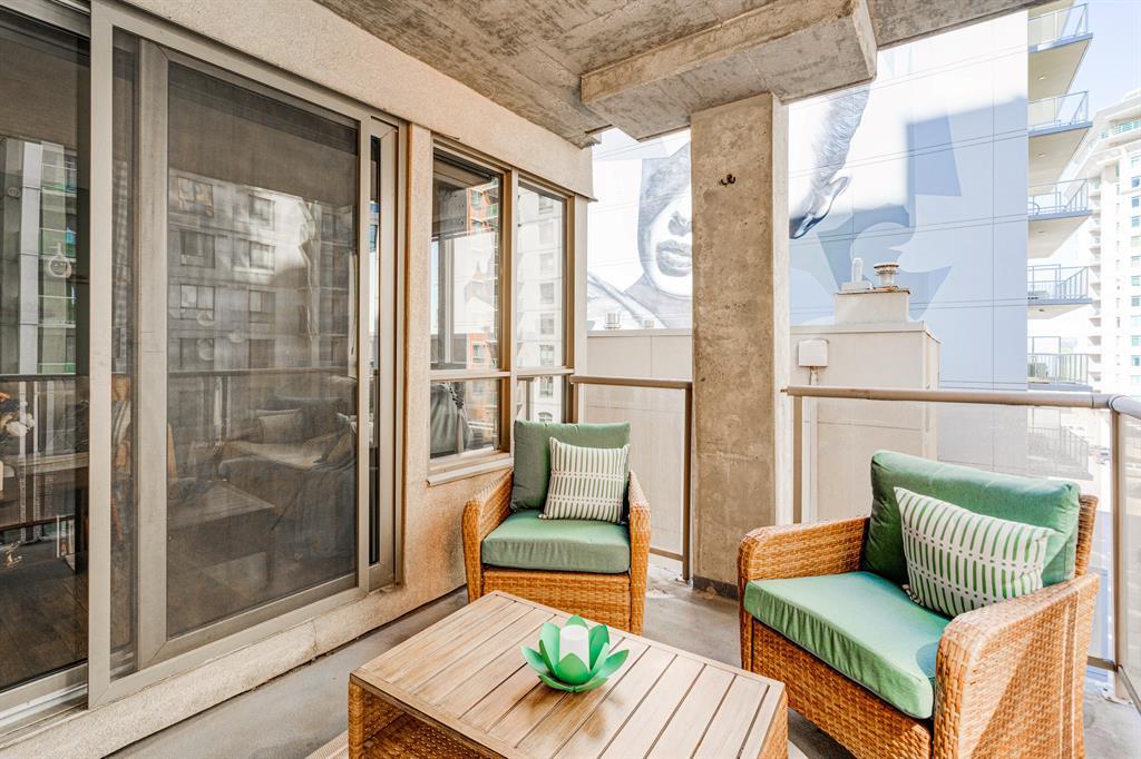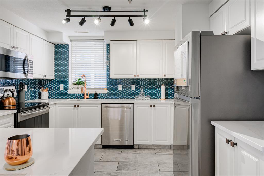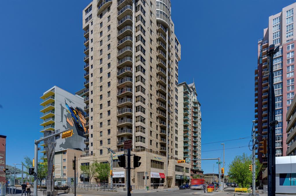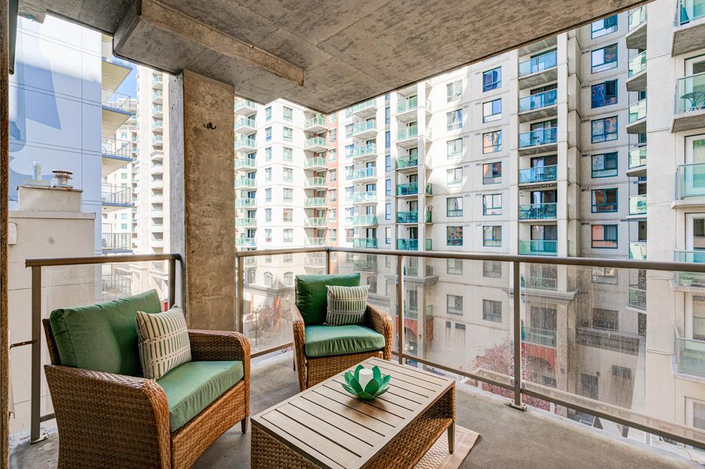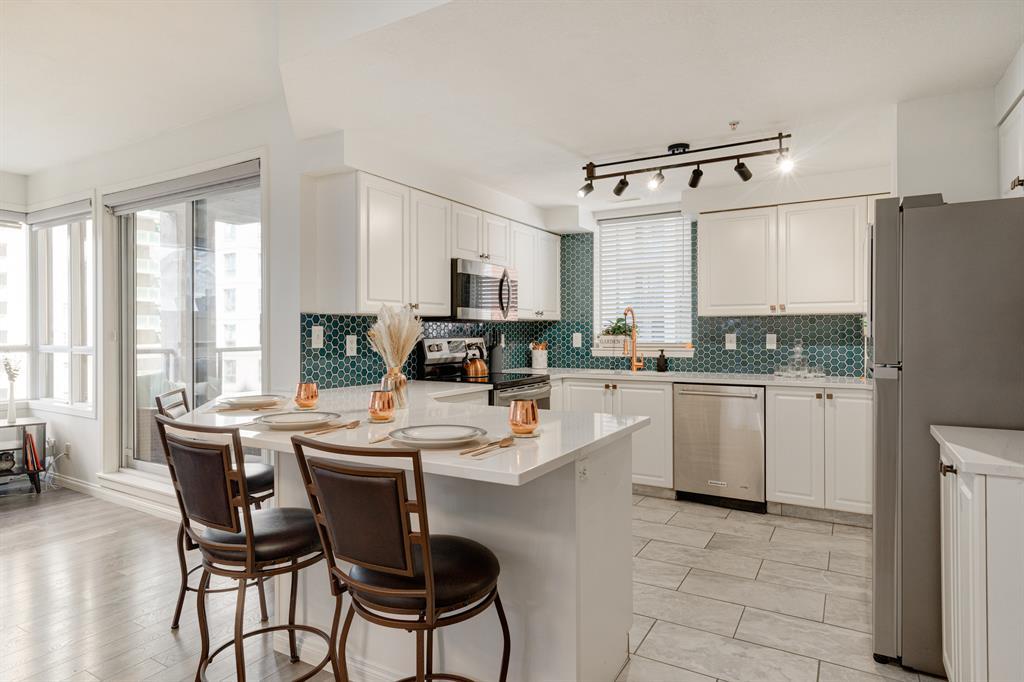 Short Term Rental Friendly building. Welcome to the heart of downtown living, where convenience and vitality collide. Prepare to be amazed by this fully renovated corner unit condo, offering a modern and thoughtfully designed space that exudes perfection in every detail. Step inside and be greeted by a stunning kitchen adorned with a captivating blue hex backsplash imported all the way from New York. The brand-new quartz counters and island, along with the sleek new hardware, add an extra touch of elegance. Every inch of this space shines with a flawless 10/10 rating, thanks to all the amazing upgrades. The open plan in the main living area creates a welcoming atmosphere, while the strategically positioned bedrooms on opposite ends offer privacy and flexibility for guests or roommates. The primary bedroom is a true retreat, featuring a convenient walkthrough closet that leads to a renovated ensuite boasting luxurious marble tile floors, a new vanity, and lighting. The second bedroom is equally spacious and enjoys easy access to the tastefully renovated bathroom just outside its door. Imagine soaking up the warm summer nights on your very own patio, while enjoying the breathtaking views of the downtown skyline. Additional highlights of this exceptional home include brand new motorized blinds in the living area, in-suite storage room and a convenient laundry space. Location-wise, this home couldn't be more ideal. Situated right beside the LRT station within the free fare zone, your daily commute will be a breeze. The picturesque Bow River pathway awaits just a short walk away, providing endless opportunities for outdoor adventures. With amenities right at your doorstep, you'll have everything you need within reach. Immerse yourself in the countless summer festivities and concerts that take place just steps away. Don't miss out on the chance to make this beautiful home your own. (id:22211)