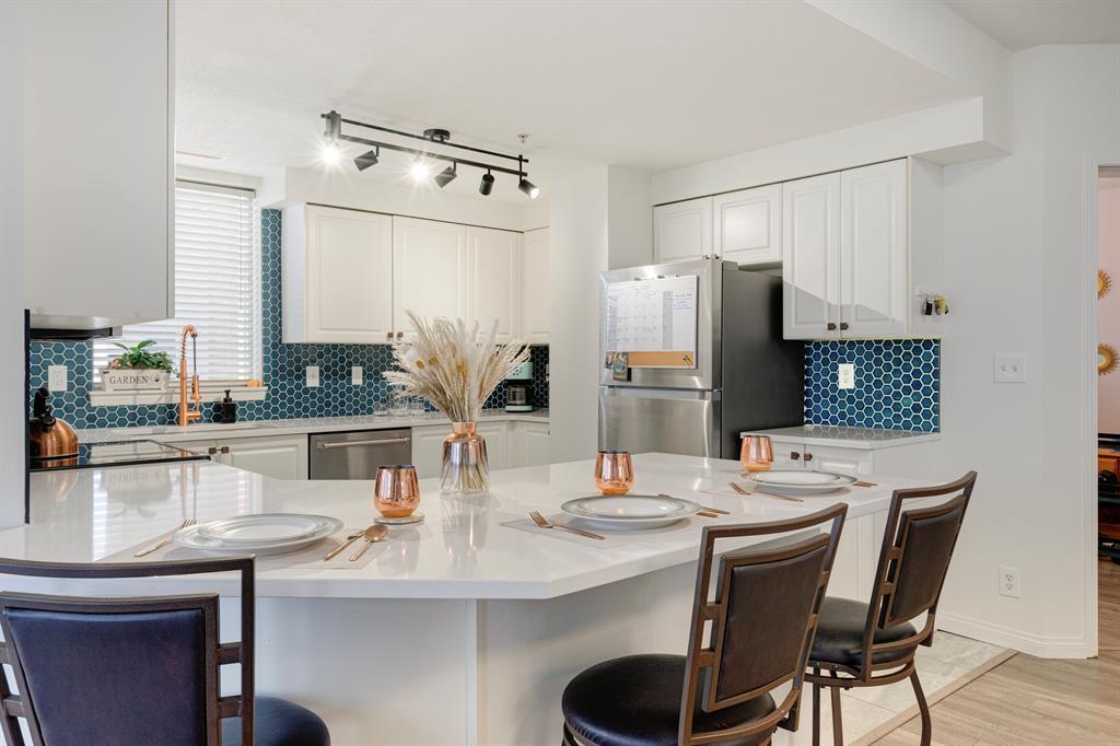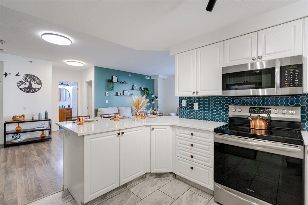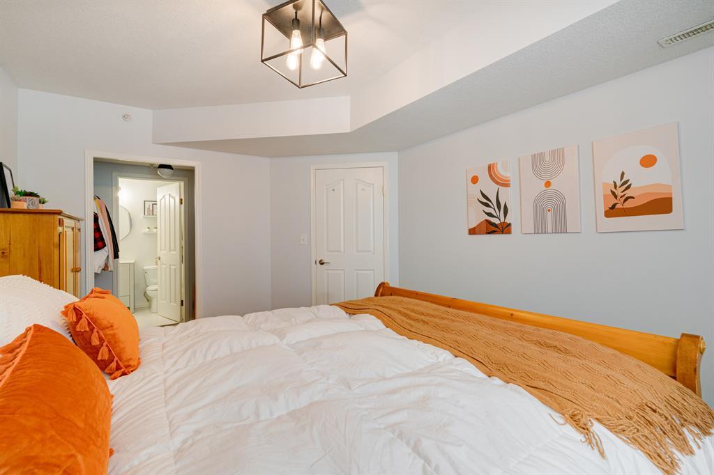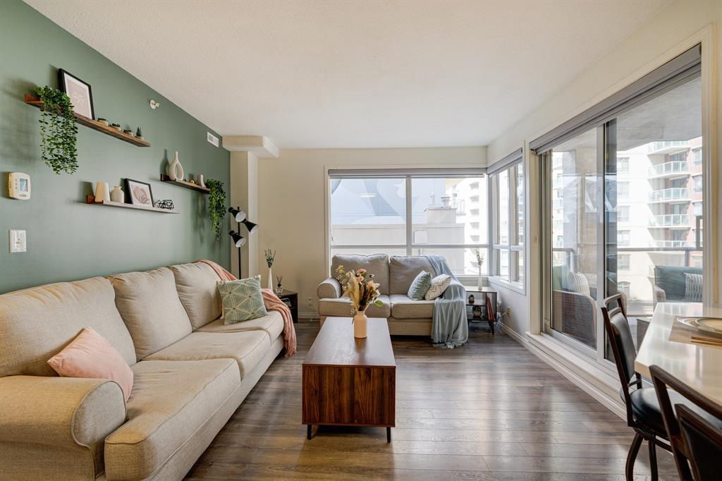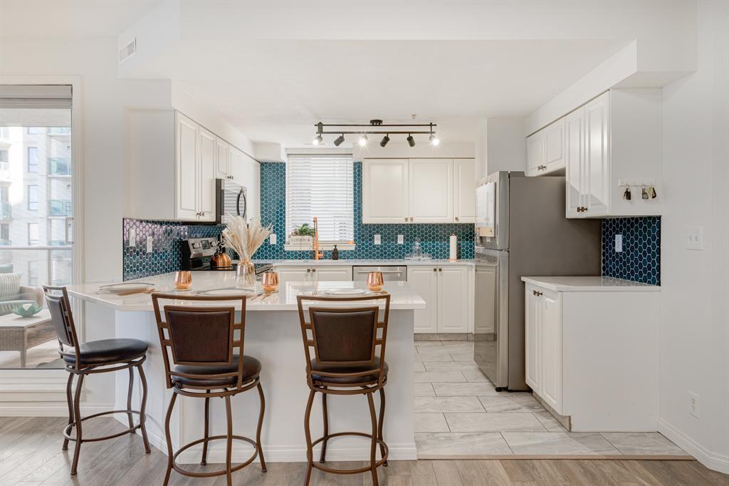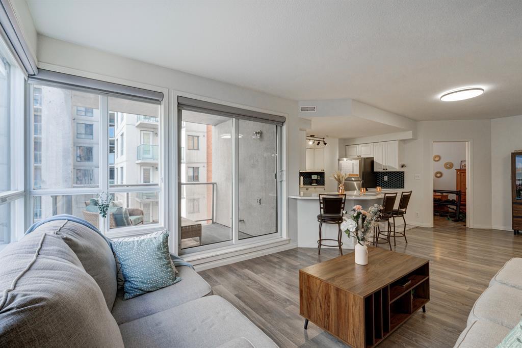 Short Term Rental Friendly building. Welcome to the heart of downtown living, where convenience and vitality collide. Prepare to be amazed by this fully renovated corner unit condo, offering a modern and thoughtfully designed space that exudes perfection in every detail. Step inside and be greeted by a stunning kitchen adorned with a captivating blue hex backsplash imported all the way from New York. The brand-new quartz counters and island, along with the sleek new hardware, add an extra touch of elegance. Every inch of this space shines with a flawless 10/10 rating, thanks to all the amazing upgrades. The open plan in the main living area creates a welcoming atmosphere, while the strategically positioned bedrooms on opposite ends offer privacy and flexibility for guests or roommates. The primary bedroom is a true retreat, featuring a convenient walkthrough closet that leads to a renovated ensuite boasting luxurious marble tile floors, a new vanity, and lighting. The second bedroom is equally spacious and enjoys easy access to the tastefully renovated bathroom just outside its door. Imagine soaking up the warm summer nights on your very own patio, while enjoying the breathtaking views of the downtown skyline. Additional highlights of this exceptional home include brand new motorized blinds in the living area, in-suite storage room and a convenient laundry space. Location-wise, this home couldn't be more ideal. Situated right beside the LRT station within the free fare zone, your daily commute will be a breeze. The picturesque Bow River pathway awaits just a short walk away, providing endless opportunities for outdoor adventures. With amenities right at your doorstep, you'll have everything you need within reach. Immerse yourself in the countless summer festivities and concerts that take place just steps away. Don't miss out on the chance to make this beautiful home your own. (id:22211)