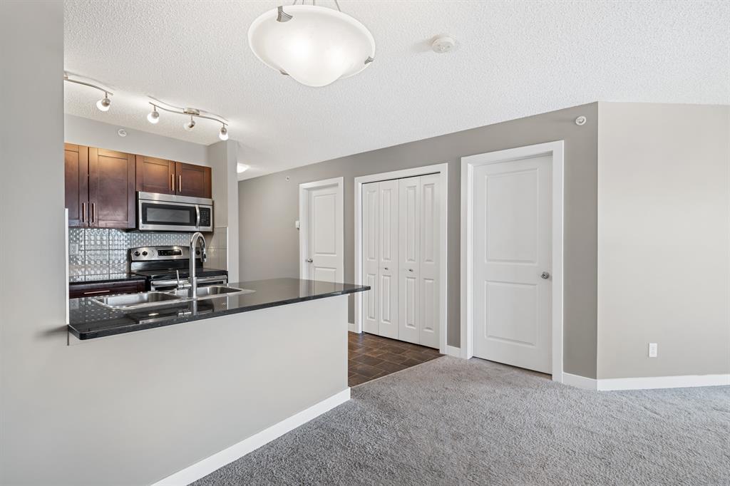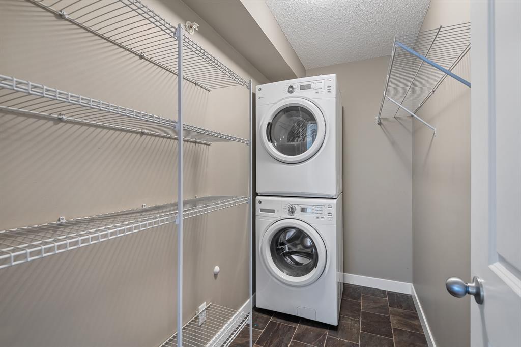 *** NEW PRICE***Larger 930 sq. ft.+ top floor condo with 2 bedrooms and a den with closet. The den is an excellent space for to the home office. The primary bedroom has a walk through closet and a 3 pc. ensuite. The second bedroom is on the other side with the Kitchen, Living and Dining room separating for privacy. The laundry room has full size stacked washer and dryer with shelfs for storage. The is an additional full 4 pc. bath. Larger heated underground parking next to the elevator for convenience. Walk to shopping, medical and restaurants. and buses. Easy access to Fish Creek park and Legacy Green spaces. Quick possession possible. Call your favorite Realtor and view before its gone. (id:22211)