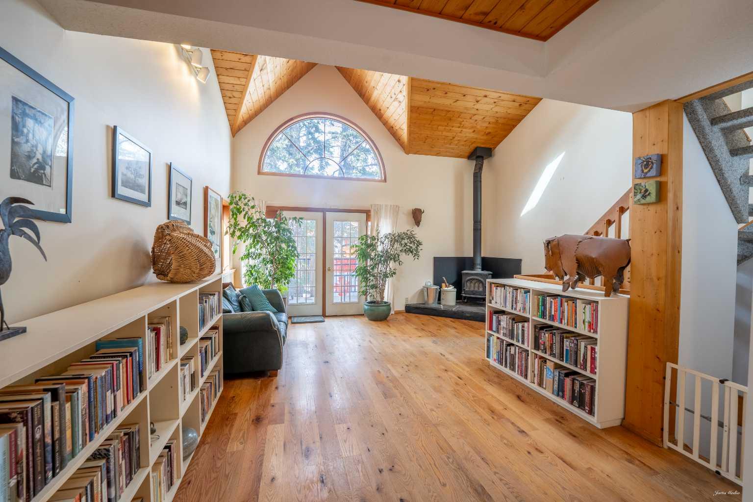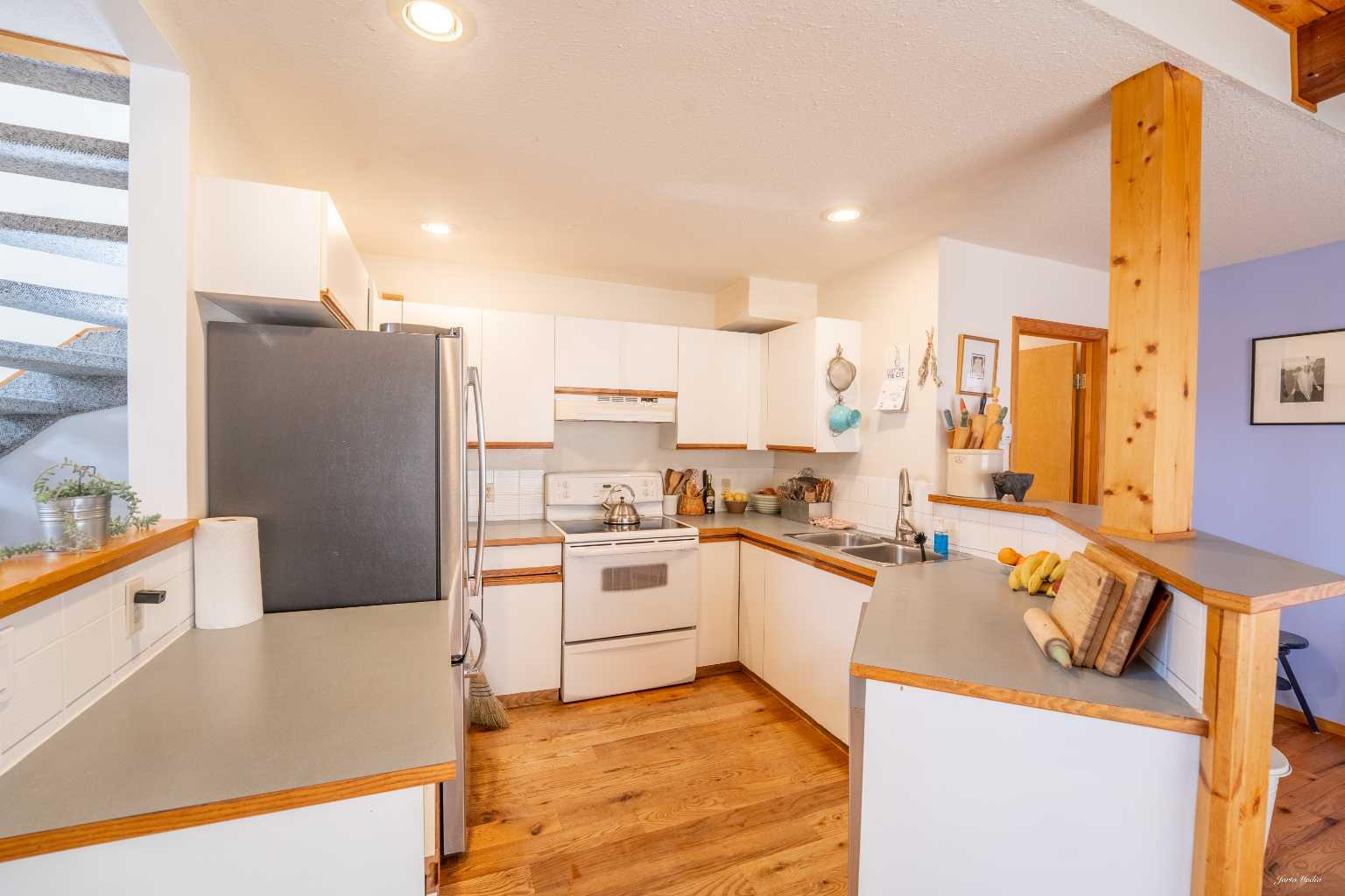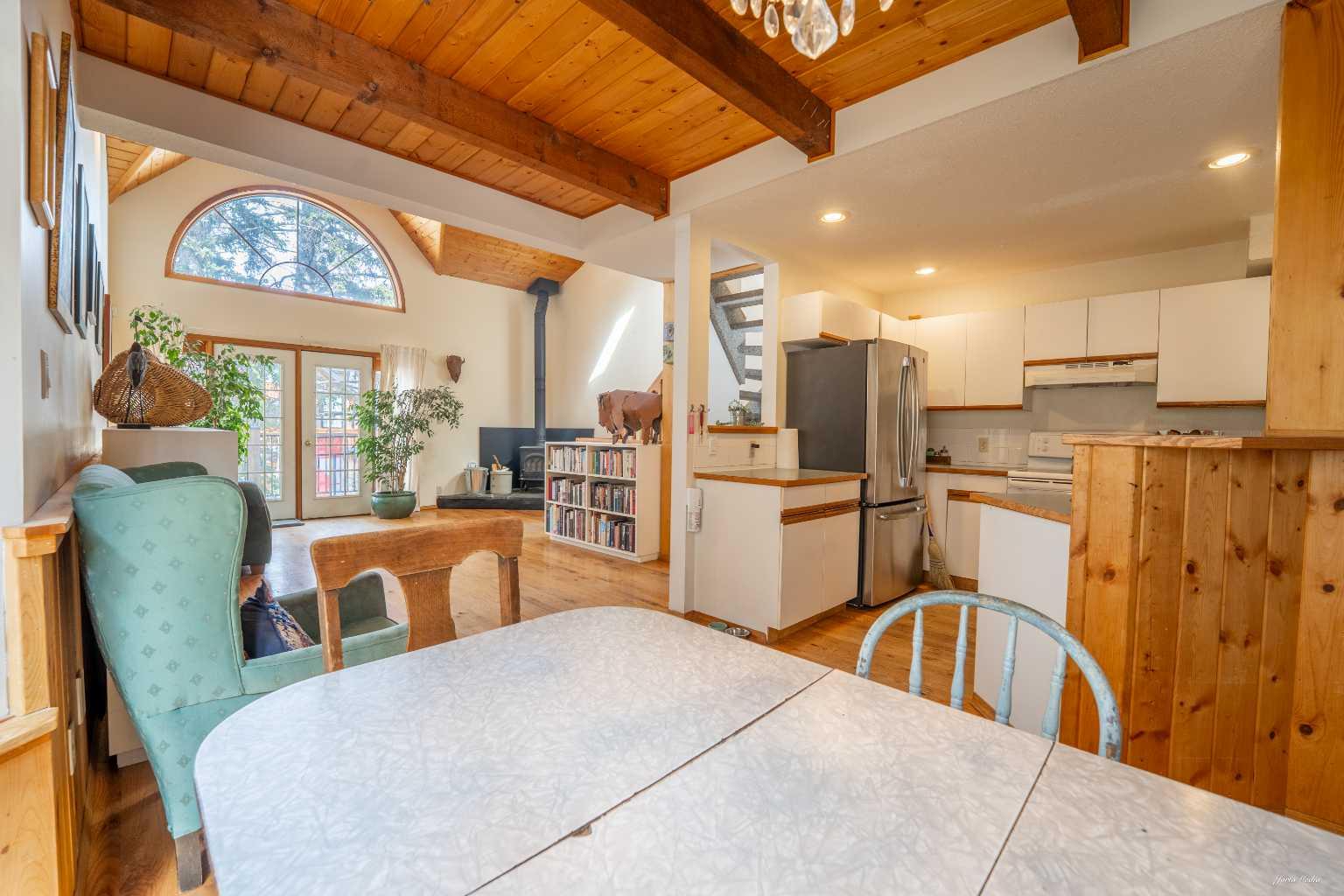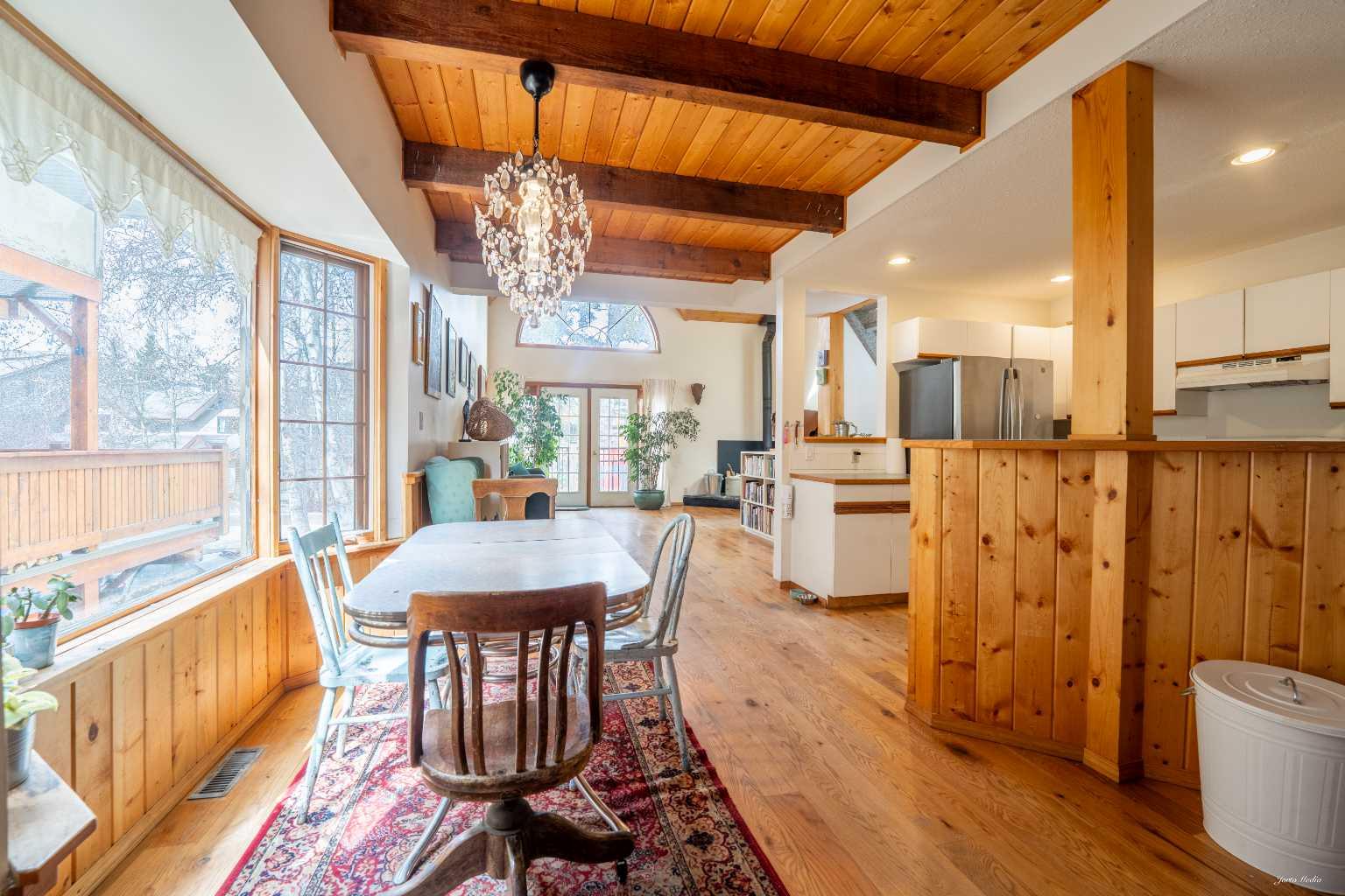 #1 809 5th Street is a charming townhouse that offers three bedrooms and two and a half bathrooms across a thoughtfully designed layout. The main floor features an open-concept kitchen, dining, and living area, highlighted by soaring vaulted pine ceilings and a rustic wood stove that adds warmth (literally) and mountain charm. Step out from the living room onto a spacious deck and take in the stunning mountain views.