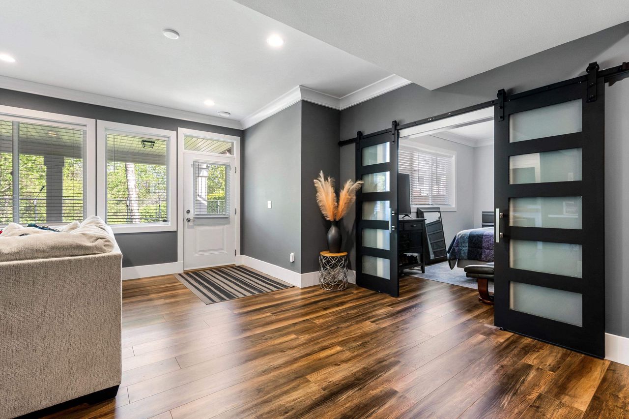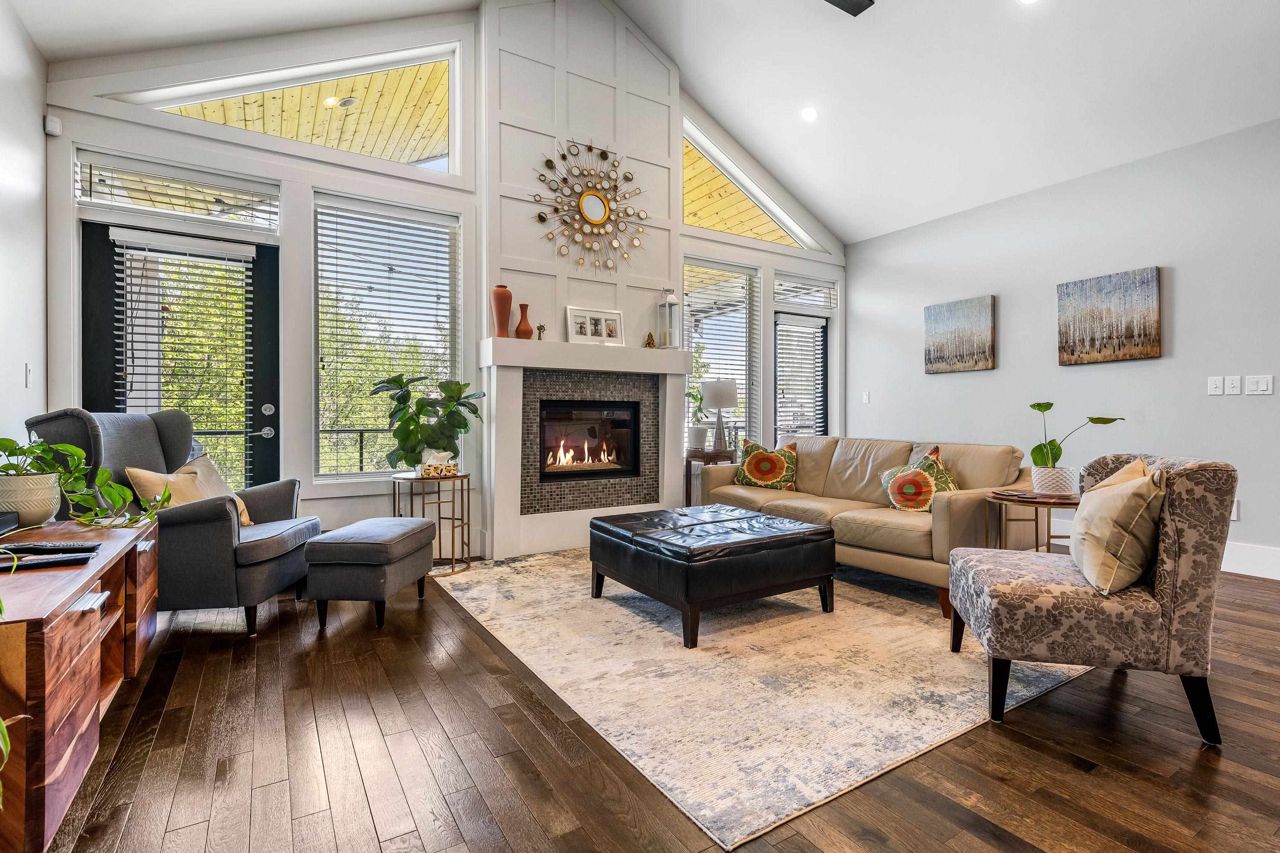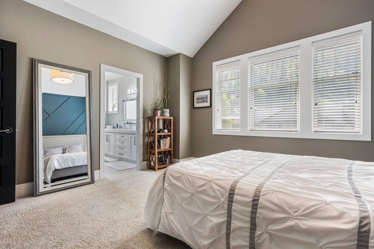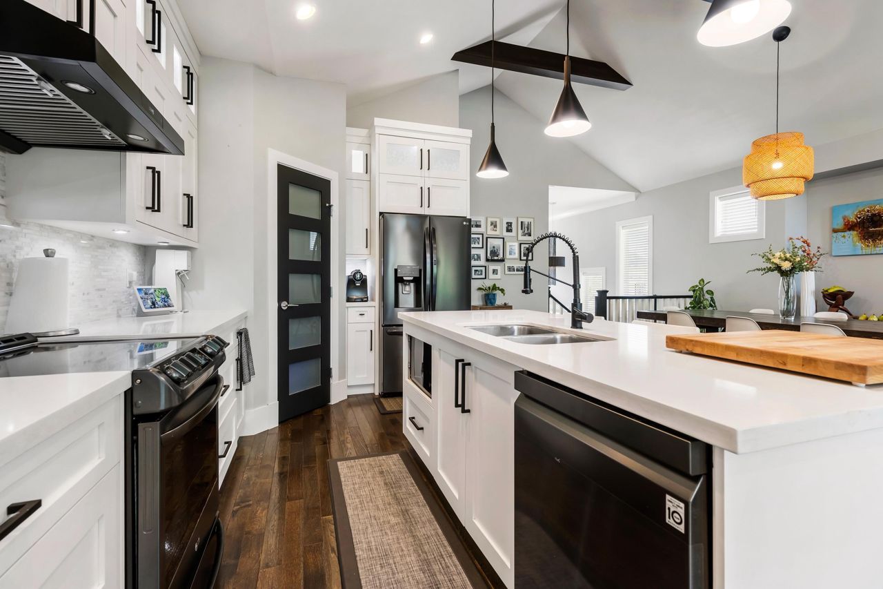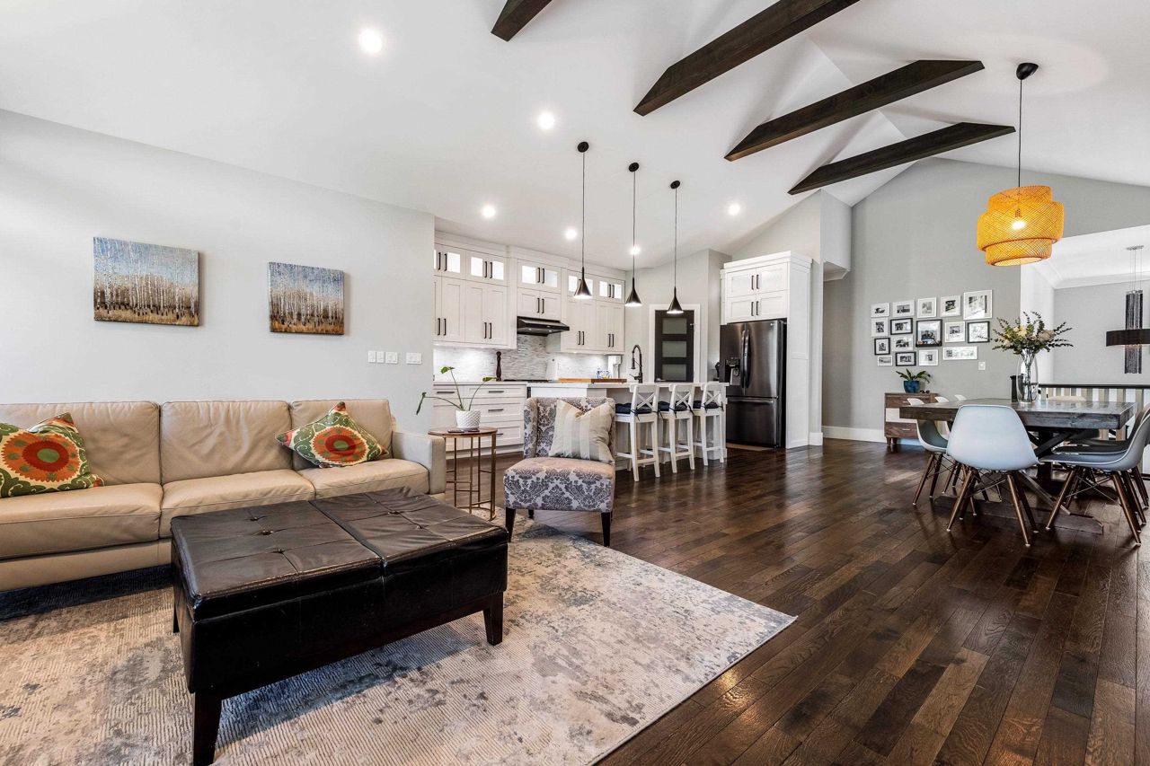 This stunning home boasts a bright, open-concept main floor w/ hardwood flooring, vaulted ceilings w/ exposed beams, & high-end finishes throughout. The kitchen features quartz countertops, soft-close drawers & doors, a lrg island, & a walk-in pantry. The great room offers a cozy gas fireplace & 2 doors leading to a spacious covered deck overlooking the peaceful green space behind the home. The main floor offers 3 bdrms, including a generous primary bdrm complete w/ vaulted ceilings, a lrg walk-in closet, & a 5pc ensuite. The fully finished basement expands the living space w/ a rec room, a laundry room w/ storage & a sink, a full bthrm, & 2 additional bdrms. Outside, you'll find a fully fenced yard w/ a covered patio area & a storage shed. Additional features include A/C & a dbl garage!