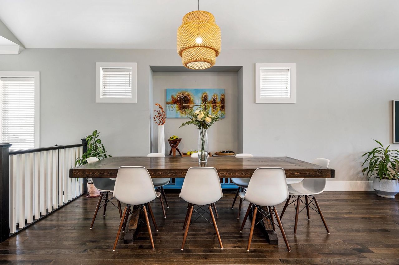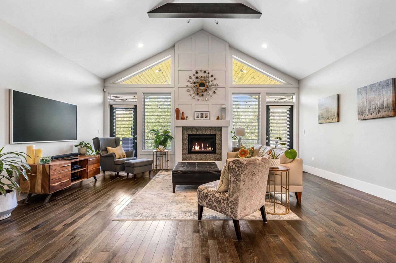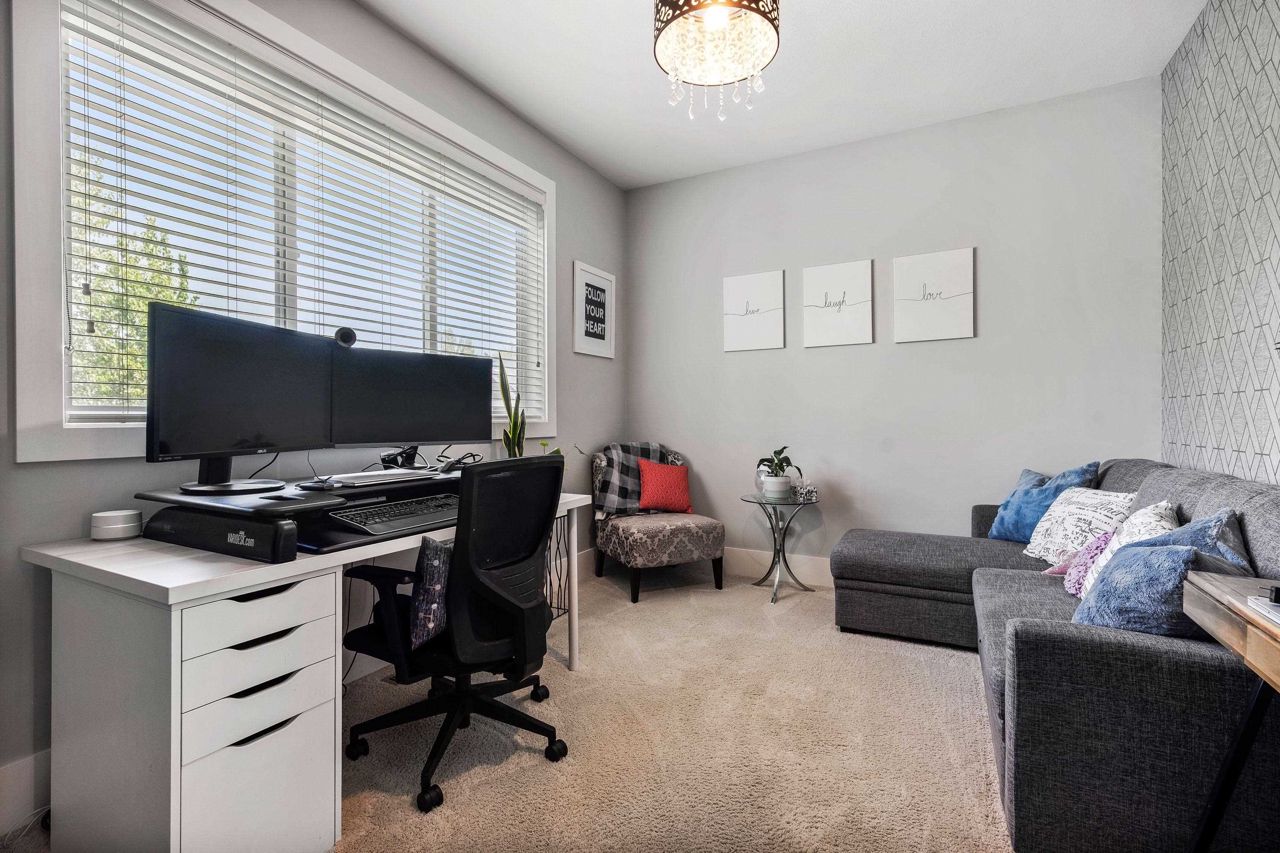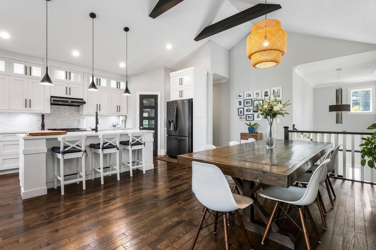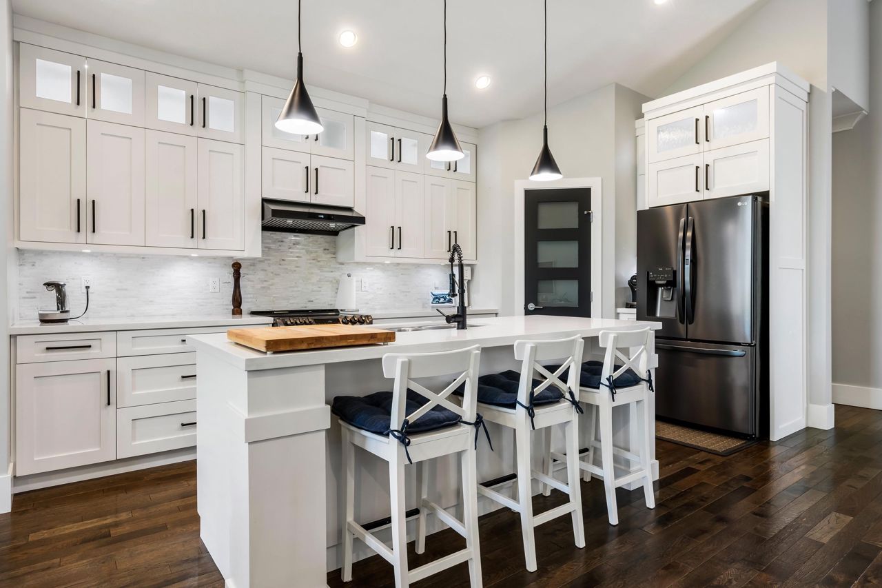 This stunning home boasts a bright, open-concept main floor w/ hardwood flooring, vaulted ceilings w/ exposed beams, & high-end finishes throughout. The kitchen features quartz countertops, soft-close drawers & doors, a lrg island, & a walk-in pantry. The great room offers a cozy gas fireplace & 2 doors leading to a spacious covered deck overlooking the peaceful green space behind the home. The main floor offers 3 bdrms, including a generous primary bdrm complete w/ vaulted ceilings, a lrg walk-in closet, & a 5pc ensuite. The fully finished basement expands the living space w/ a rec room, a laundry room w/ storage & a sink, a full bthrm, & 2 additional bdrms. Outside, you'll find a fully fenced yard w/ a covered patio area & a storage shed. Additional features include A/C & a dbl garage!