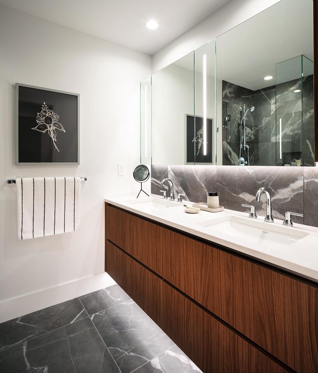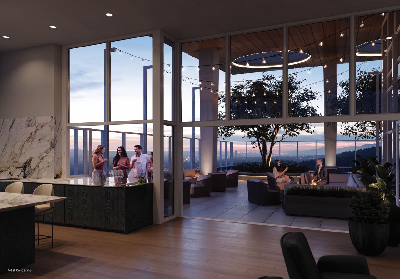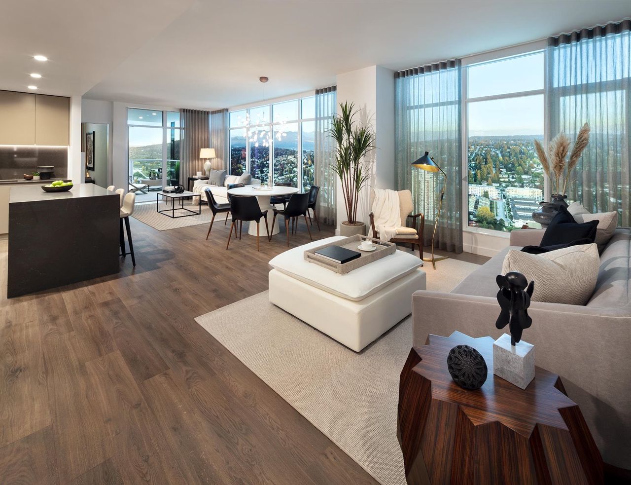 Attention downsizers! Beautiful 3-brm + flex CORNER home with 9-ft ceilings. A/C and open plan w/ bright SW exposure. Chef's kitchen features 6' island with quartz waterfall edge, full-size Fisher & Paykel / Bosch appliances. Wide-plank flooring and flex room ideal for home office. Master brm features custom built-in wardrobe, hotel-inspired ensuite with frameless glass shower and heated tile floors. Lives like resort with +13,000 square feet of indoor amenity space including rooftop lounge, fitness centre, outdoor swimming pool, games room and workshare lounge. Walking distance to shops, restaurants, skytrain and 5-min drive to SFU. Turn-key lifestyle heart of Burquitlam.