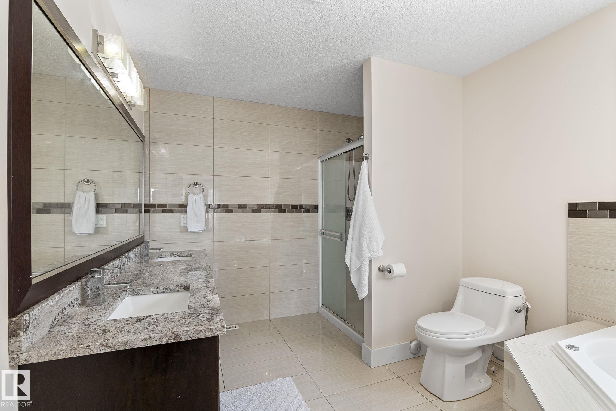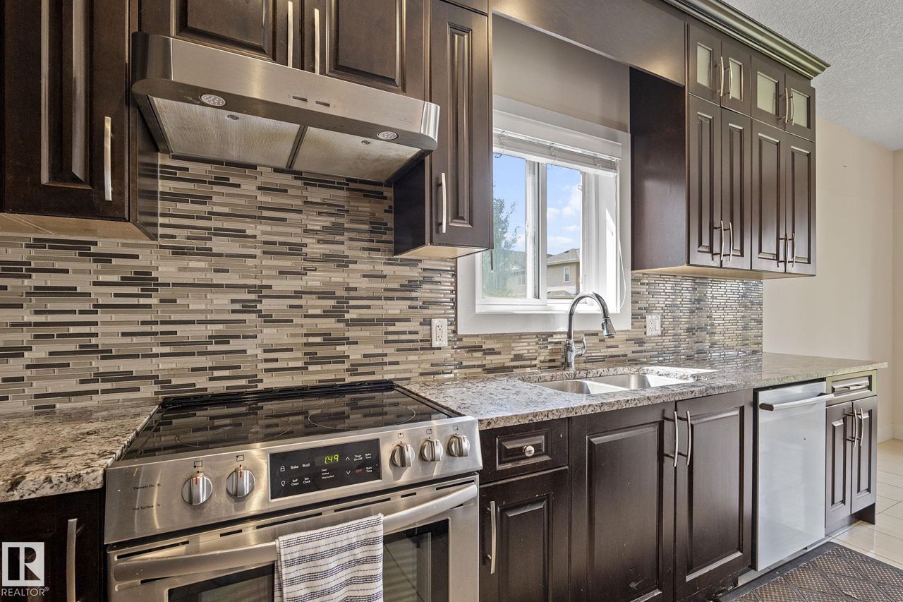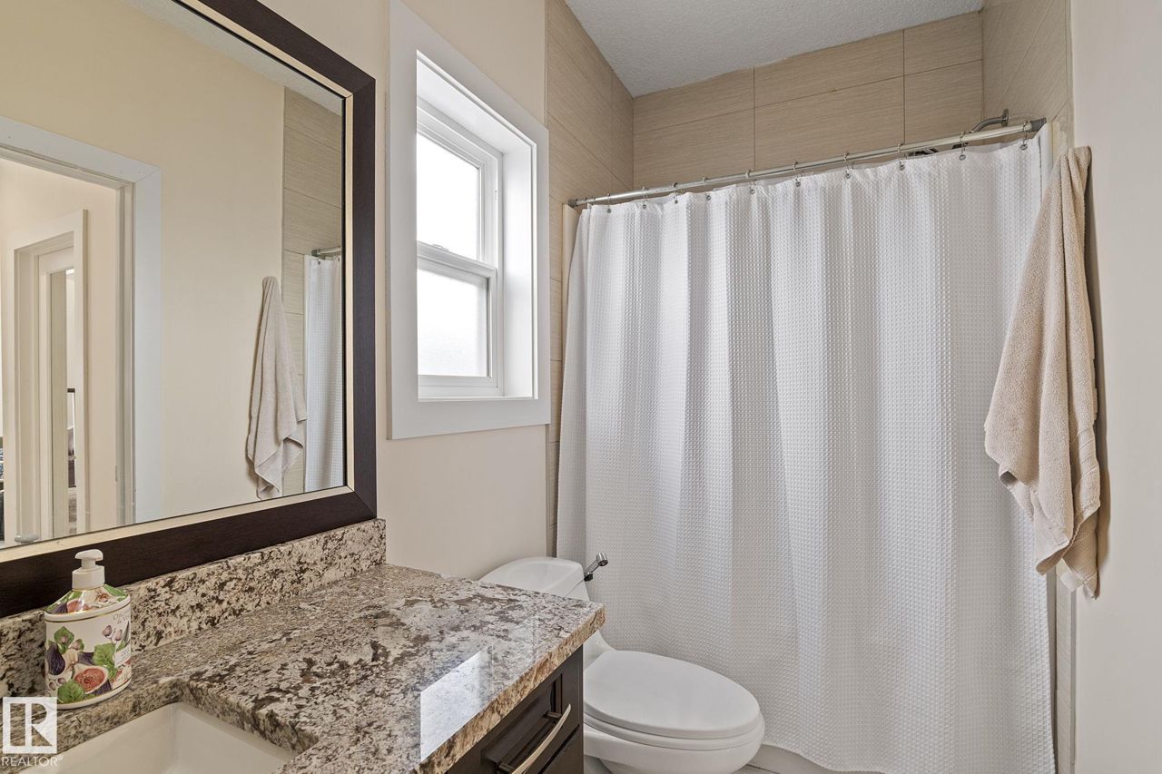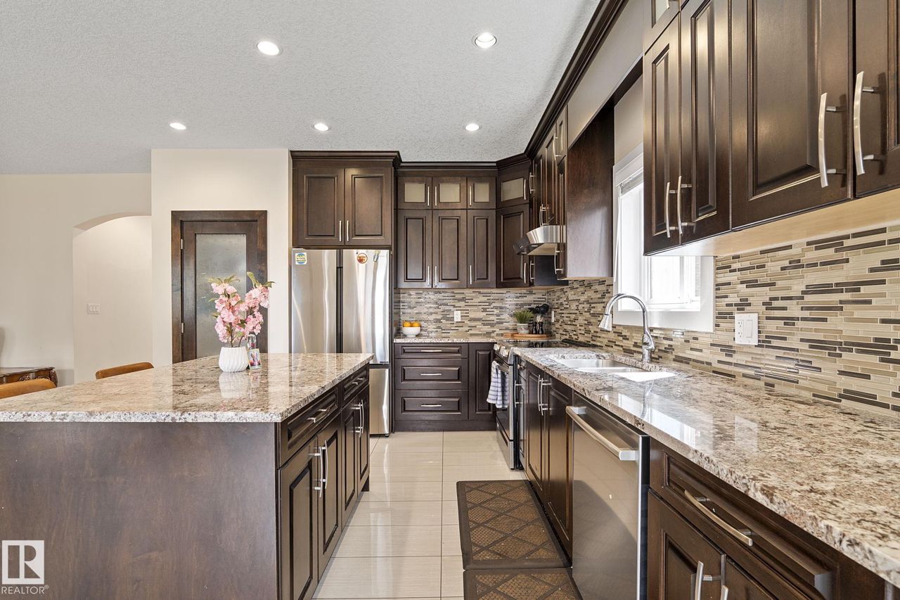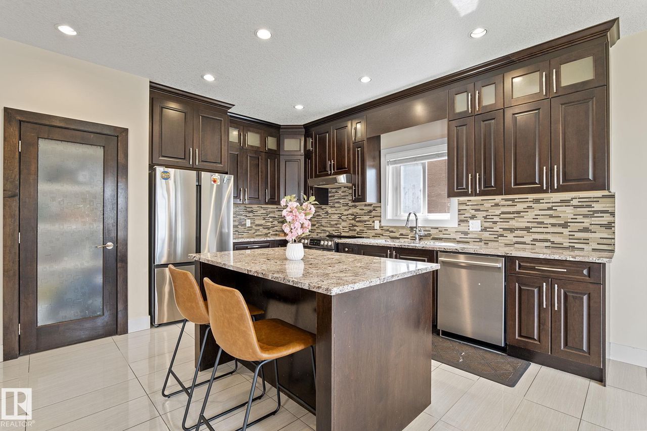 Gorgeous 2600sf 2 storey w/ basement side entrance. 5 BEDROOMS ABOVE GROUND! This beautiful home impresses right as you walk in the front door with soaring 18' ceilings - a full wall of windows & glossy tiles the whole main floor! Open concept at the back of the home with a gorgeous kitchen - dark cabinets, white granite counter & mosaic backsplash, a large granite island with stool seating & newer stainless steel appliances. There's a gas fireplace in the living room & the dining area opens up to the west-facing back yard. Main floor also features a bedroom & full bathroom with tub! There are 4 bedrooms upstairs, 2 full bathrooms, a laundry room & a loft area for an office or play area. The basement is unfinished, but the bathroom is roughed in, 9' ceilings & large windows will make for a great basement or future suite. Good sized yard & great location a block away from a K-6 school & a couple block walk to No Frills.