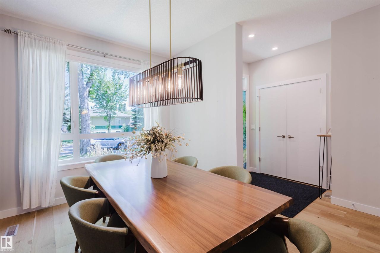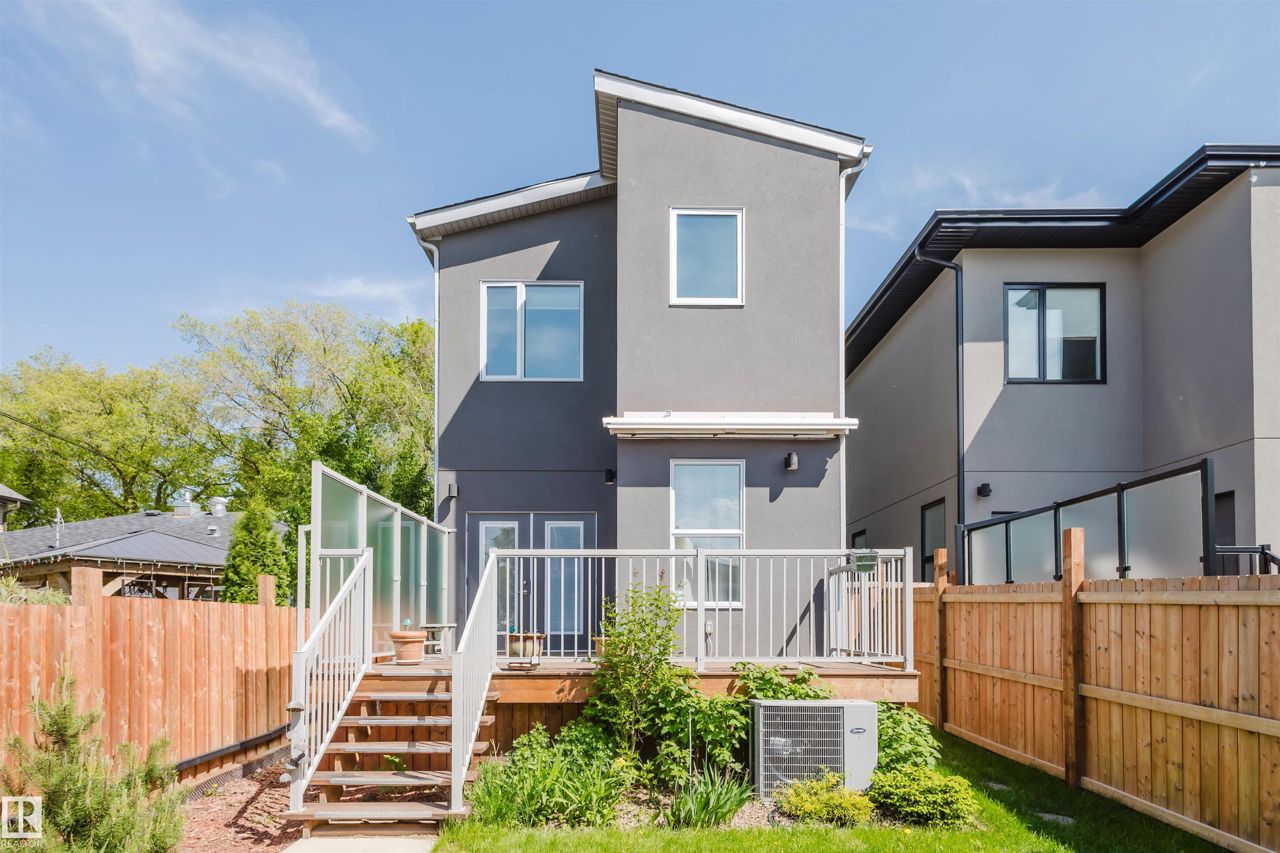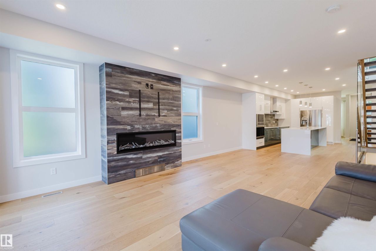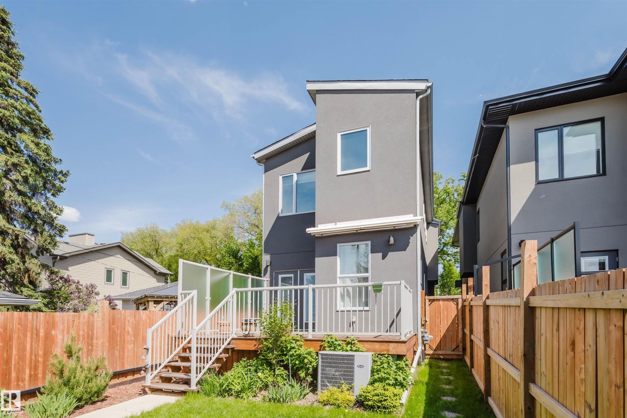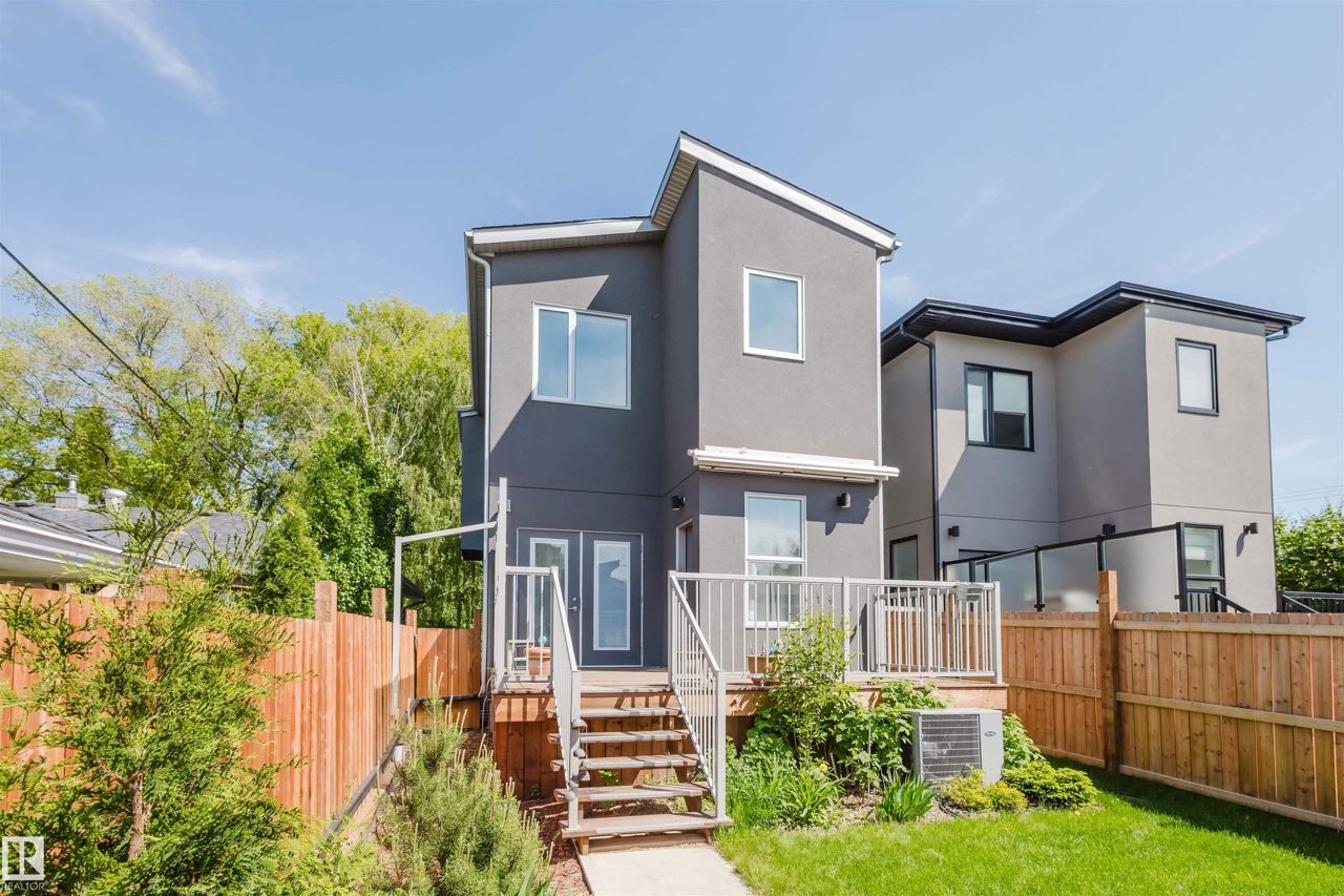 Where timeless design meets everyday ease—this stunning infill in Holyrood offers nearly 3,000 sq ft of finished living space across three stylish levels. Enjoy 9’ ceilings throughout, rough-hewn engineered oak flooring, and a chef-inspired kitchen with quartz waterfall island, induction cooktop, and built-in wall oven. The open-concept layout is anchored by sun-filled living and dining spaces, while the finished basement adds two more bedrooms, a wet bar, and family room. Thoughtful extras include motorized blinds, WiFi thermostat, tankless hot water, central air, and a 50 amp EV charger in the oversized heated garage. The fully landscaped backyard is a private escape with gas BBQ hookup, mature trees, and a remote-controlled motorized retractable awning that extends shade on demand. Just steps to the new LRT, river valley, parks, and minutes to downtown—this is upscale, walkable living in one of Edmonton’s most established and desirable neighbourhoods.