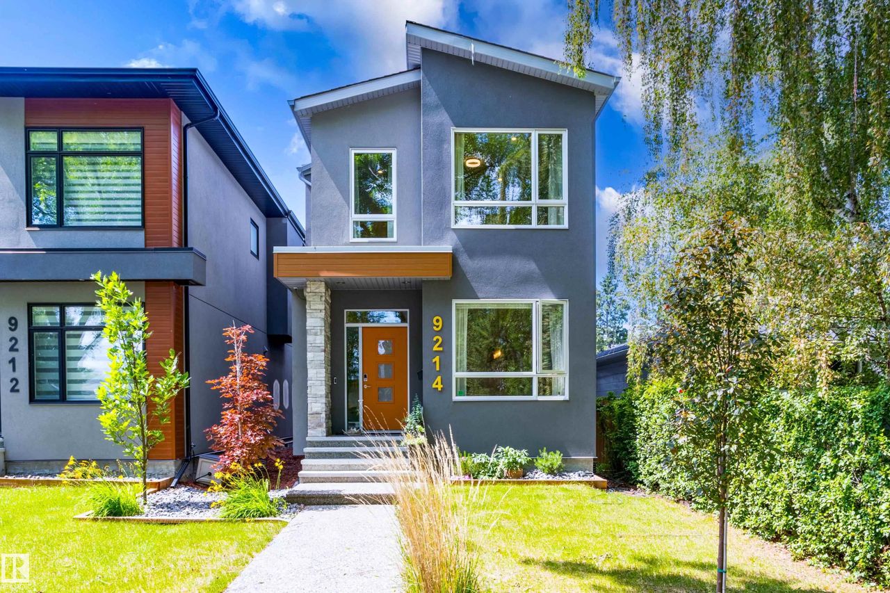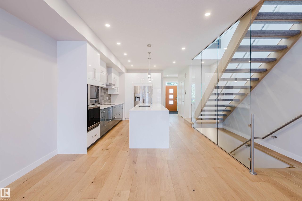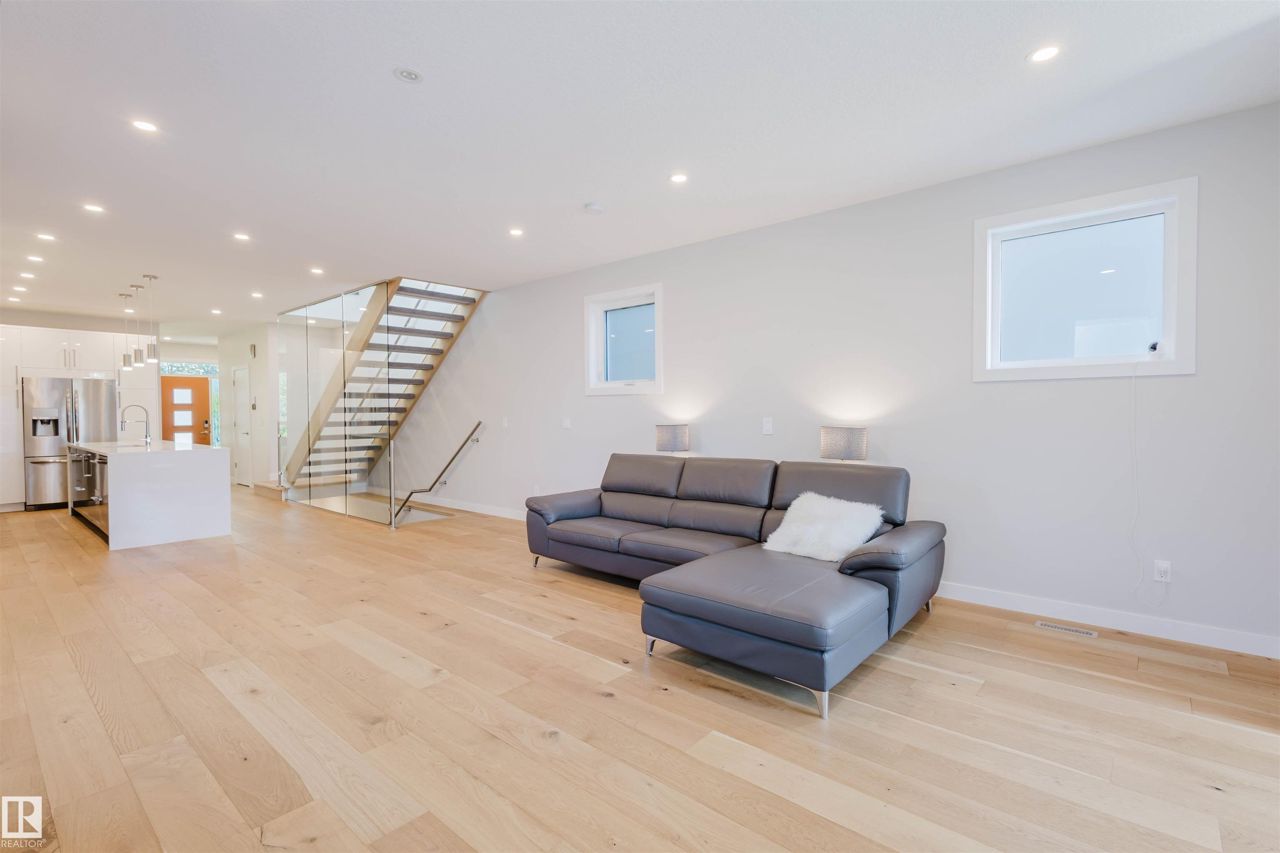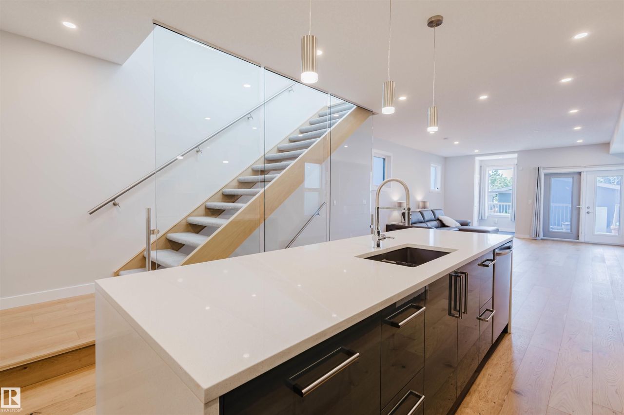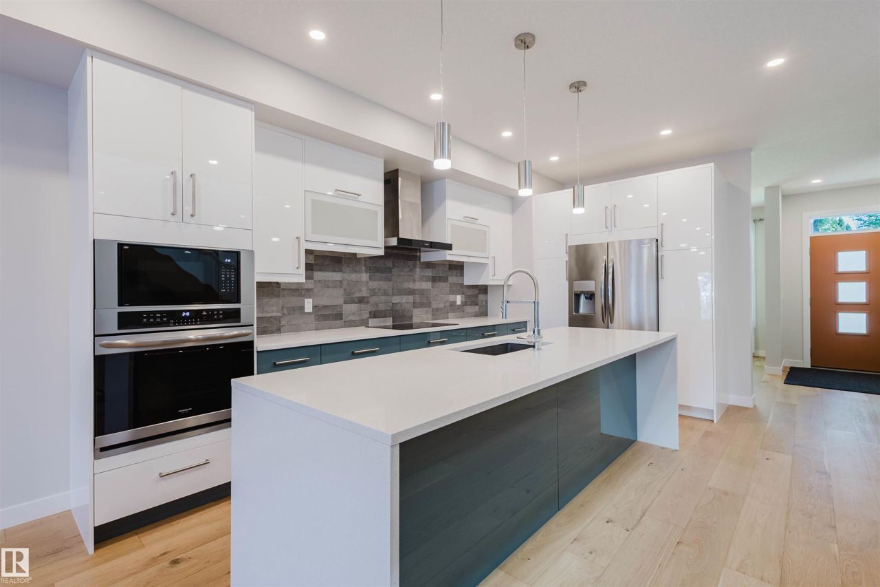 Where timeless design meets everyday ease—this stunning infill in Holyrood offers nearly 3,000 sq ft of finished living space across three stylish levels. Enjoy 9’ ceilings throughout, rough-hewn engineered oak flooring, and a chef-inspired kitchen with quartz waterfall island, induction cooktop, and built-in wall oven. The open-concept layout is anchored by sun-filled living and dining spaces, while the finished basement adds two more bedrooms, a wet bar, and family room. Thoughtful extras include motorized blinds, WiFi thermostat, tankless hot water, central air, and a 50 amp EV charger in the oversized heated garage. The fully landscaped backyard is a private escape with gas BBQ hookup, mature trees, and a remote-controlled motorized retractable awning that extends shade on demand. Just steps to the new LRT, river valley, parks, and minutes to downtown—this is upscale, walkable living in one of Edmonton’s most established and desirable neighbourhoods.