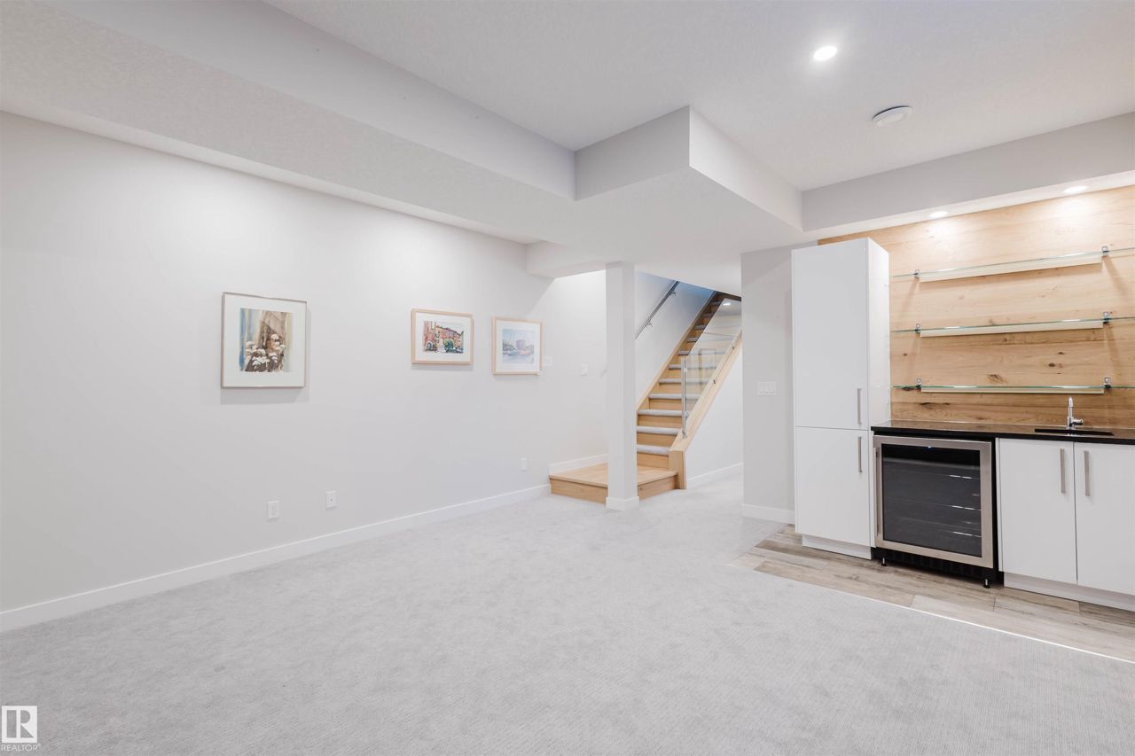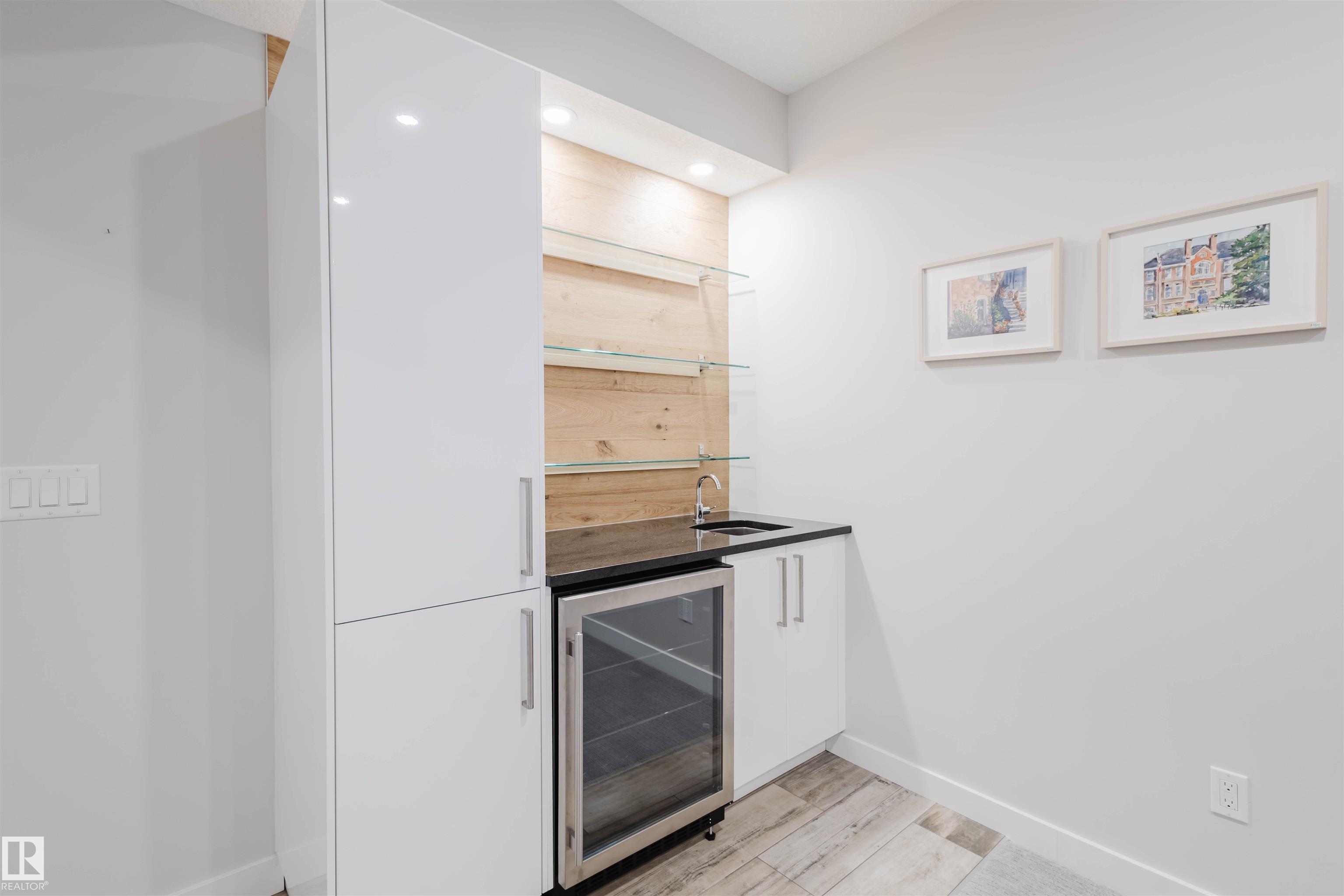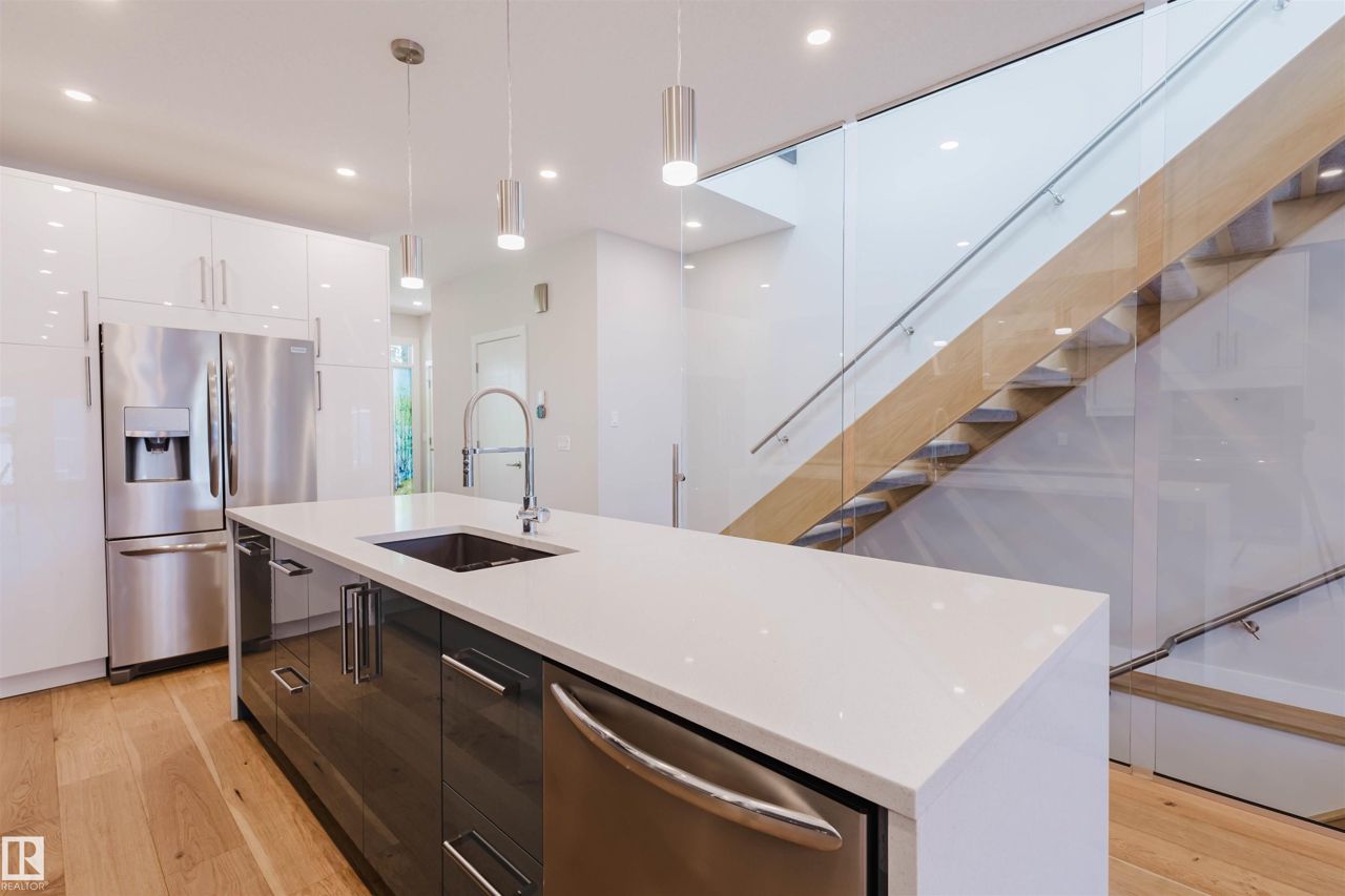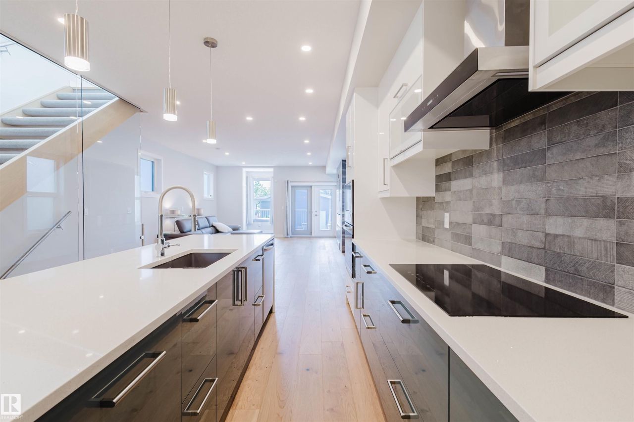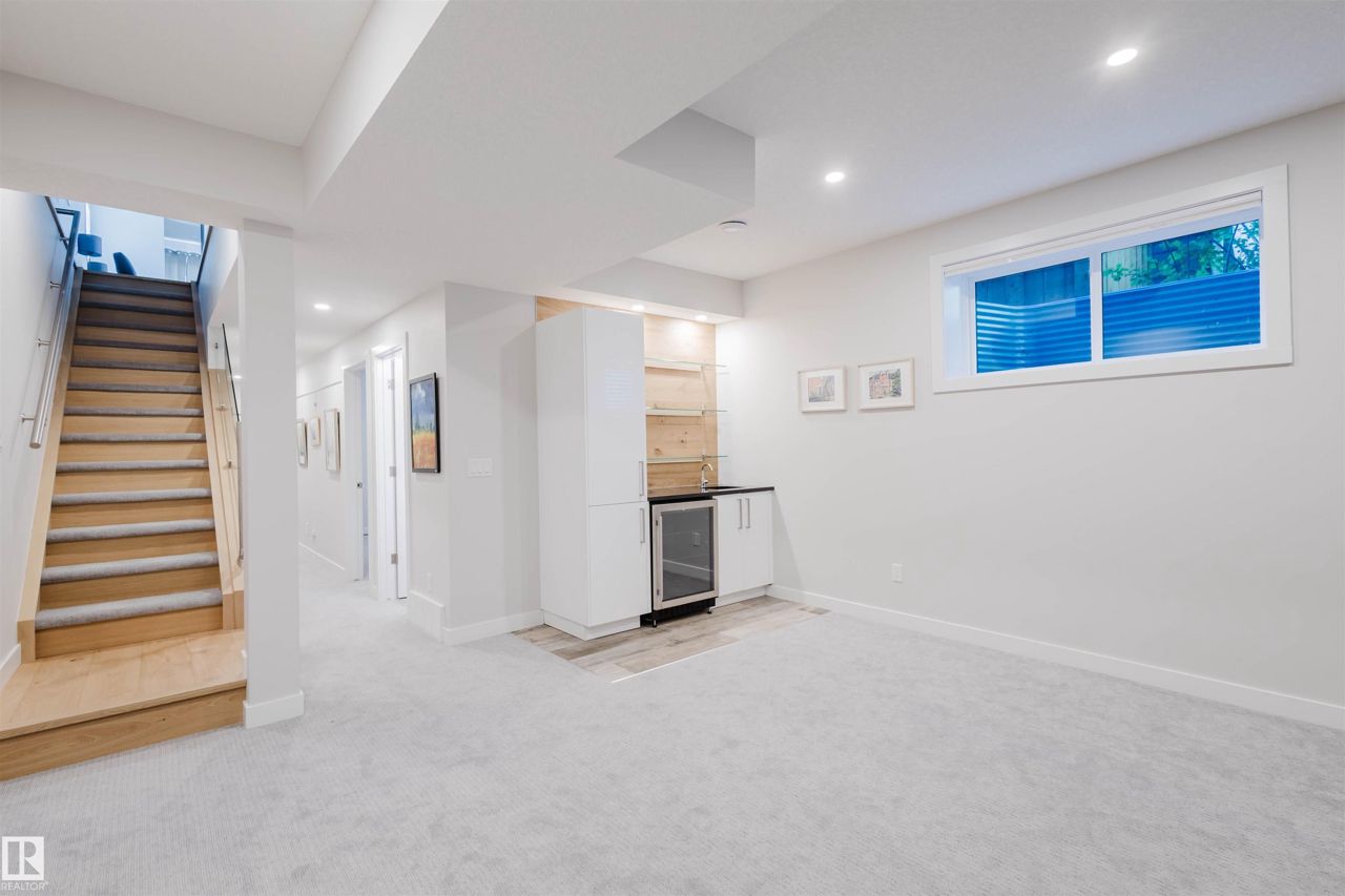 Where timeless design meets everyday ease—this stunning infill in Holyrood offers nearly 3,000 sq ft of finished living space across three stylish levels. Enjoy 9’ ceilings throughout, rough-hewn engineered oak flooring, and a chef-inspired kitchen with quartz waterfall island, induction cooktop, and built-in wall oven. The open-concept layout is anchored by sun-filled living and dining spaces, while the finished basement adds two more bedrooms, a wet bar, and family room. Thoughtful extras include motorized blinds, WiFi thermostat, tankless hot water, central air, and a 50 amp EV charger in the oversized heated garage. The fully landscaped backyard is a private escape with gas BBQ hookup, mature trees, and a remote-controlled motorized retractable awning that extends shade on demand. Just steps to the new LRT, river valley, parks, and minutes to downtown—this is upscale, walkable living in one of Edmonton’s most established and desirable neighbourhoods.