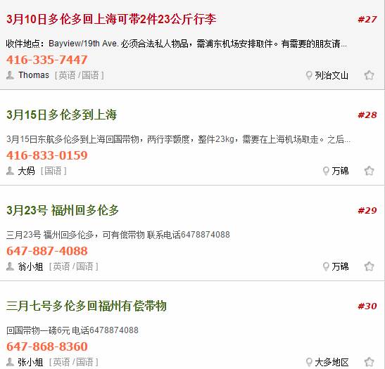 加國無憂 黃頁上“回國帶物” 裏很多私人帶物的信息