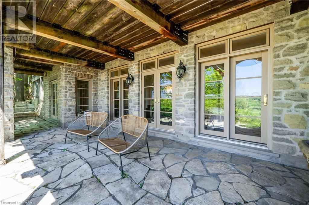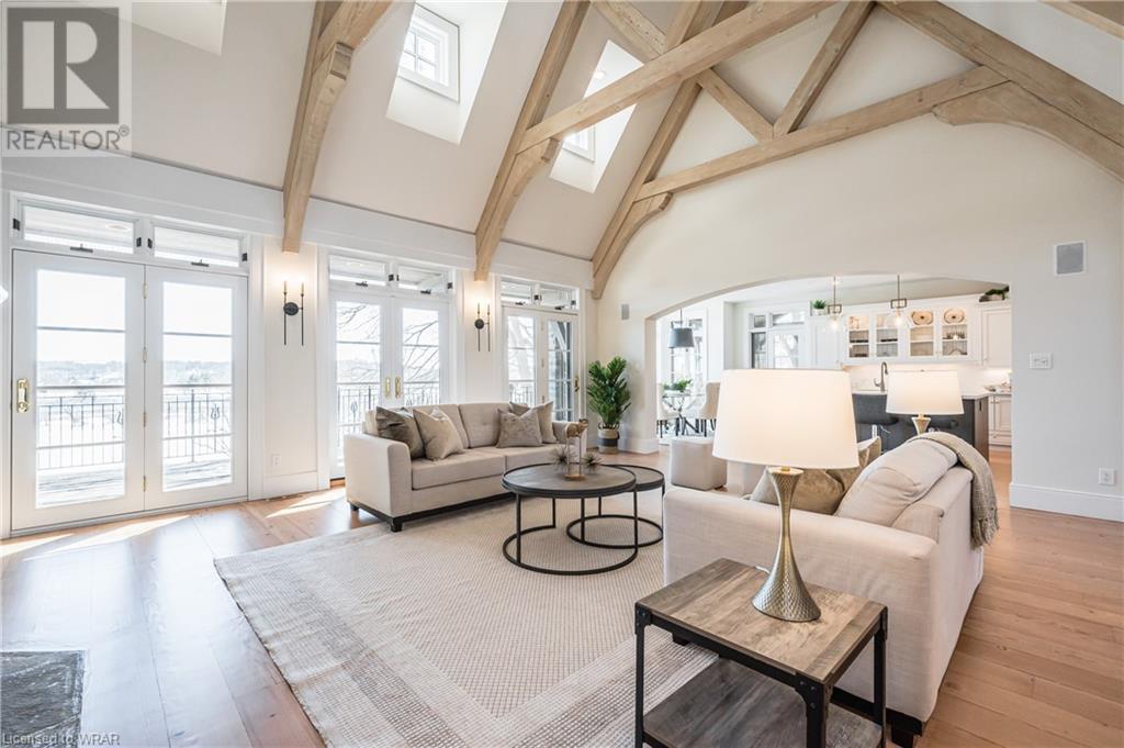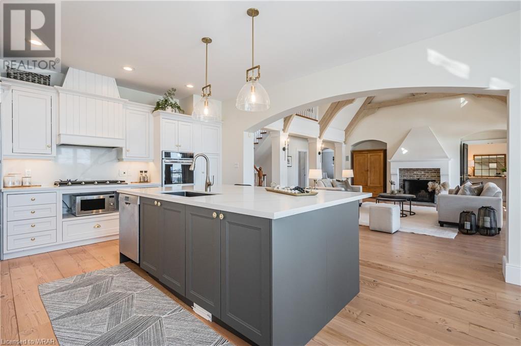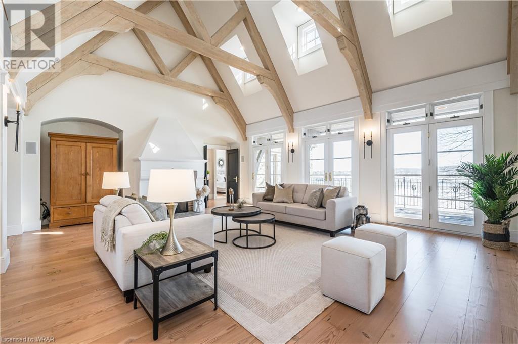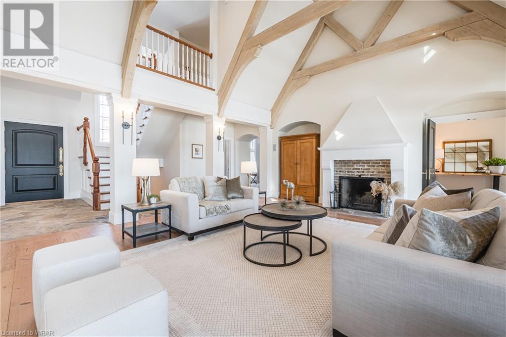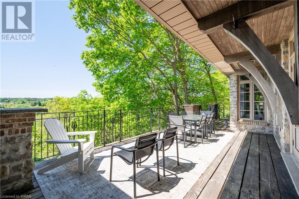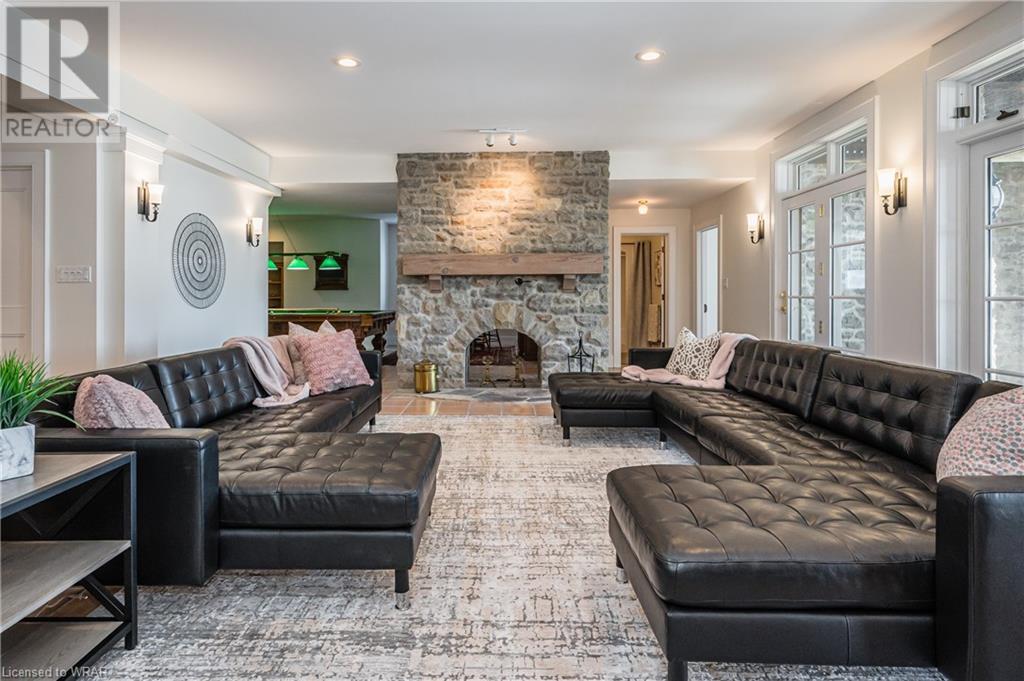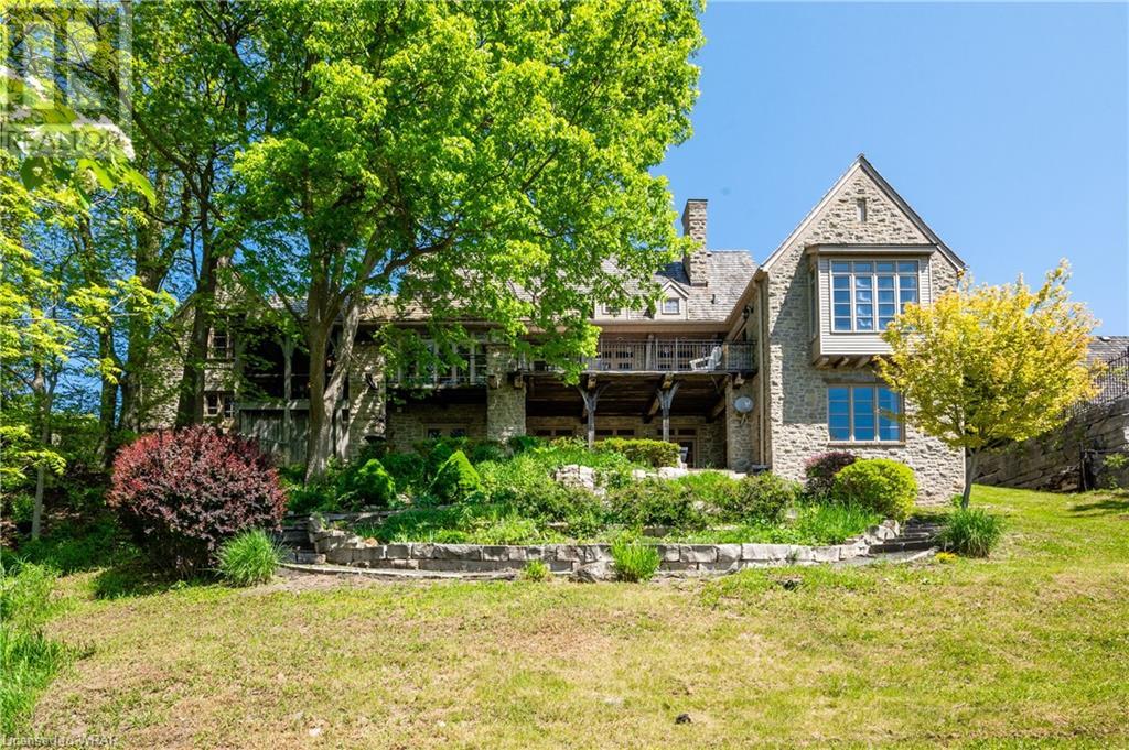 Timeless elegance with a view in Kitchener’s highly coveted Hidden Valley neighbourhood! Welcome to Lumiere, an architectural, award-winning masterpiece that is truly one of a kind. Experience carefully curated scale and materiality with over 6,800 square feet of French country inspired design - made possible through the creative collaboration of Roth-Knibb Architects and builder Christiaan Wingelaar. From the exterior composition of fieldstone, brick arches, cedar shakes and exposed timber beams to the interior custom millwork, subdued coffered ceiling and intricate trusses, it is evident that this house is highly deserving of its “Best of Houzz” award designated in 2013. Upon entry, you are met with an open style foyer with custom stone walkway that connects the dining, great and family rooms. The breathtaking great room blurs the line between strength and beauty and is proportioned for both fireplace intimacy and mighty scale with its double high vaulted ceilings and functional curved trusses centred around the narrowing mantle. The series of French doors and high south facing windows overlooking the Grand River and wrought iron terrace, flood in natural lighting and give the space a genuine warmth. Through the rectangular archway, you find an open concept kitchen with walk-in pantry, large island with seating and dinette surrounded by oversized casement windows. Off of the kitchen, there is access to the laundry room, butler’s pantry and screened in porch for your outdoor enjoyment. Conveniently located on the main floor is the primary suite equipped with terrace walk-out and 5-piece ensuite with soaker tub and glass shower. The second level hosts 2 bedrooms, 4-piece bath and spacious den, while the lower-level with walkout grants additional entertainment space in the rec-room and games area. Backing onto picturesque views of the Grand River and Deer Ridge golf course, this home emanates exclusivity, sophistication and is awaiting you to call it your dream home! (id:22211)