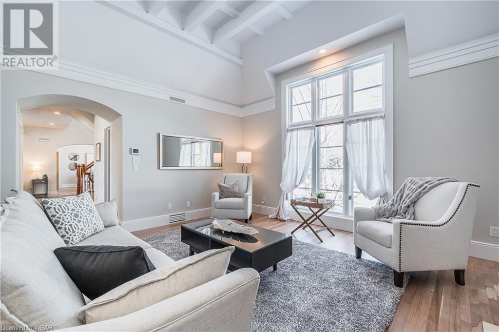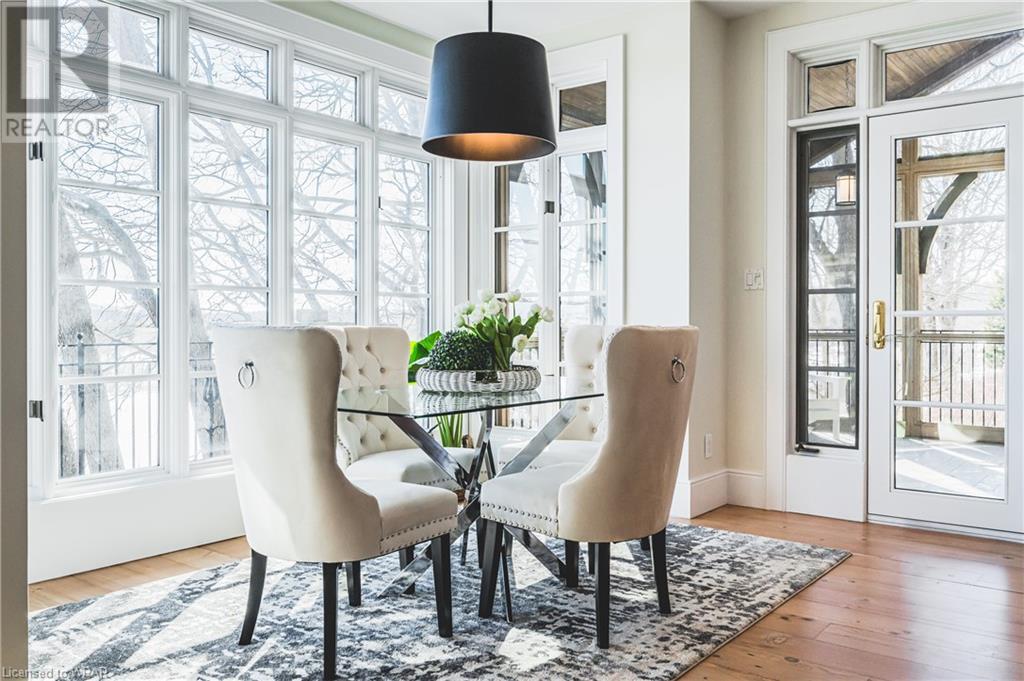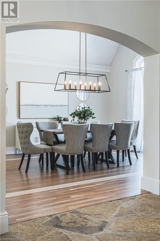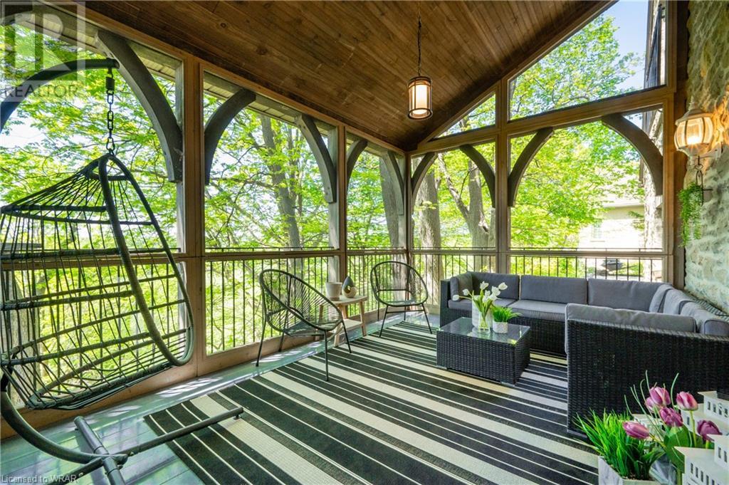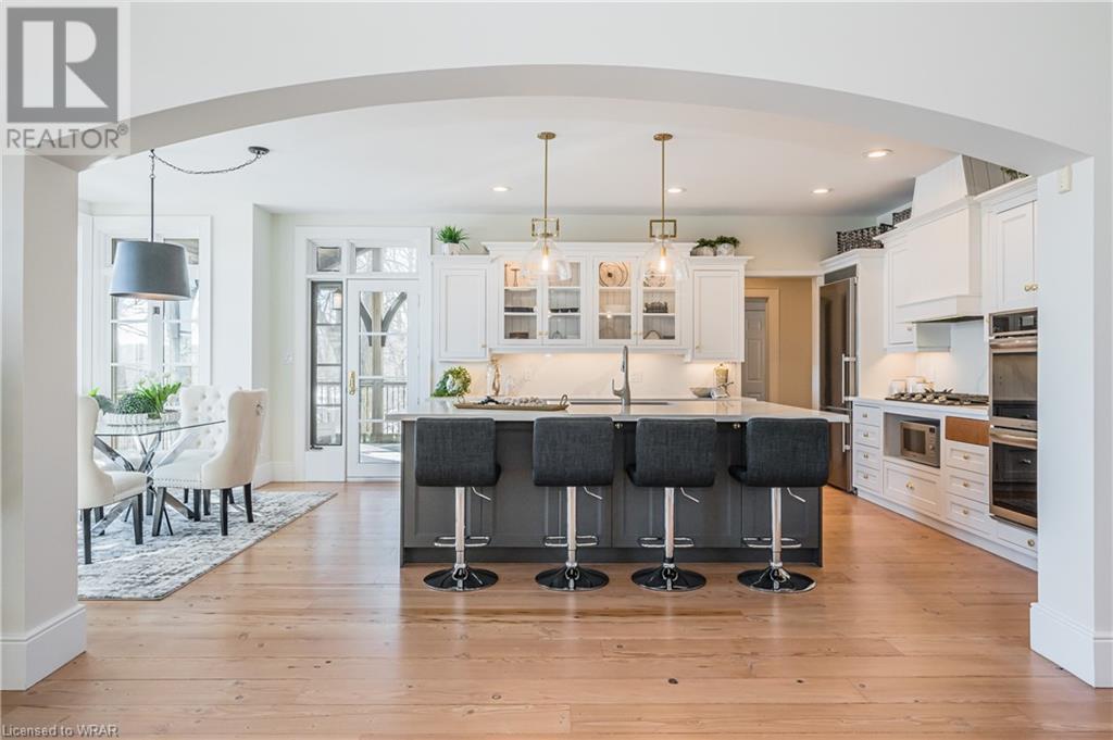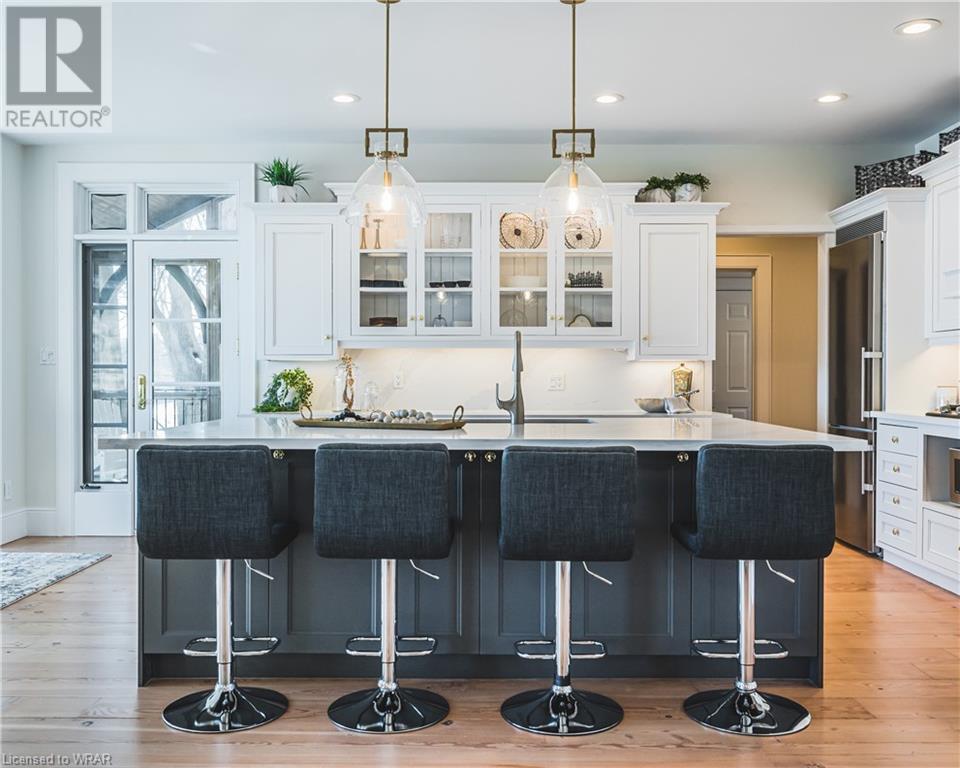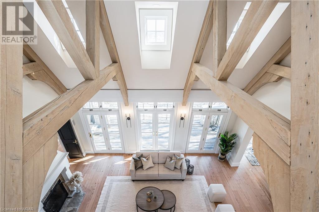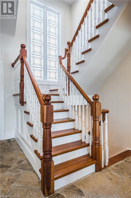 Timeless elegance with a view in Kitchener’s highly coveted Hidden Valley neighbourhood! Welcome to Lumiere, an architectural, award-winning masterpiece that is truly one of a kind. Experience carefully curated scale and materiality with over 6,800 square feet of French country inspired design - made possible through the creative collaboration of Roth-Knibb Architects and builder Christiaan Wingelaar. From the exterior composition of fieldstone, brick arches, cedar shakes and exposed timber beams to the interior custom millwork, subdued coffered ceiling and intricate trusses, it is evident that this house is highly deserving of its “Best of Houzz” award designated in 2013. Upon entry, you are met with an open style foyer with custom stone walkway that connects the dining, great and family rooms. The breathtaking great room blurs the line between strength and beauty and is proportioned for both fireplace intimacy and mighty scale with its double high vaulted ceilings and functional curved trusses centred around the narrowing mantle. The series of French doors and high south facing windows overlooking the Grand River and wrought iron terrace, flood in natural lighting and give the space a genuine warmth. Through the rectangular archway, you find an open concept kitchen with walk-in pantry, large island with seating and dinette surrounded by oversized casement windows. Off of the kitchen, there is access to the laundry room, butler’s pantry and screened in porch for your outdoor enjoyment. Conveniently located on the main floor is the primary suite equipped with terrace walk-out and 5-piece ensuite with soaker tub and glass shower. The second level hosts 2 bedrooms, 4-piece bath and spacious den, while the lower-level with walkout grants additional entertainment space in the rec-room and games area. Backing onto picturesque views of the Grand River and Deer Ridge golf course, this home emanates exclusivity, sophistication and is awaiting you to call it your dream home! (id:22211)