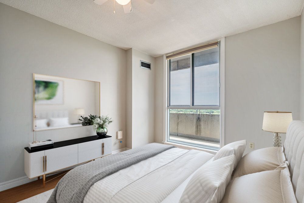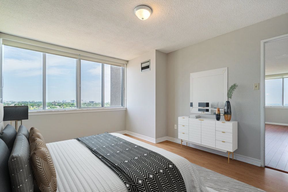 Rarely Offered Corner Penthouse With Panoramic City Views! Step Out To An Oversized Balcony From Dining Room & Kitchen, Plus An Additional Year-Round Sunroom. Spacious Front Foyer W/Double Closets, All Around Oversized Floor To Ceiling Windows Attributing To Sun-Flooded Rooms. Separate Living & Dining Rooms, Eat-In Kitchen W/ Breakfast. Large Primary Suite W/ Walk In Closet & Separate Ensuite. Second Bedroom W/Double Closet. Sizable Den Or Potential 3rd Bedroom. Separate Laundry Room W/ Built In Shelving. Located In Proximity To Public Transit, Plazas, Sq1, Schools, Dog Parks & Walking Trails. Access Multiple Highways In Minutes!Utilities All Inclusive In Fee. Tennis, Sauna, Exercise, 1 Underground Parking & 1 Large Locker.